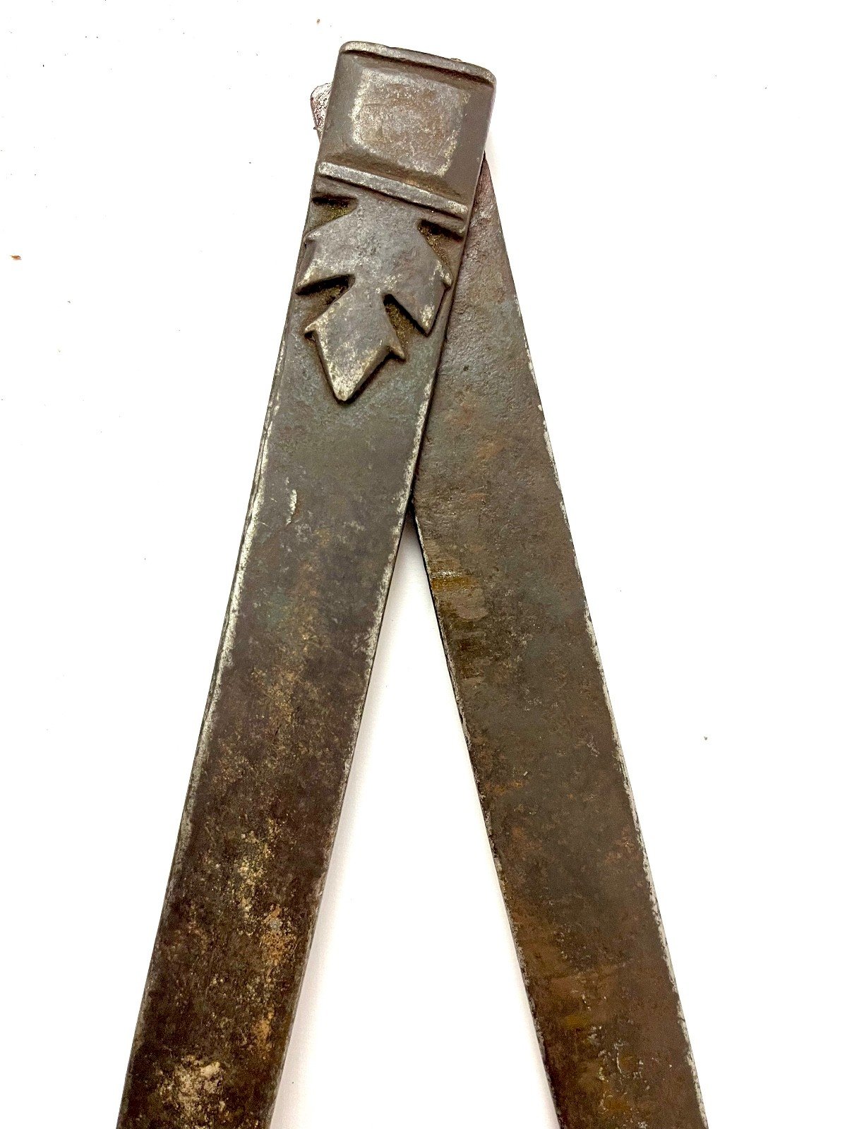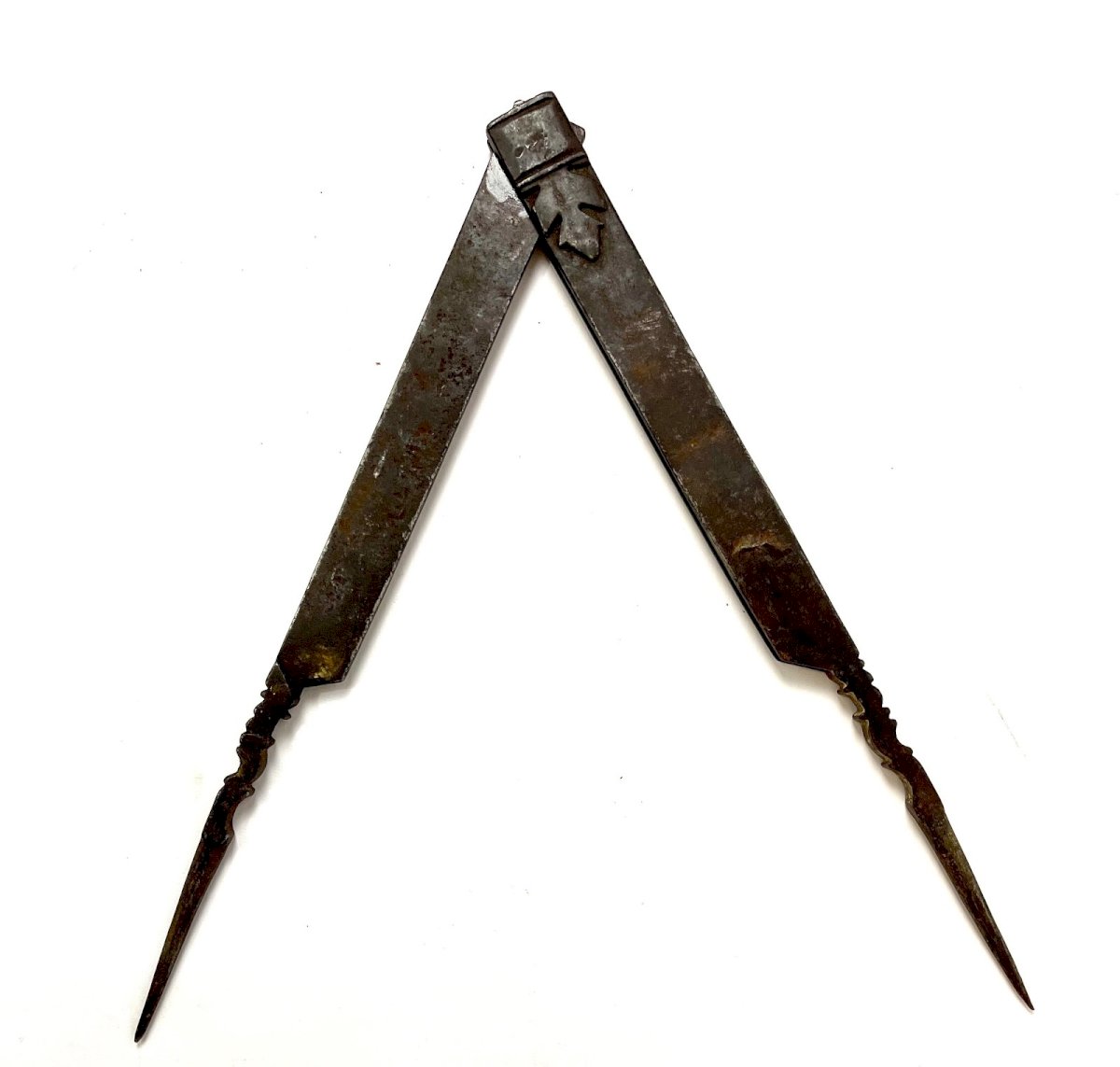 Stunning forged steel compass, dated from the 18th century, once used by surveyors and master builders to draw arcs, circles, and perfect proportions in classical and Gothic architecture. Charged with history and symbolism, it represents one of the essential tools of cathedral builders. In Masonic tradition, the compass embodies balance, mastery, and the quest for harmony. Its large size and ancient patina give it a rare presence, ideal for a collection, an architect's desk, or a cabinet of curiosities. Characteristics Era: 18th century Material: Forged steel Dimensions: 41.5 × 3 × 1.5 cm Condition: Good overall condition, authentic period patina Shipping Very careful packaging, national and international shipping with tracking number Type: Antique tool Origin: France Country of origin: France Subtype: Compass Height: 41 Material: Steel Style: Medieval / Gothic
