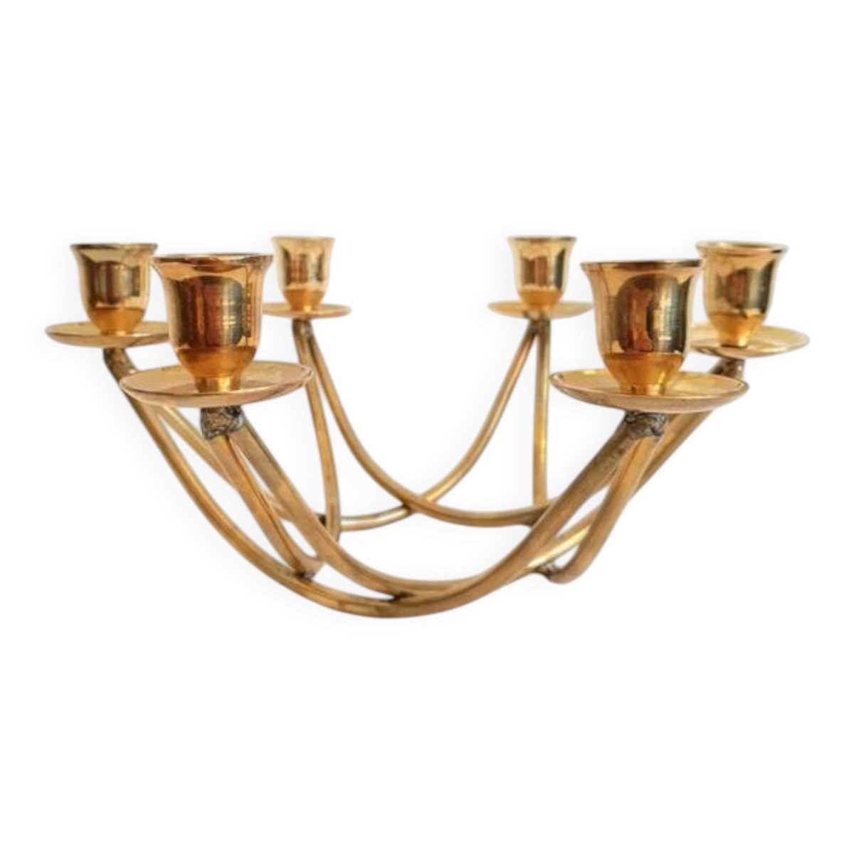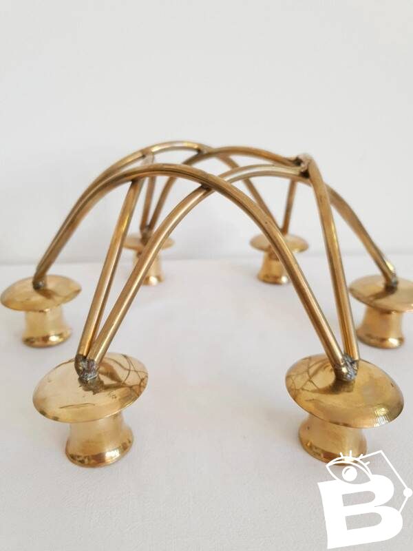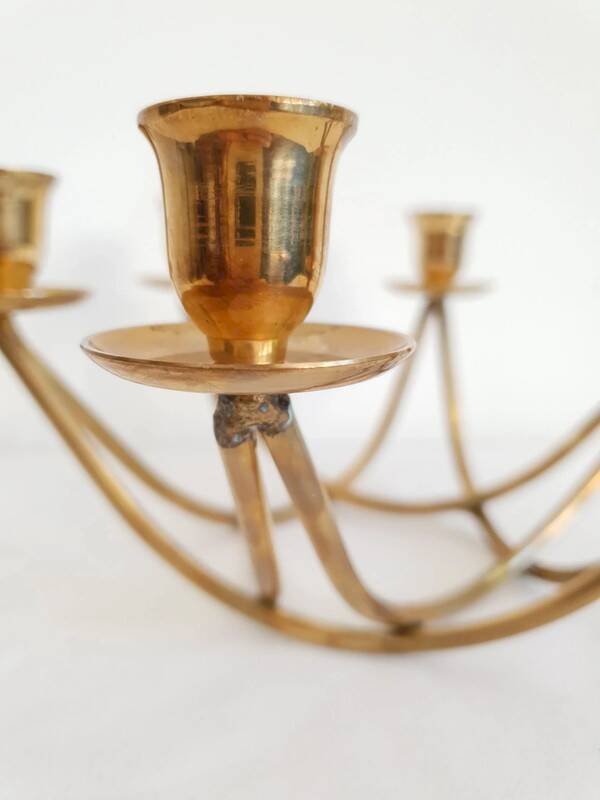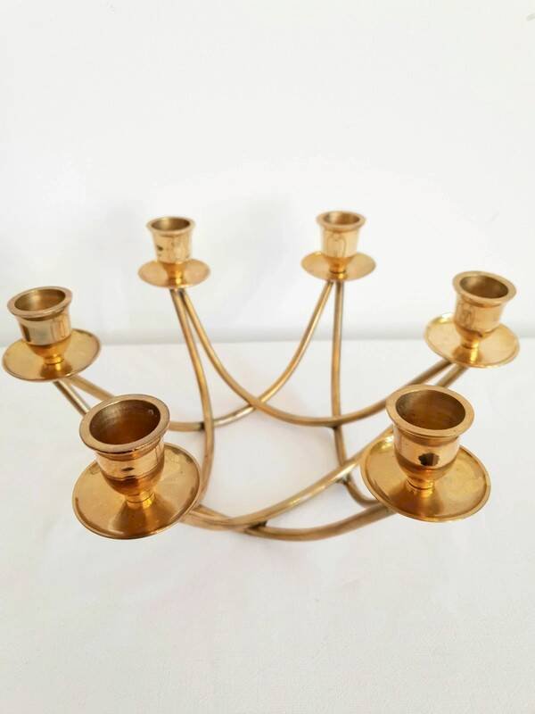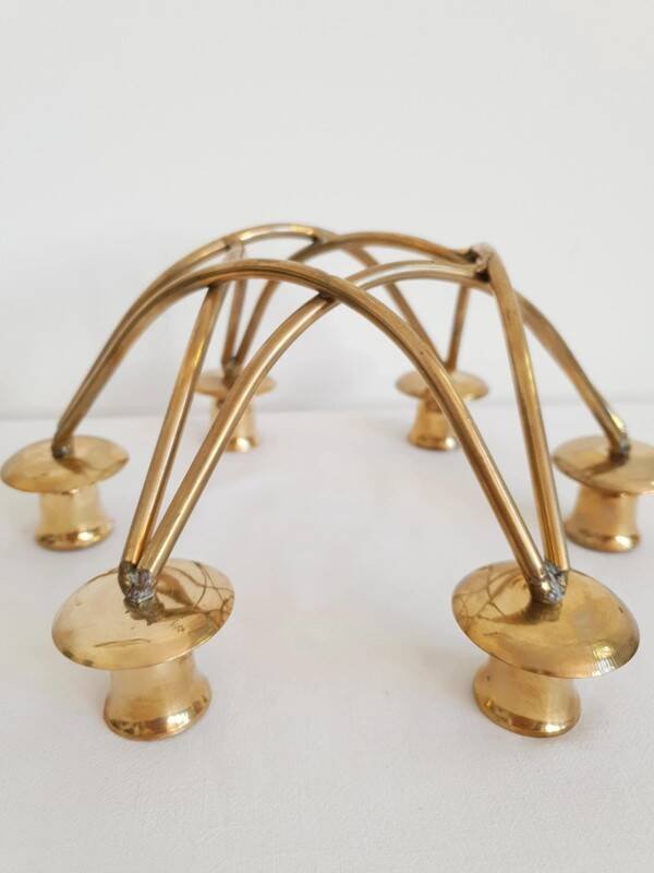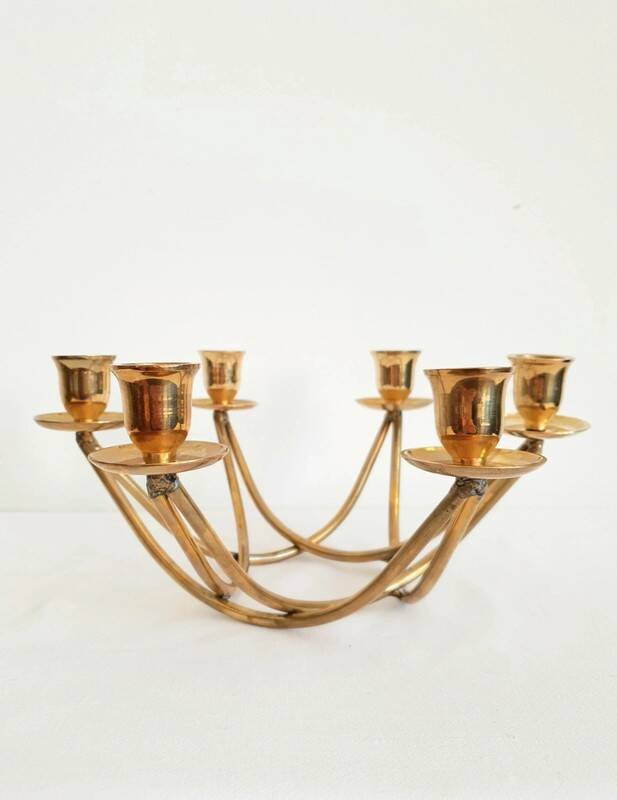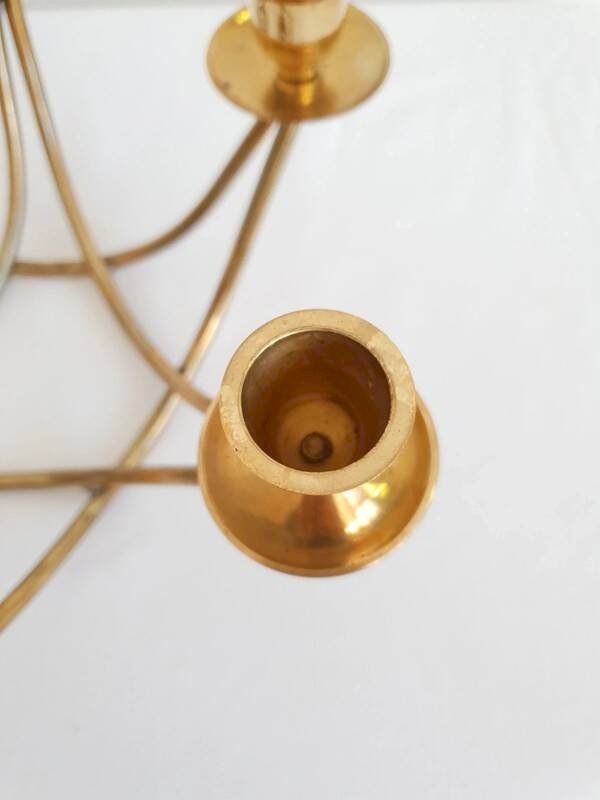 Beautiful 6-arm brass chandelier from the 1950s. Very good overall condition, some signs of aging. Height 12 cm. Length 26 cm. Width 23 cm. L: 26 W: 23 H: 12