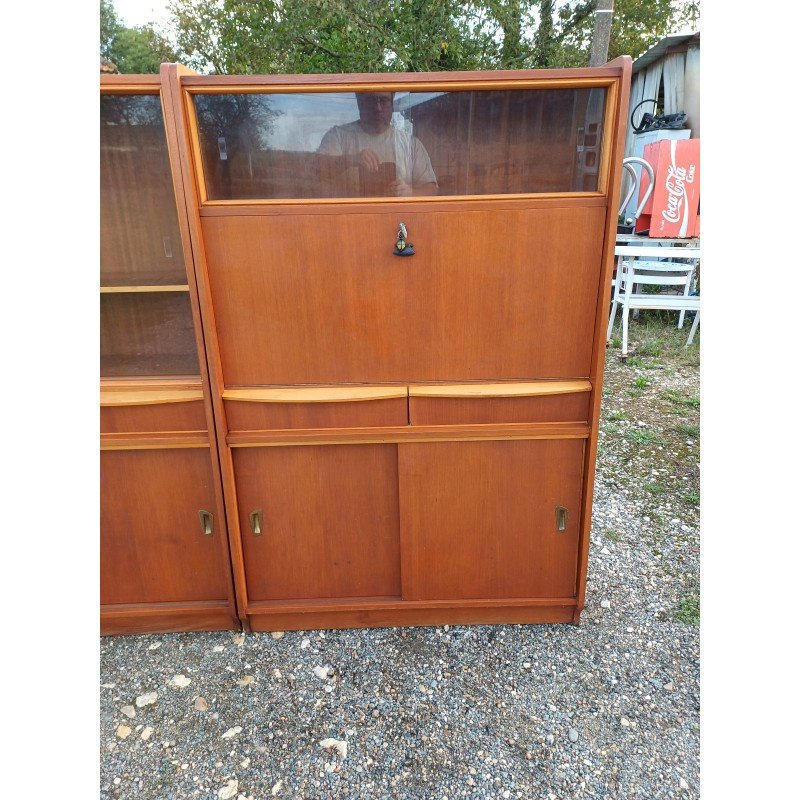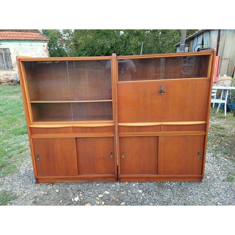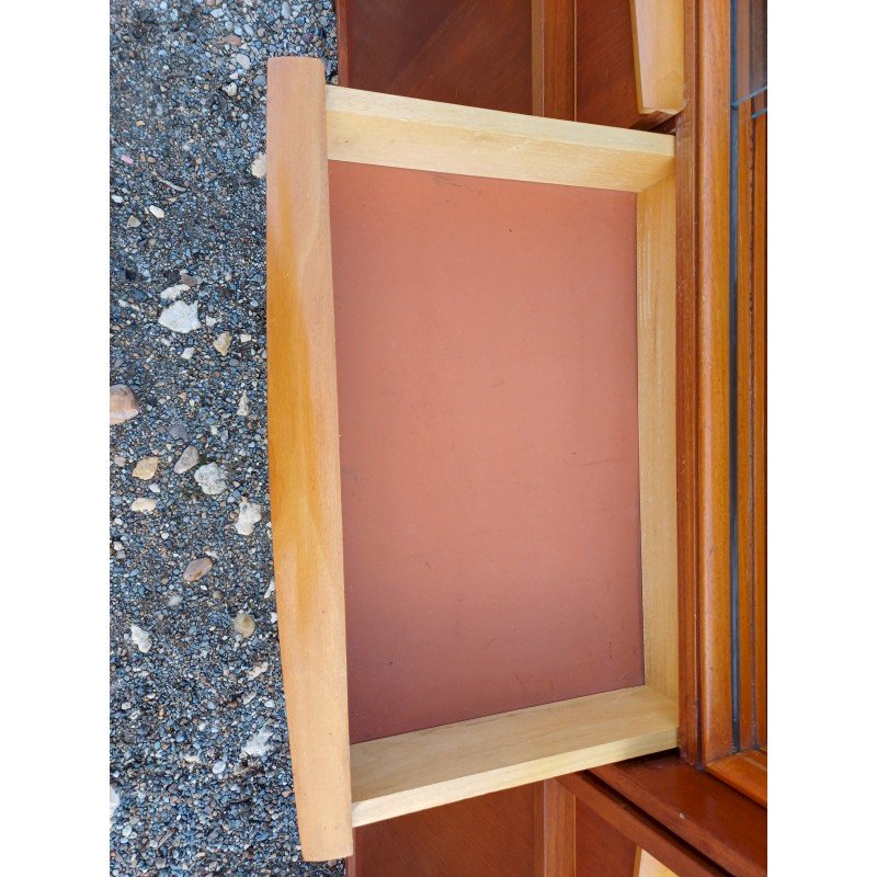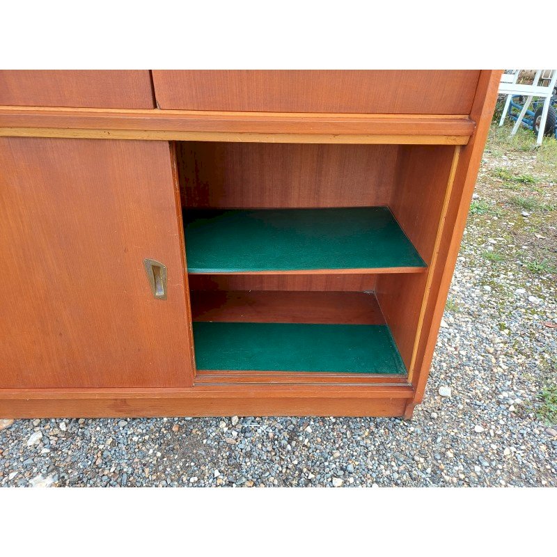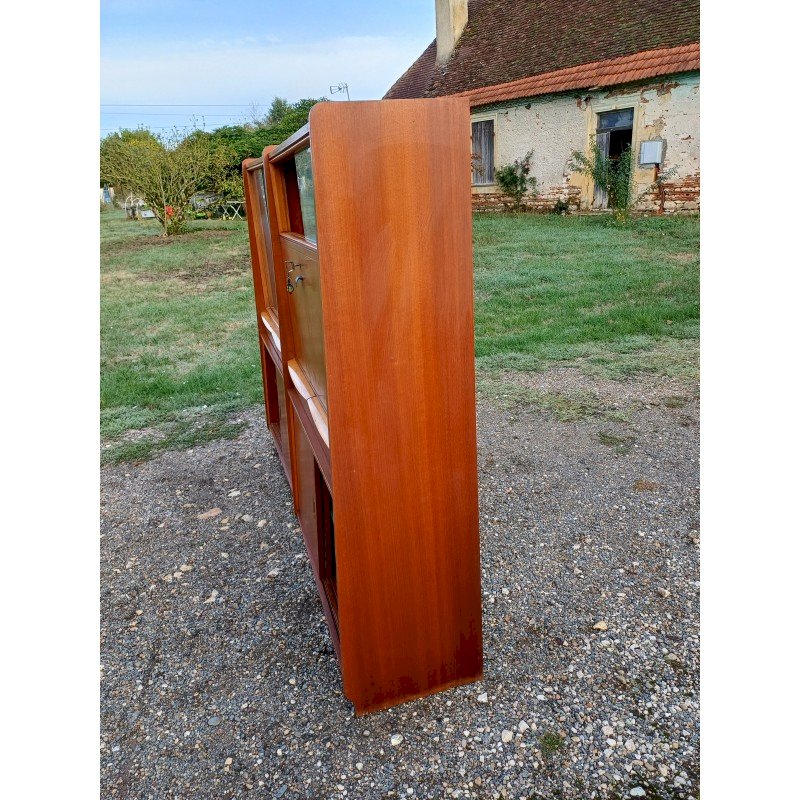 50s Display Furniture Wood and Glass, 2 separate pieces, Height: 143 cm, Length and Width: 94 cm by 34 cm, per piece, Depth: 25 cm and 30 cm, Sliding glass doors, 4 drawers, 4 sliding wooden doors, 1 flap, niches, key and lock, very good condition.