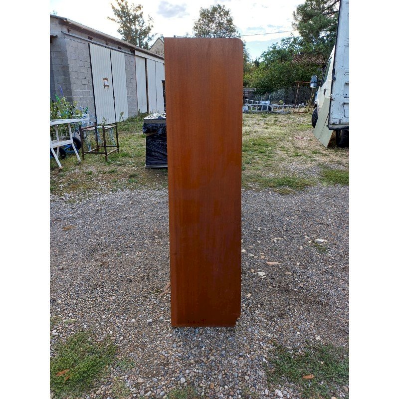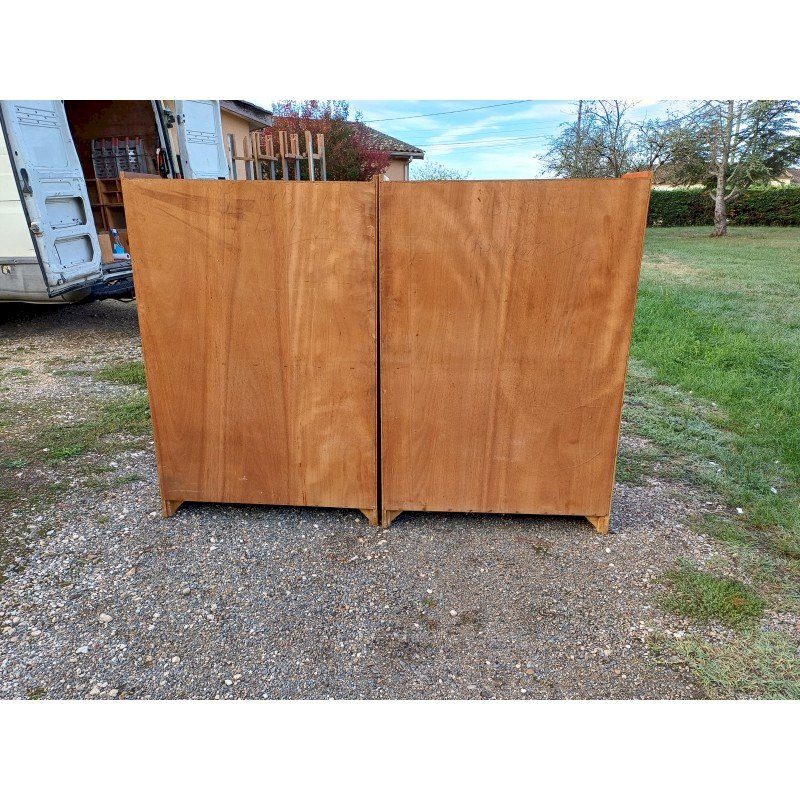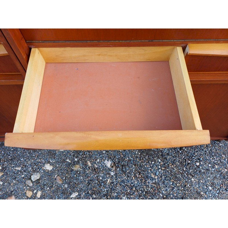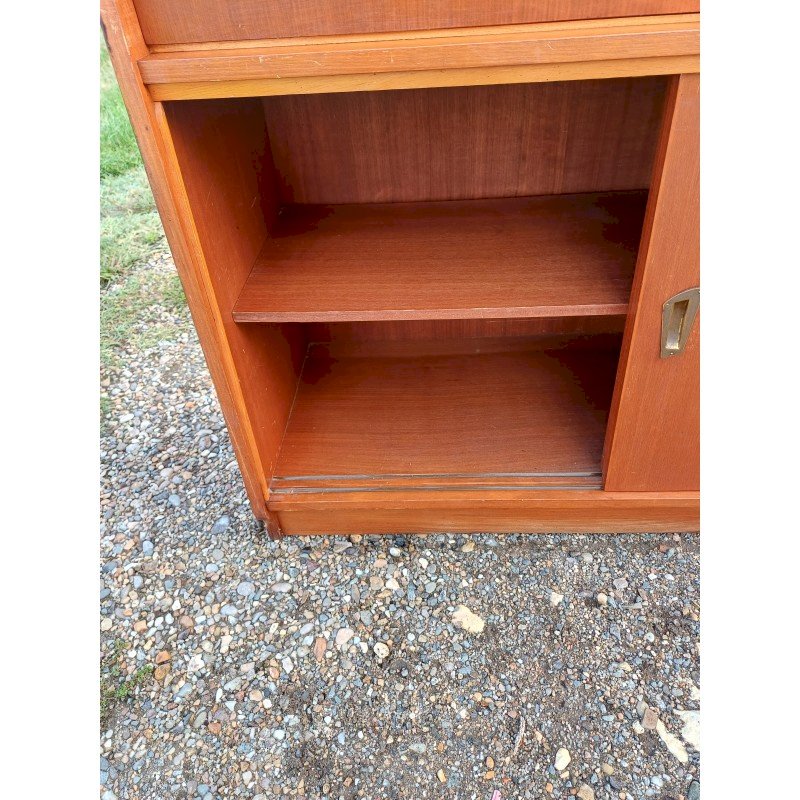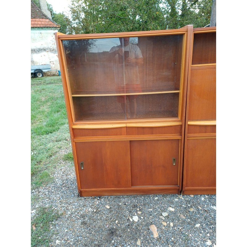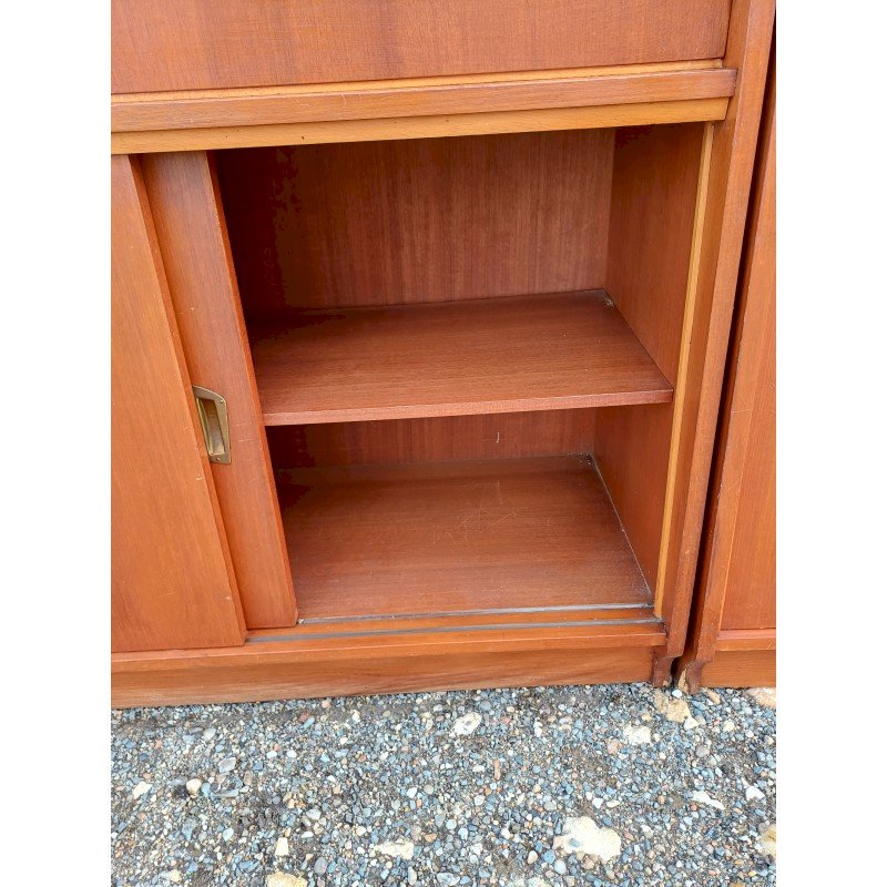 50s Display Furniture Wood and Glass, 2 separate pieces, Height: 143 cm, Length and Width: 94 cm by 34 cm, per piece, Depth: 25 cm and 30 cm, Sliding glass doors, 4 drawers, 4 sliding wooden doors, 1 flap, niches, key and lock, very good condition.