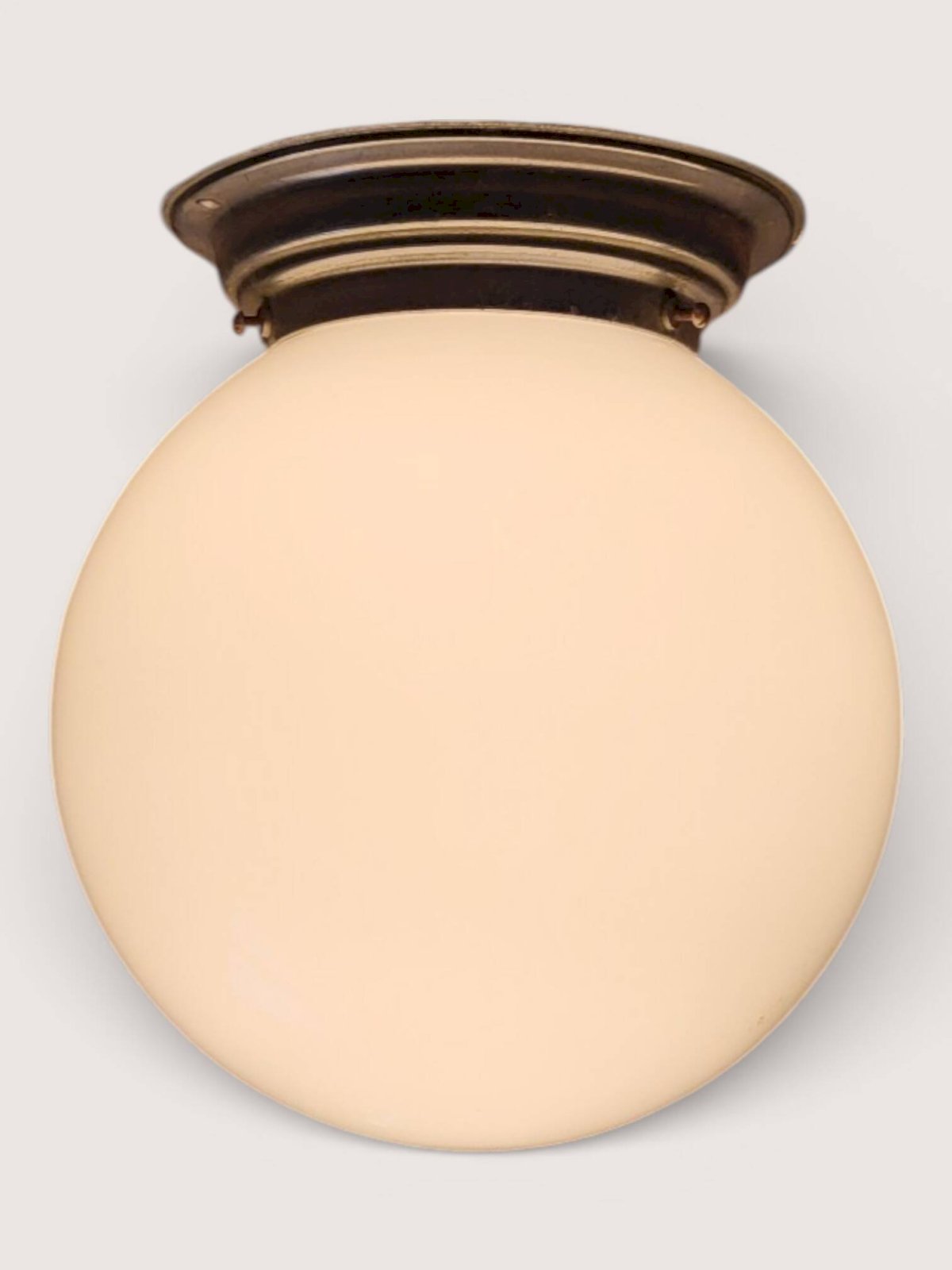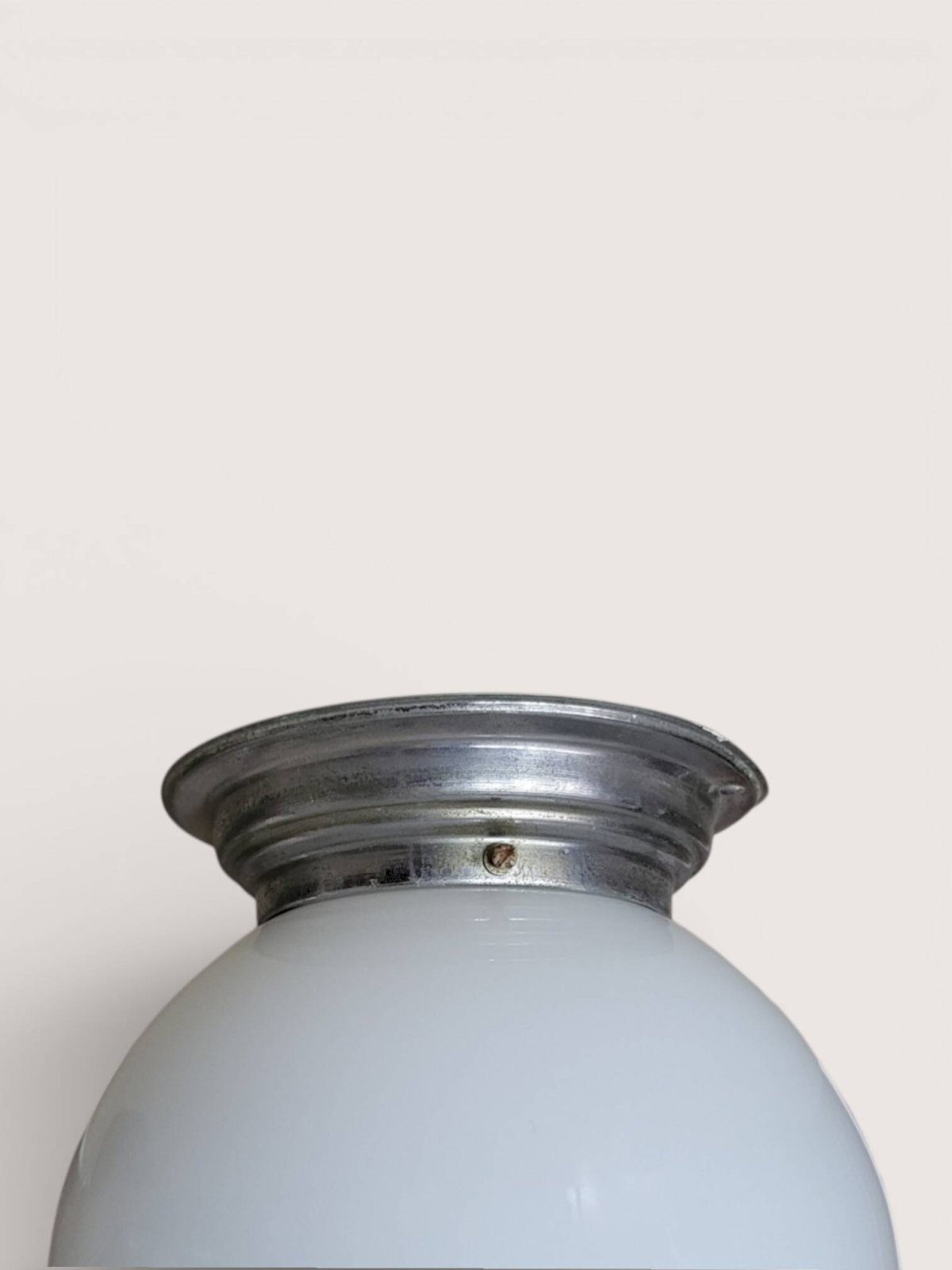 White glass globe ceiling light from the 1950s. Height 22 cm. Diameter 20 cm. In good condition with normal signs of use and age. Careful packaging and fast delivery. L: 20 W: 20 H: 22