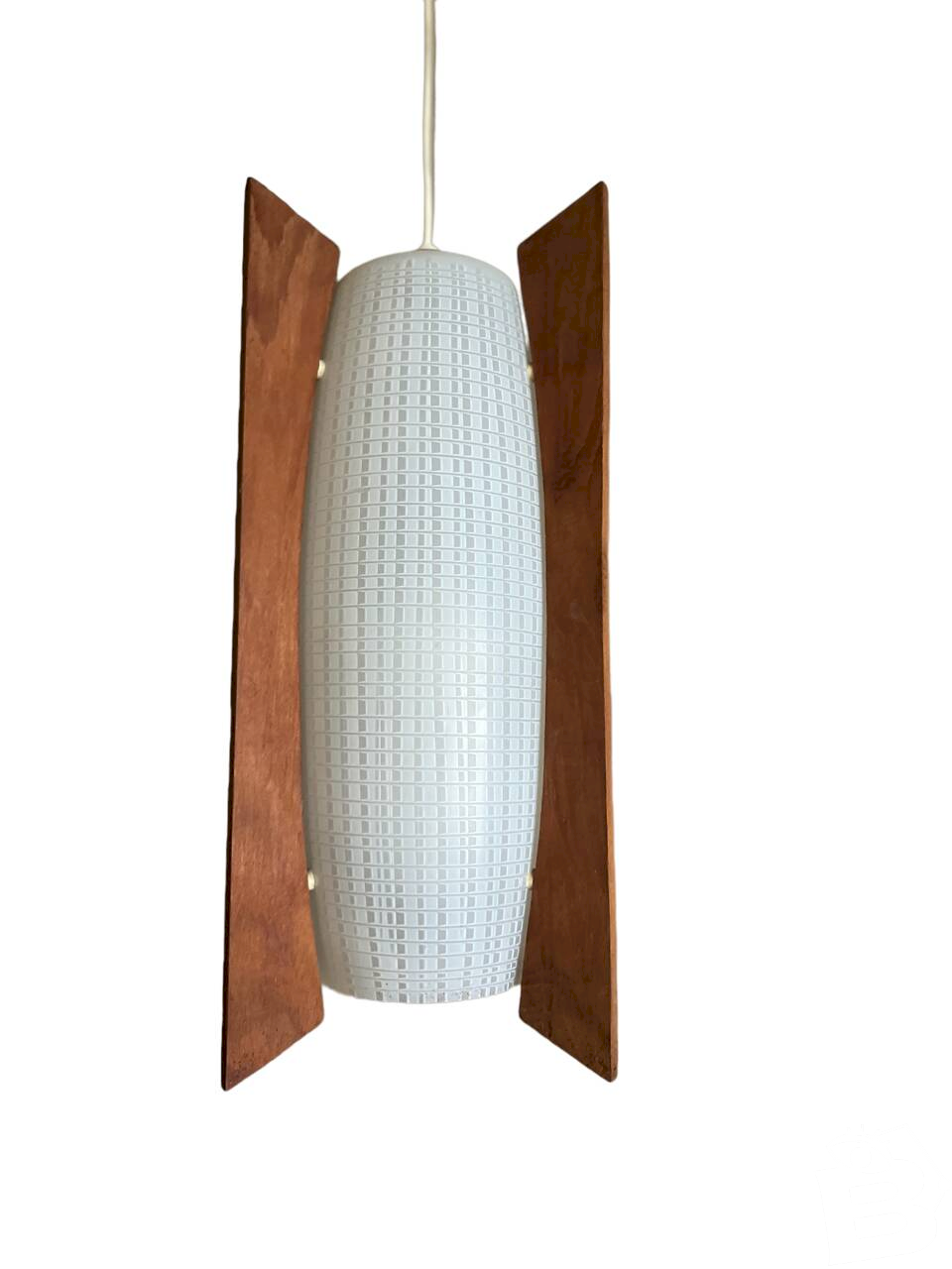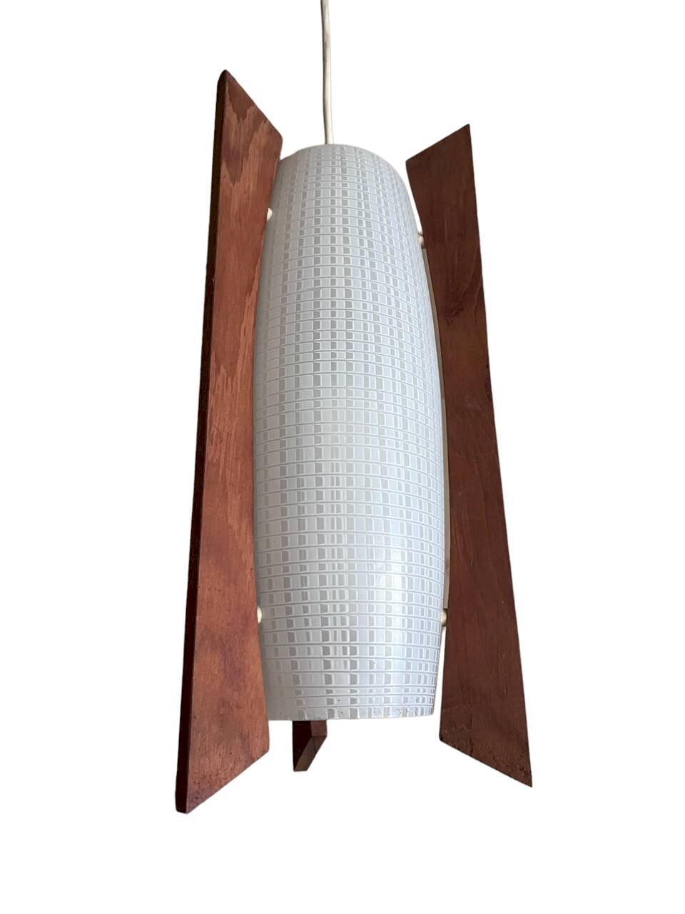 1950s suspension with a glass base and teak fins. Height of the fixture alone 36cm, diameter 20cm. L: 20 W: 20 H: 70