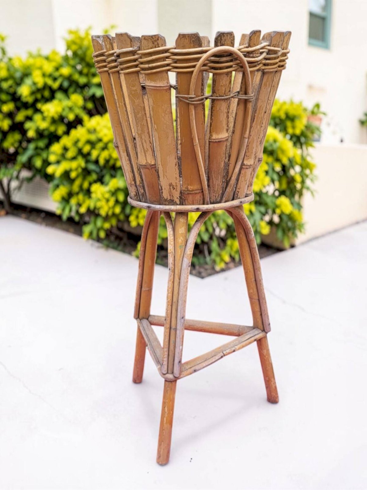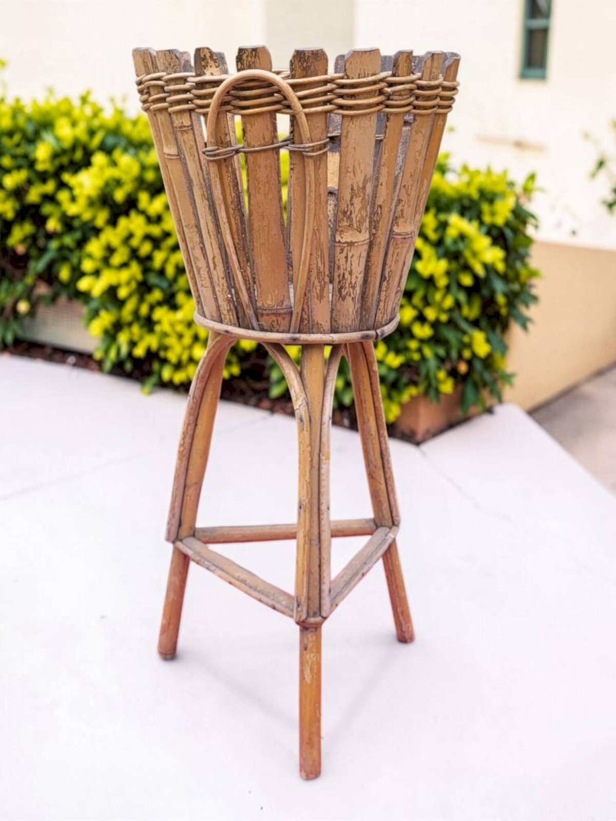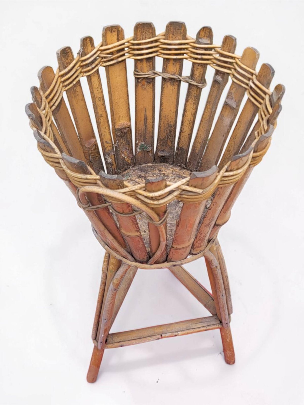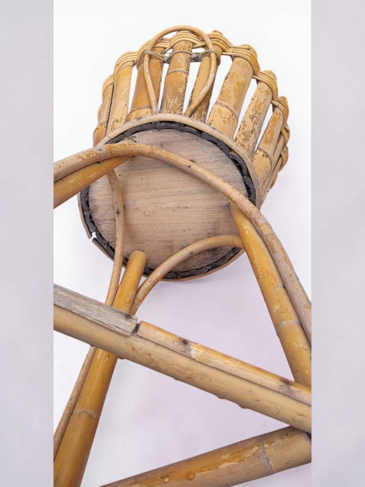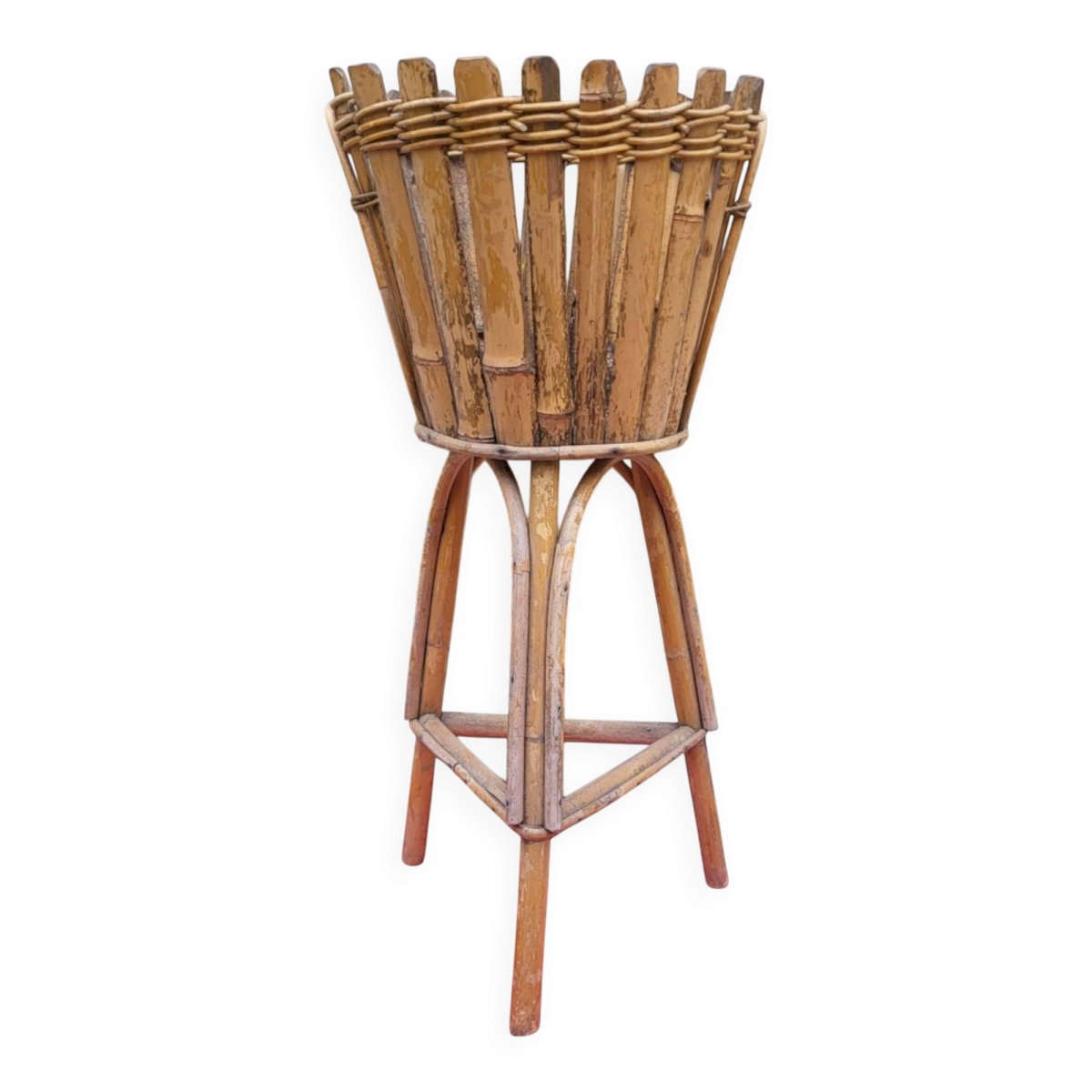 Rattan plant stand from the 1960s. Height 65.5 cm. Height for pot 24 cm. Diameter 30.5 cm. Base diameter 18 cm. In good condition with normal signs of use and age. Careful packaging and fast delivery. L: 30 W: 30 H: 65