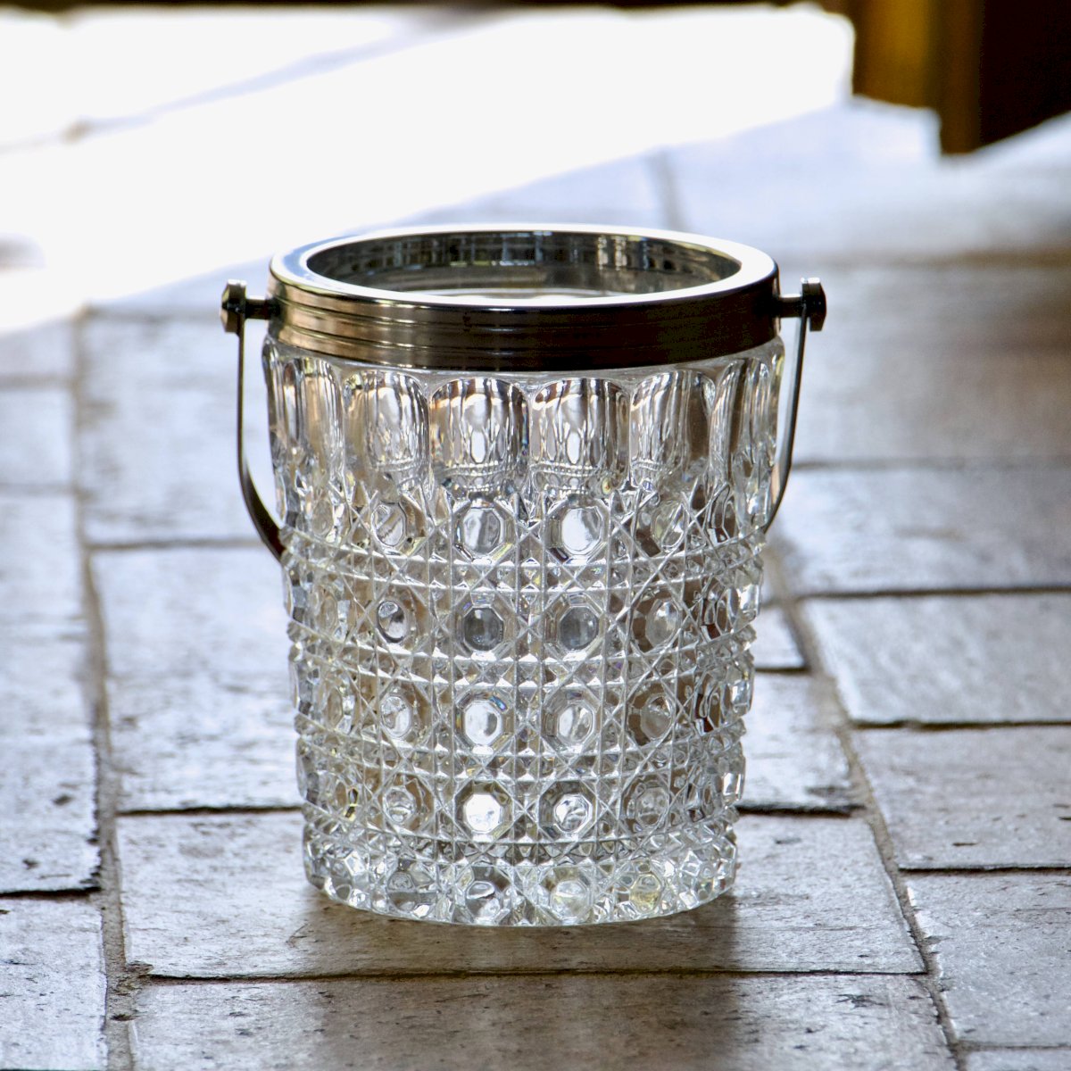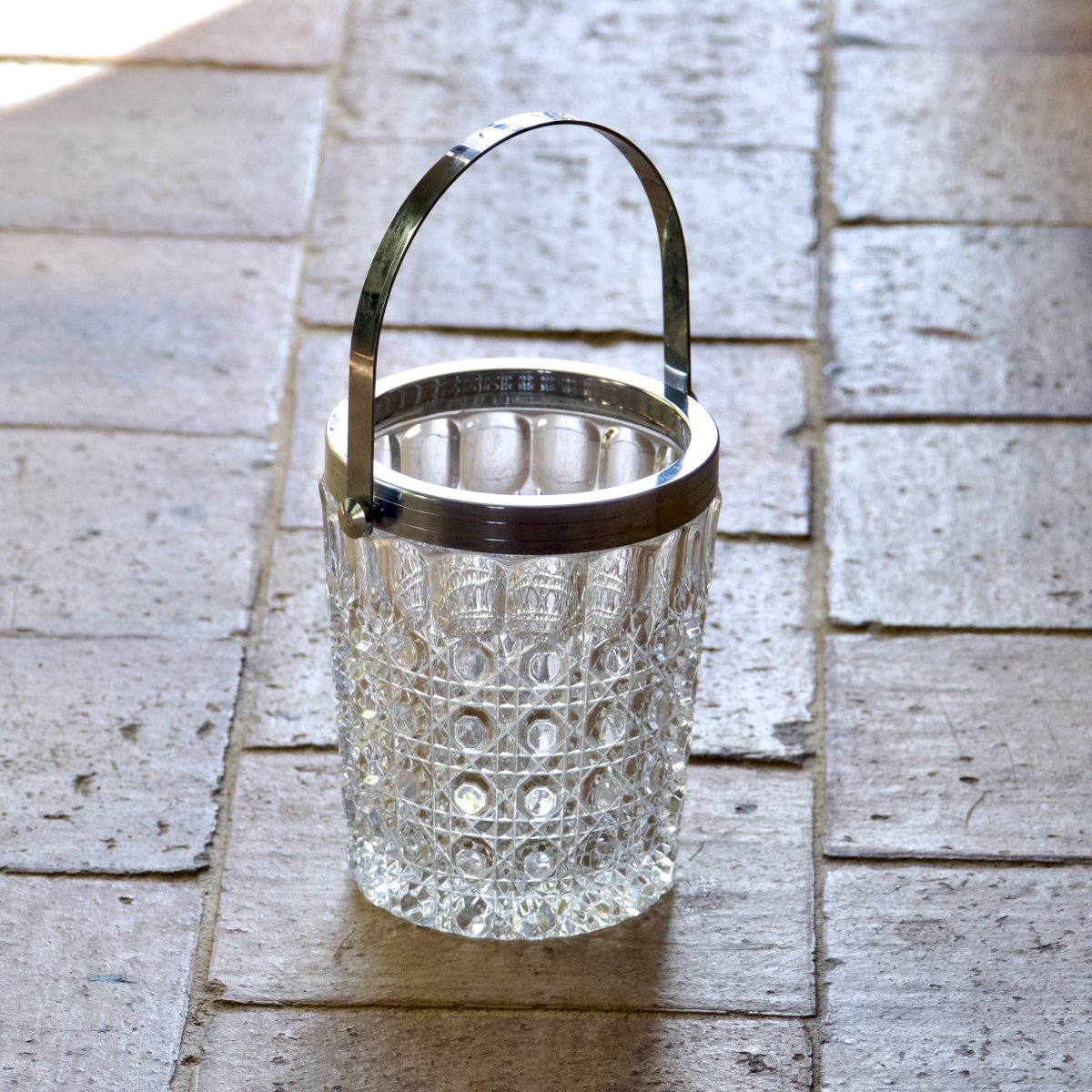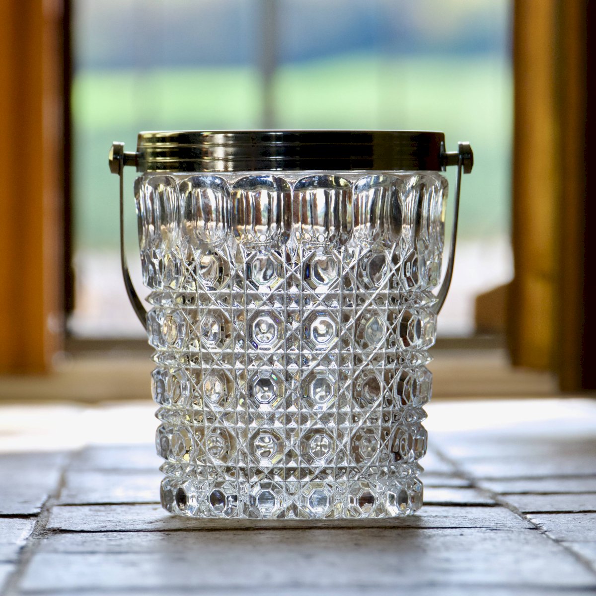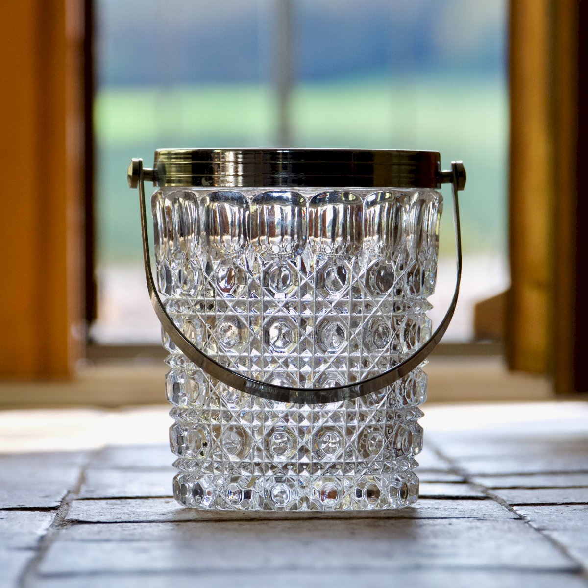 Beautiful crystal ice bucket from the 1970s, with silver-plated rim and handle. Diamond-cut and droplet crystal.