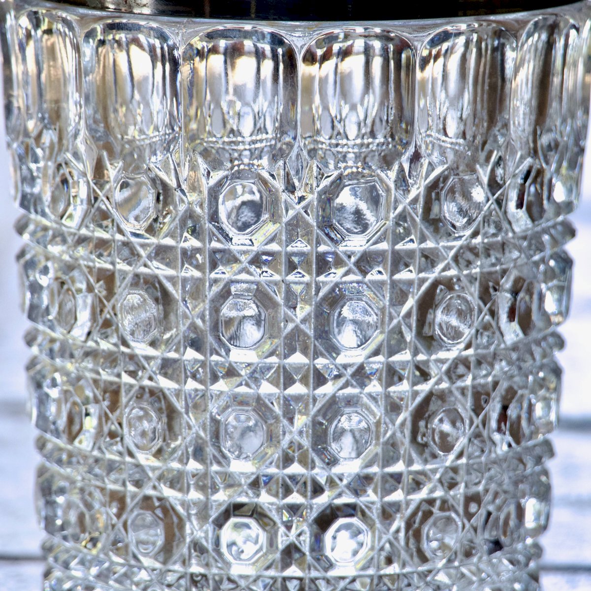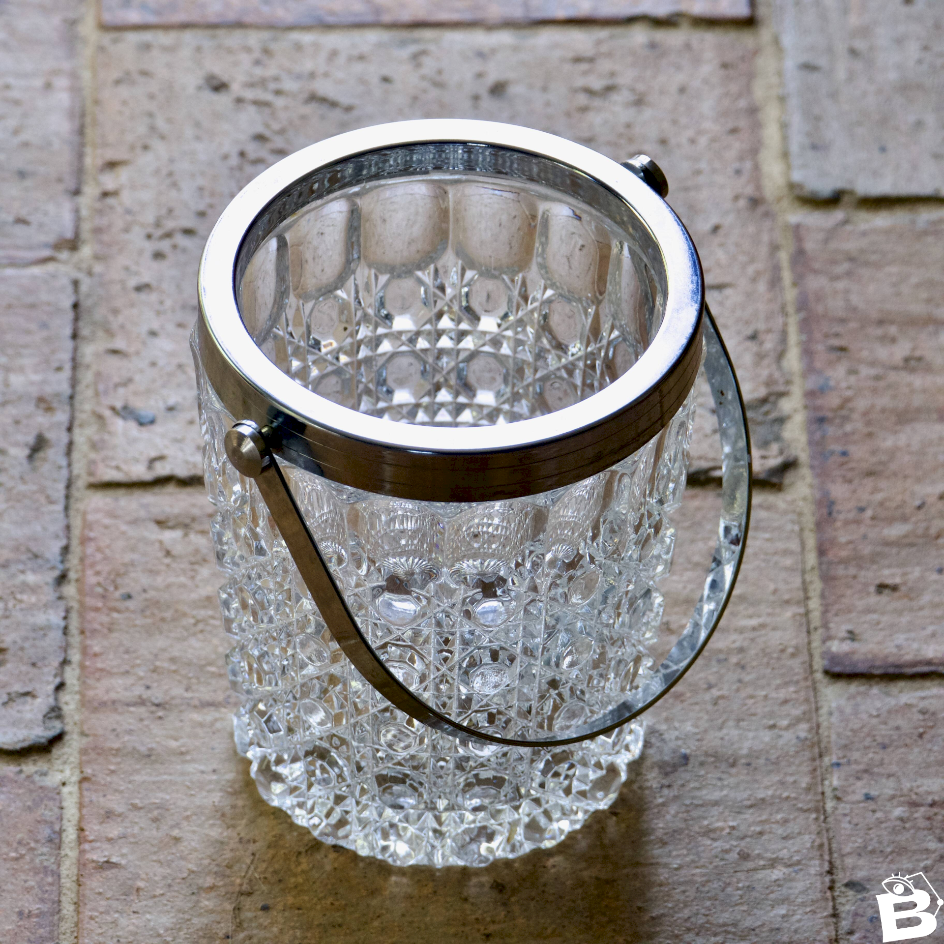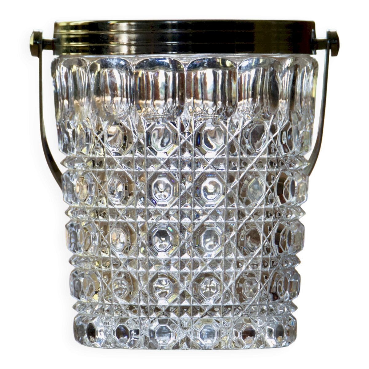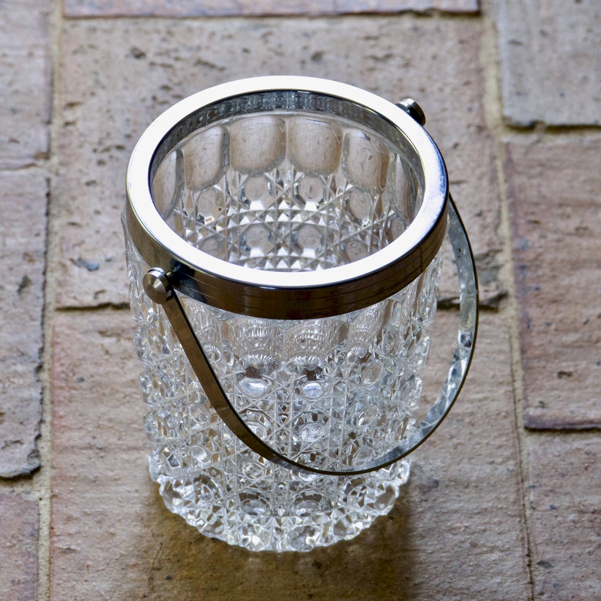 Beautiful crystal ice bucket from the 1970s, with silver-plated rim and handle. Diamond-cut and droplet crystal.