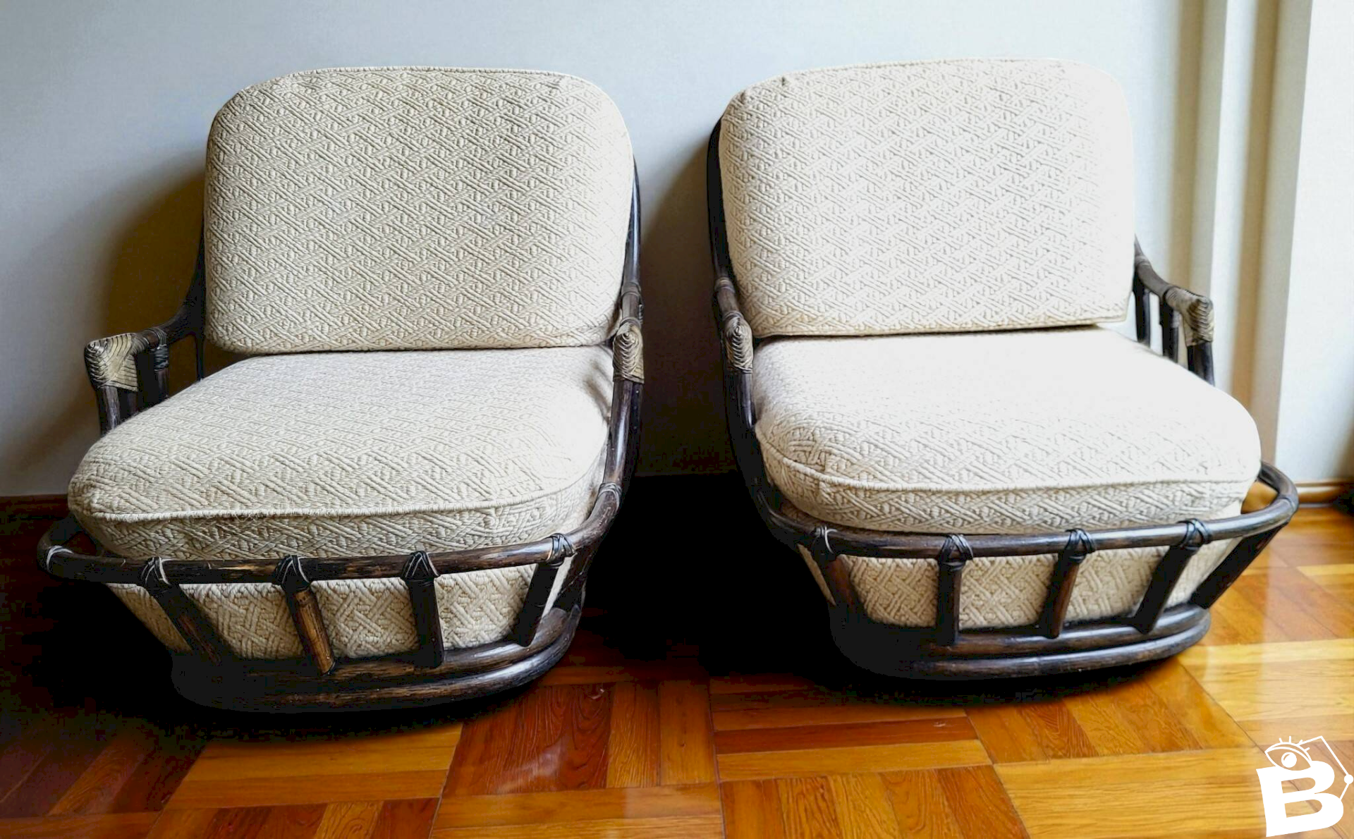 Pair of swivel rattan armchairs / the armchair consists of a rattan frame, a mattress (foam), a cushion (foam), and a backrest (rounded foam). The foam is dense and thick, providing a comfortable seat. The whole set is covered in light beige wool fabric. The entire set is in good condition with signs of use and age on the structure. The fabrics are in good condition (no stains or tears) height 79 cm, width 72 cm, depth 95 cm, seat height 35 cm. L: 72 W: 95 H: 79