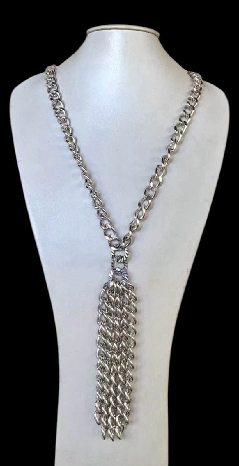 1980 Vintage French Fashion Couture Aluminum Pendant Chain Necklace. The necklace is slipped over the head and does not have a clasp. Good vintage condition. The photos are an integral part of the description. Length dimensions approximately 57 cm. Weight approximately 130 g - this necklace is relatively light compared to its volume and therefore comfortable to wear. Condition: Used: Item has been worn. ...Used: Item has been worn. any imperfections. Main stone: None. Color: Silver. Type: Chain. Brand: French Creation. Dominant color: Silver. Material: N. Metal: Aluminum. Theme: 90s. Pendant shape: Chain.