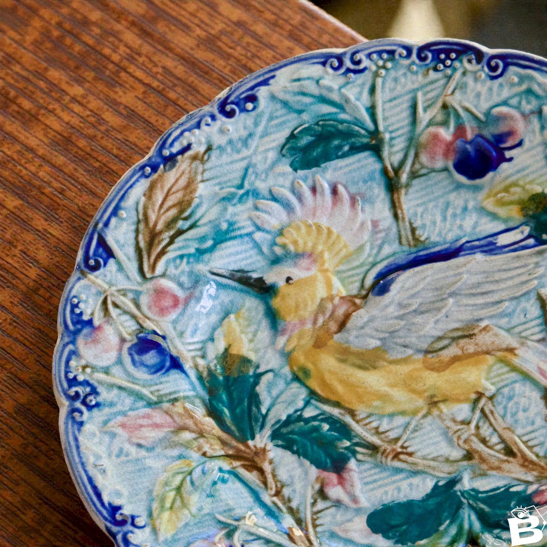 Antique majolica plate in barbotine by Mouzin-Lecat from Wasmüel, circa 1880. Handmade and painted. Beautiful relief decoration of a colorful bird of paradise, spreading its wings, sitting on a branch that appears to be a cherry tree. Cherries and leaves enhance the background. Scalloped rim and arabesque frieze. Wonderful colors, still very vibrant. It is in magnificent condition, no cracks, no chips, lovely shine. ? 21 cm in diameter. ✨ Very careful shipping. ✨ Professional store. ✨ You will receive an invoice and benefit from after-sales service after each purchase. ✨ We have more listings online, feel free to take a look. 12/25. L: 21 l: 21 H: 21