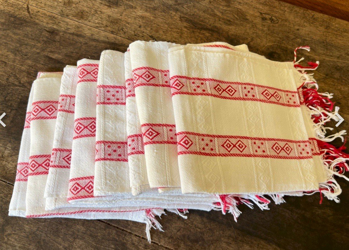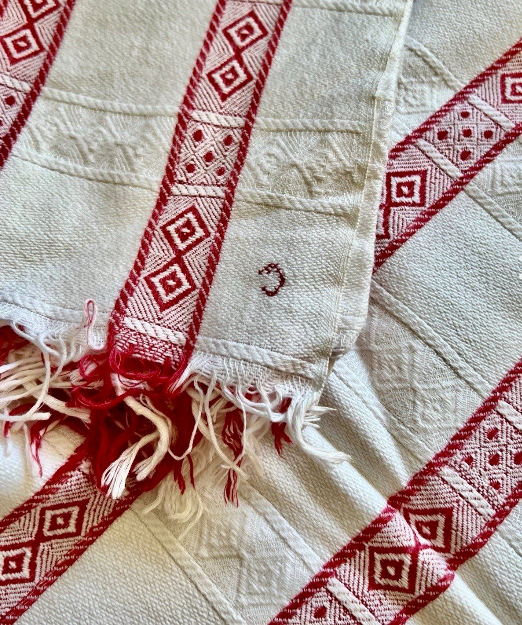 Antique 19th century linen - white and red cotton guest towels. 8 hand towels or guest towels for kitchen or bathroom. 19th century, in damasked cotton with fringes. Dimensions approximately 88 cm long including fringes and 49 cm wide. There is an initial on the towels, see photo. One of the towels out of the eight is a little less red; it has probably been used a bit more. Otherwise in very good antique condition. Total weight approximately 1 kg Type: Towel Material: Cotton Color: White Era: 19th century Usage: Table linen Weight: 1 kg Origin: France Country of origin: France
