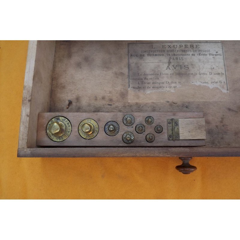 19th-century balance trebuchet with its weights. Walnut wood, brass, iron, and brass weights from: 100g to 1g, Brand: L'Exupere, height: 35 cm, length and width: 33 cm by 17 cm, very good condition, more photos in your messages, visible in GARDONNE (24) shipping via mondial relay: €10.40 or colissimo: €18.50.