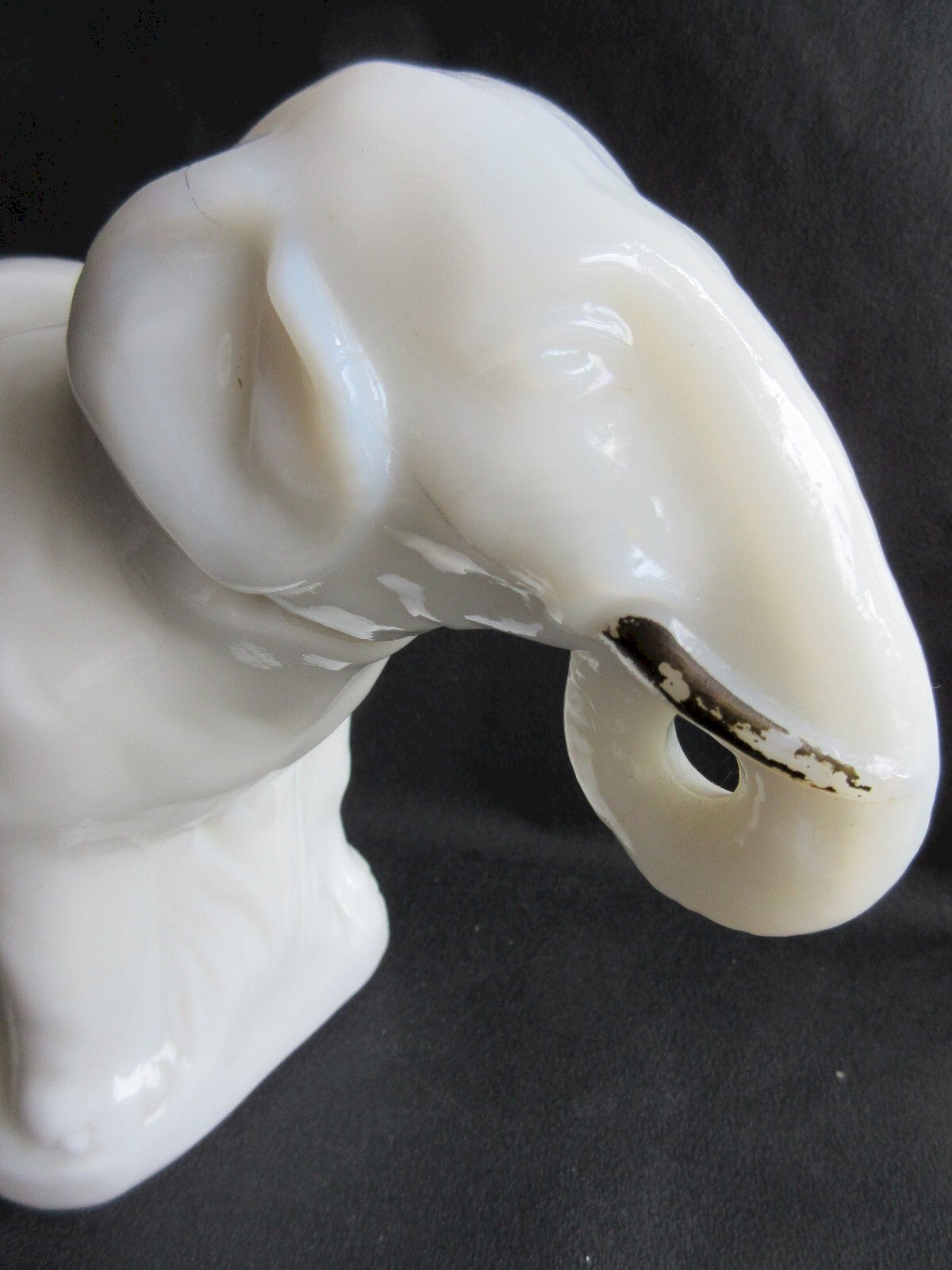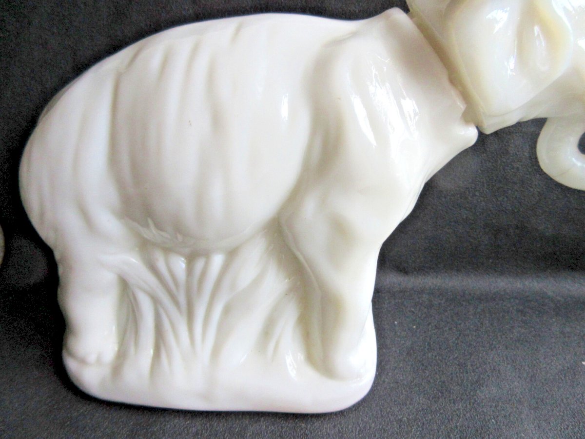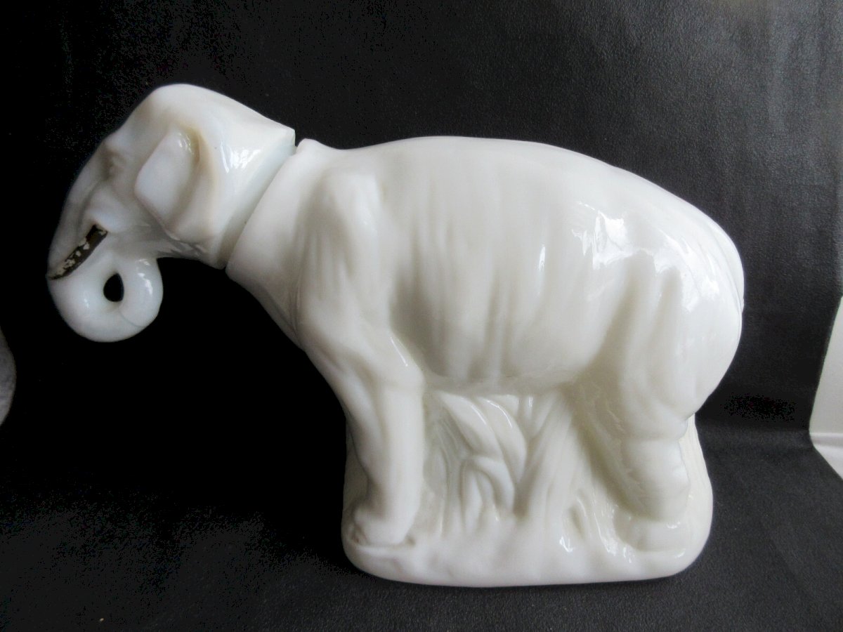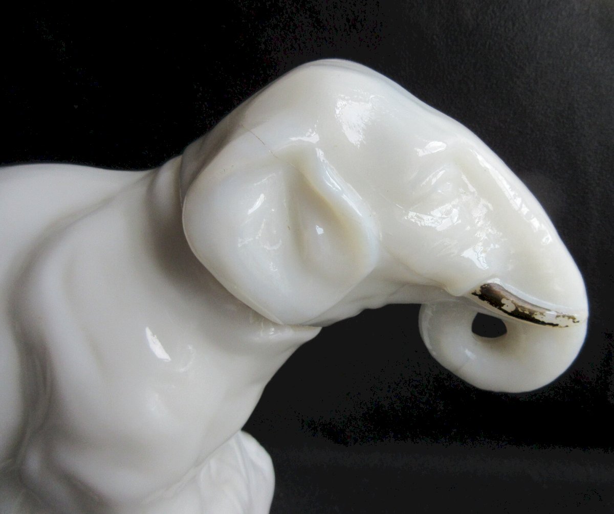 Worldwide sale. 19th Century Opaline: ELEPHANT. Superb and rare white opaline box depicting an elephant with painted brown tusks. The head fits into the neck. Dimensions: 26 cm X 9 cm. Height: 17 cm. Good condition. At the joint of the head, 1 or 2 tiny chips. The head fits easily but does not touch the body completely. No signature. Rare exceptional opaline for collectors. The numerous photos complete the description. Authenticity: Original Type: Display object, Decorative Origin: France Sub-type: Box Material: opaline Style: Napoleon III