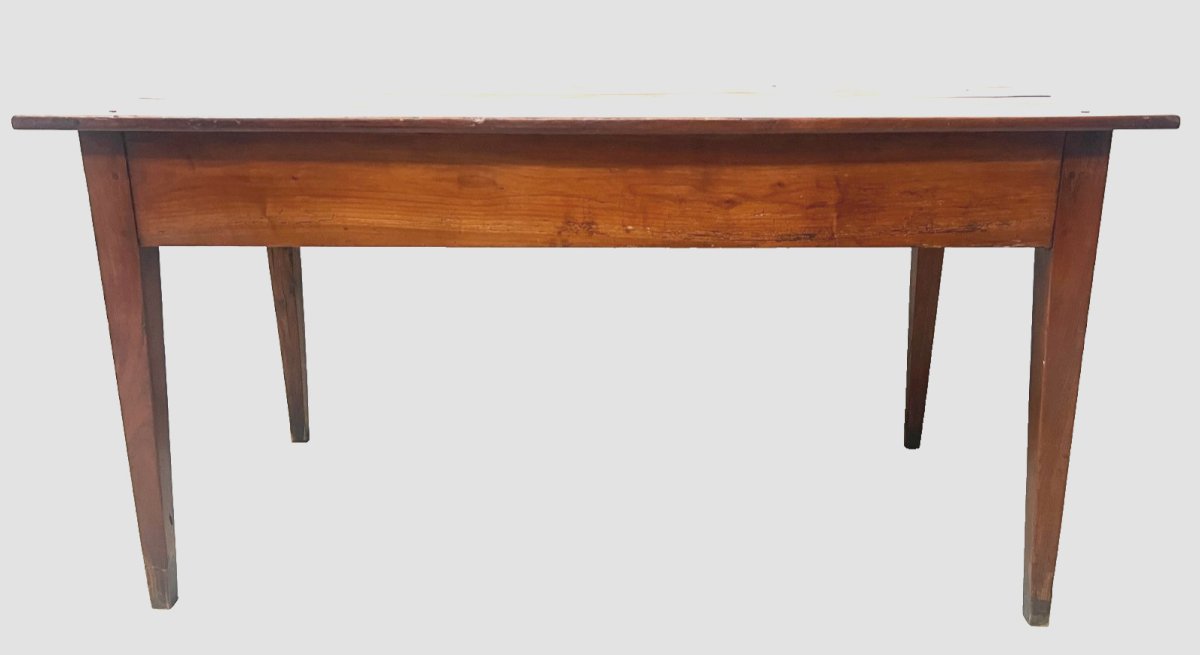 Farmhouse table in solid cherry wood. It rests on four spindle legs. A large drawer at the end of the table. In good condition. Dimensions H 78 x L 151 x W 71 cm. 19th century. Type: Table Subtype: Dining table Height: 78 Material: Cherry wood Style: Louis Philippe Number of seats: 8 Length: 151 Feature: With storage Width: 71 Shape: Rectangular
