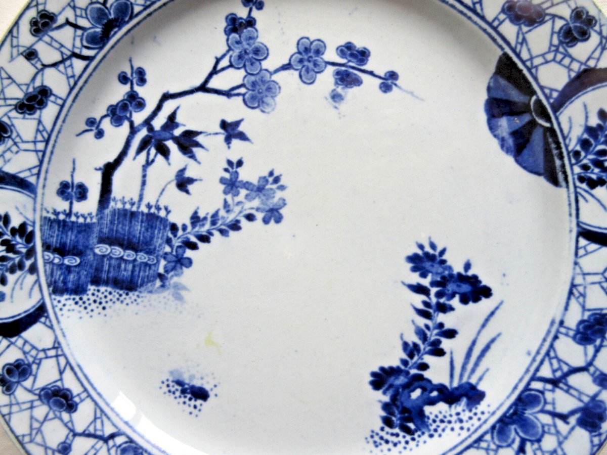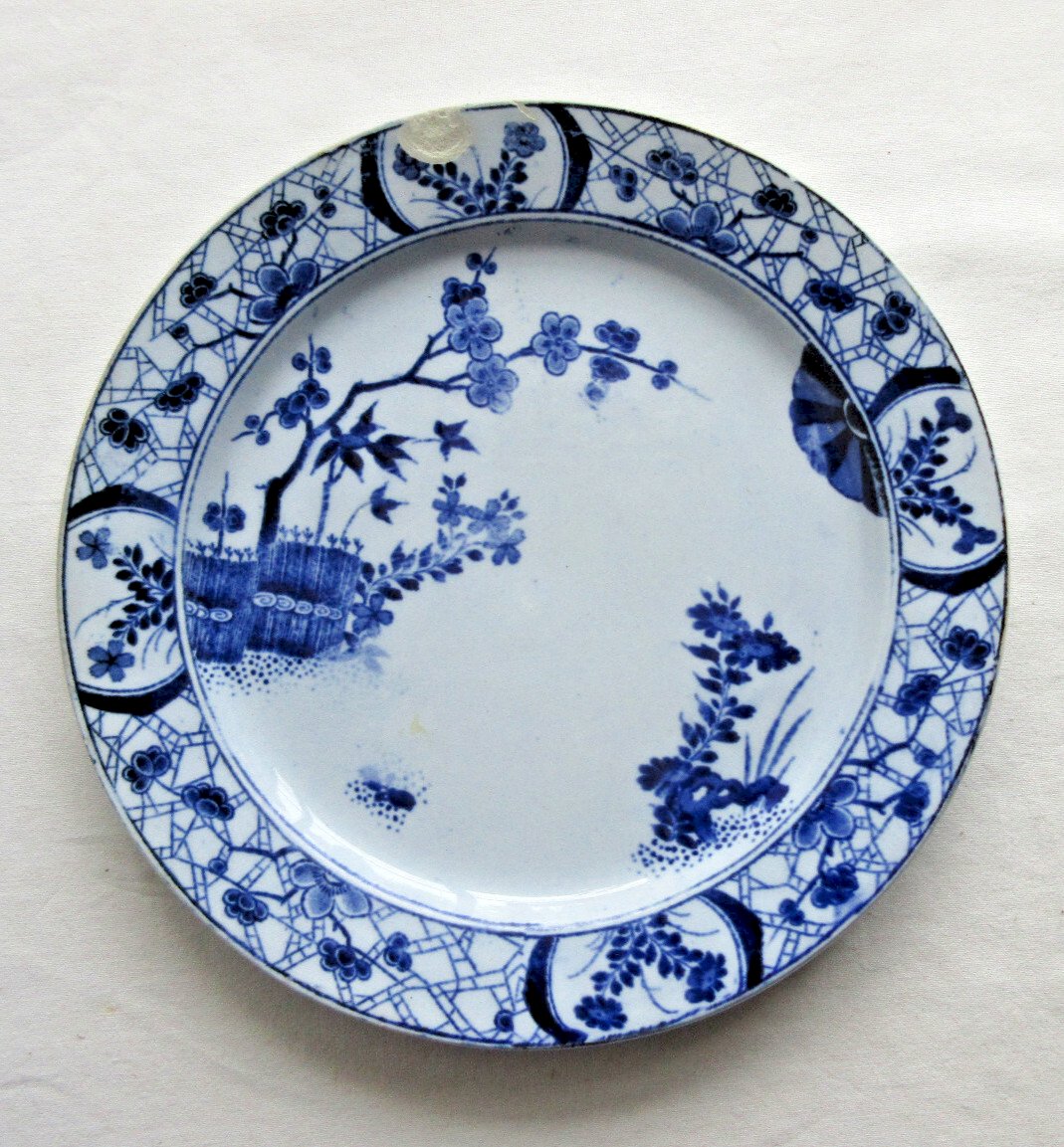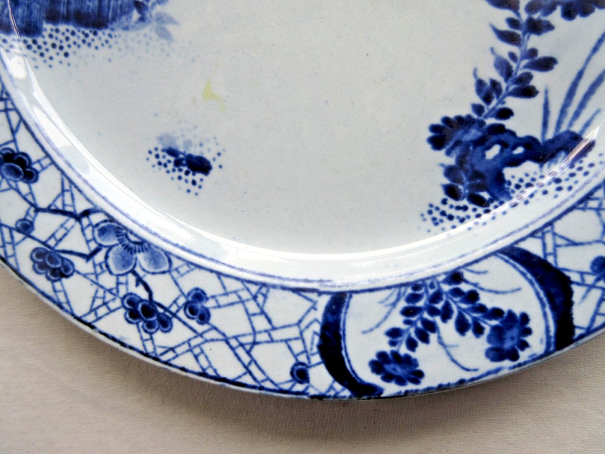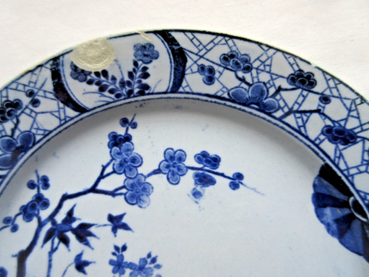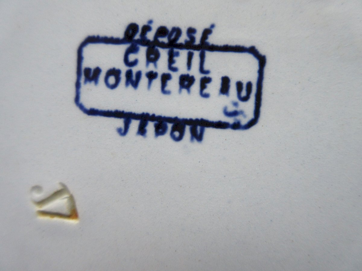 Worldwide sale. Creil Montereau plate: Japan. Antique dessert plate in pale blue porcelain with a dark blue decoration. It is signed Creil Montereau, model Japan. See signature on the bottom. Diameter: 18 cm. Good condition but with a chip on the edge, see photo. The photos complement the description.