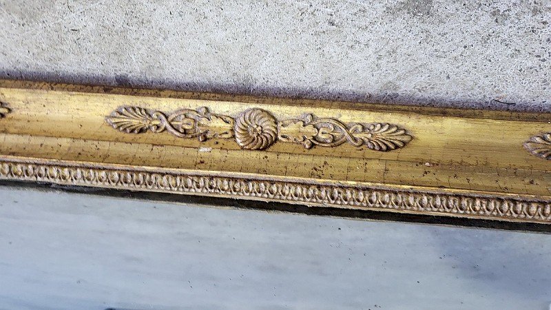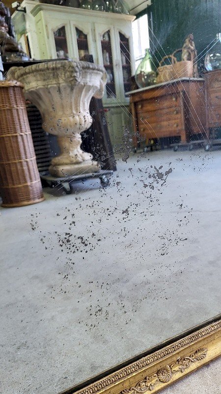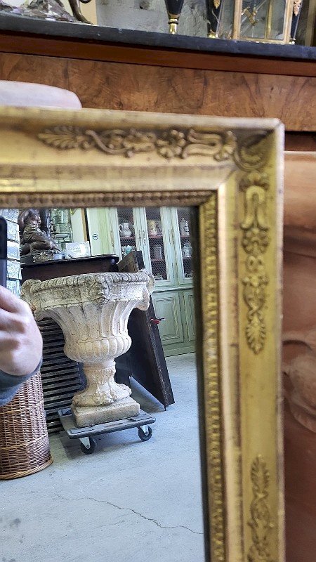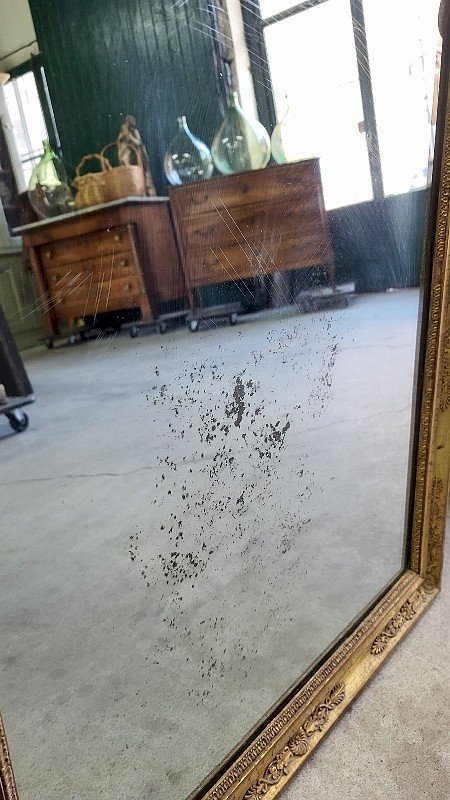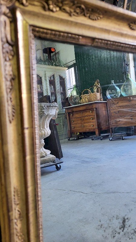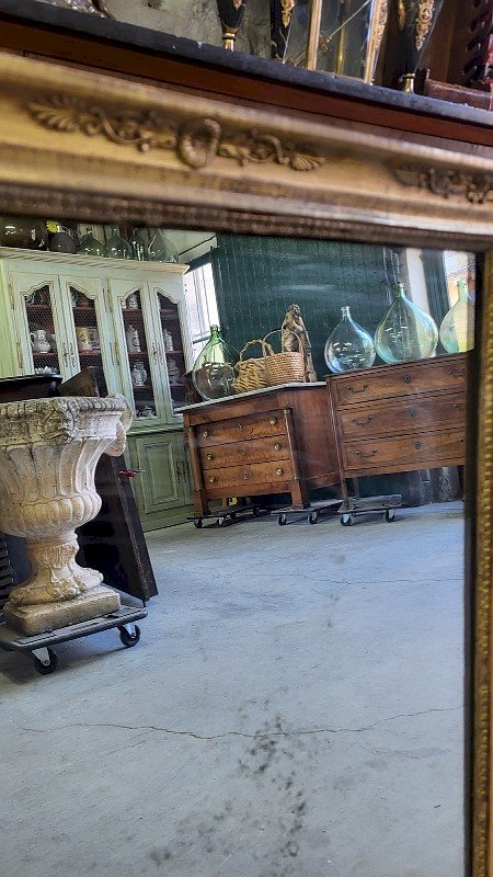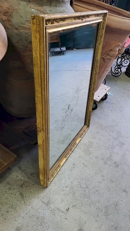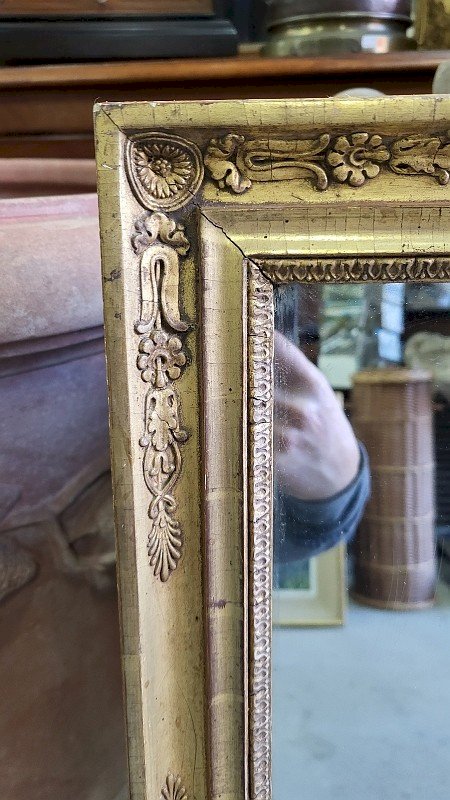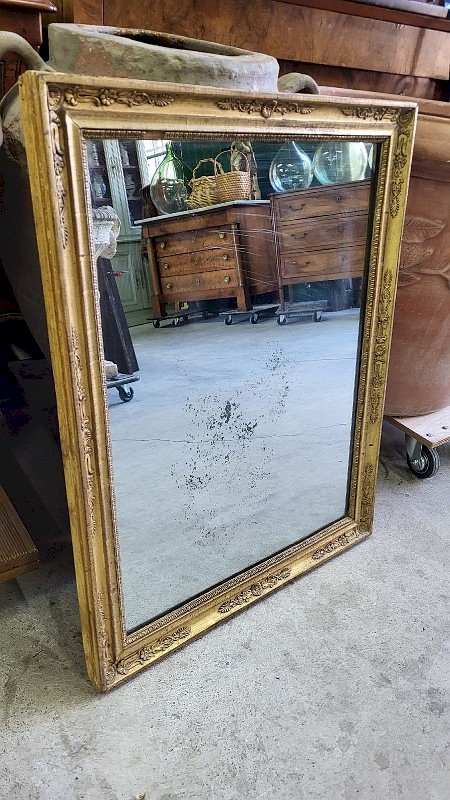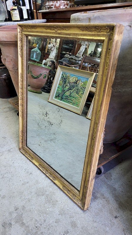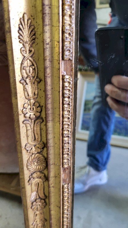 Beautiful gilded wood mirror with palmettes from the 19th century. It is in good condition but needs restoration; there are scratches on the glass and it's spotted (see photo). The gilding is original. There are three areas where the molding is missing on the inner side next to the mirror. The mirror measures 65 cm high by 48 cm wide, and the frame measures 75 cm high by 59 cm wide. I remain at your disposal for any questions, either by email or by phone: . For larger photos, please send me your email. For delivery between the south and Paris, ask for the price from JM TRANSPORTS at 06.12.25.48.48. For another destination, please contact me. Type: Wall-mounted.