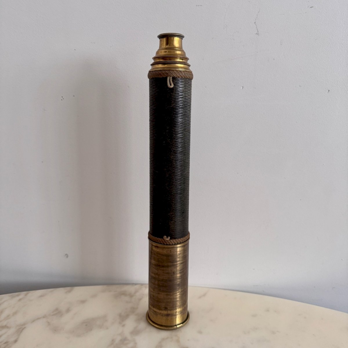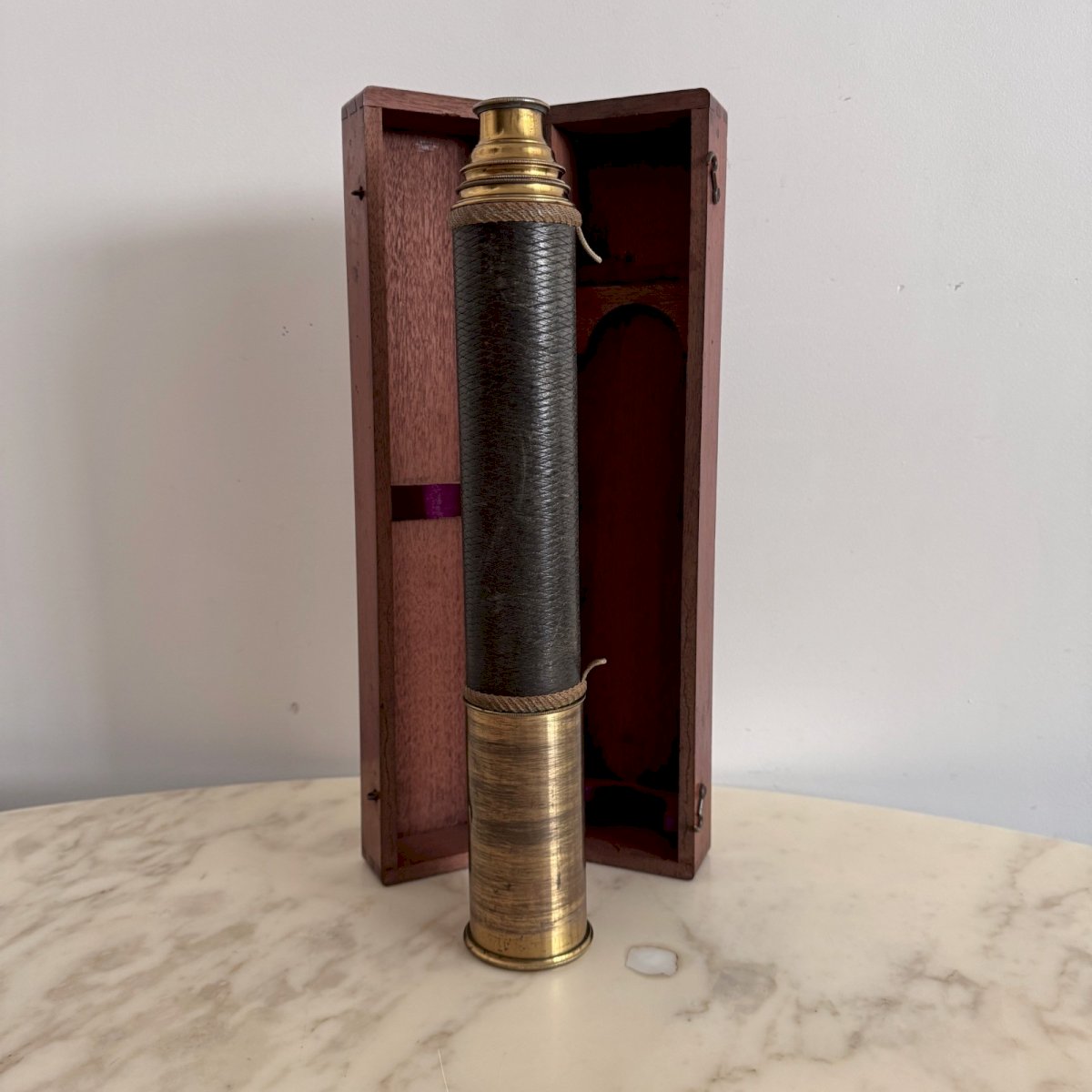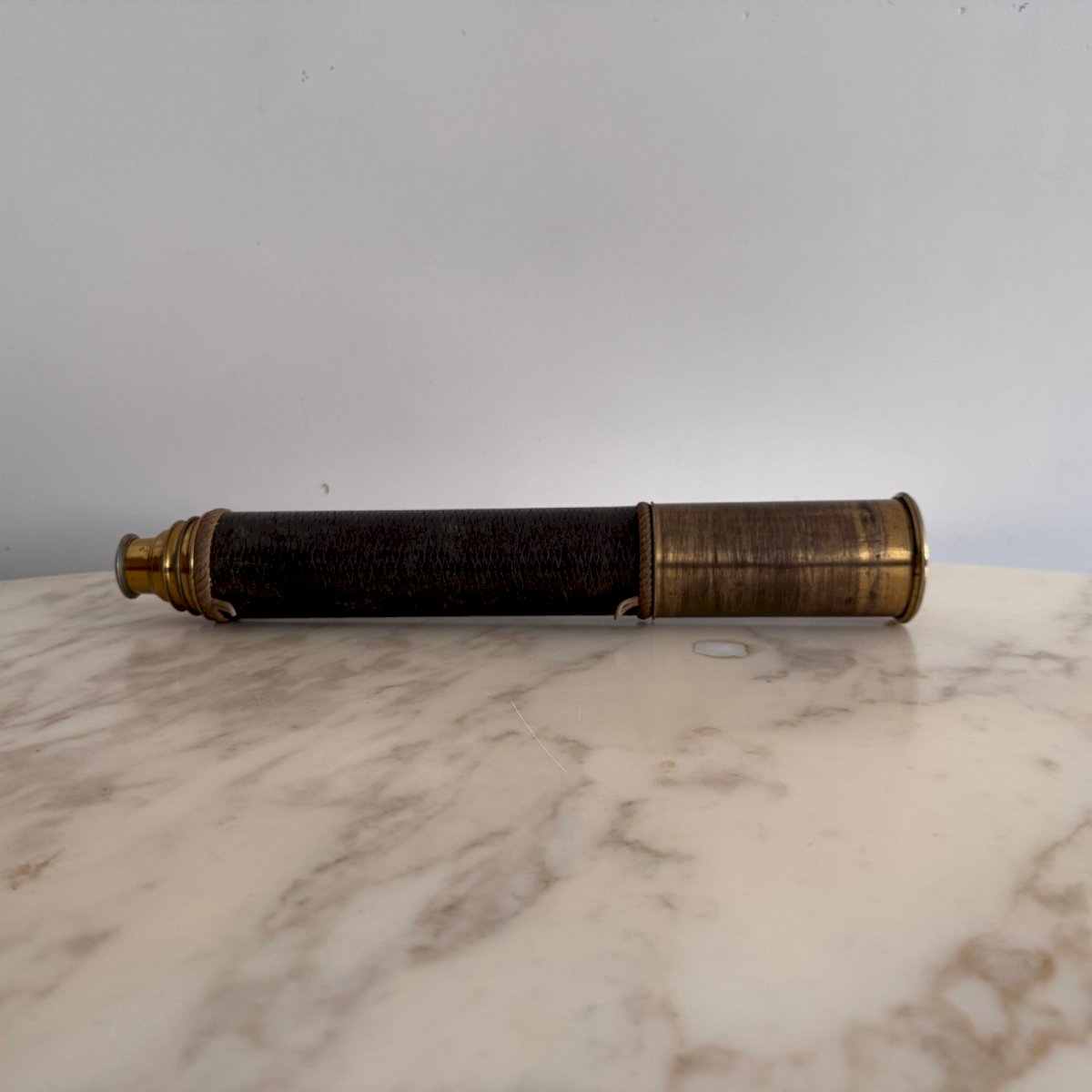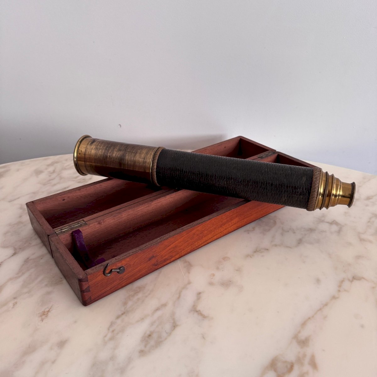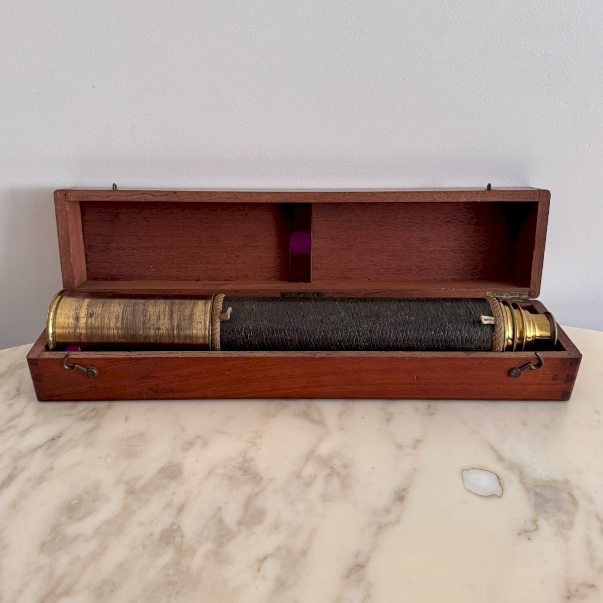 19th Century Marine Telescope in Leather and Brass with Mahogany Case M3694 This 19th-century marine telescope is in generally presentable condition. There are signs of wear due to use and slight oxidation on the brass; the optics need to be reviewed. Our photos allow you to appreciate the quality of the item. For the condition, please refer to the detailed photos. Feel free to zoom in. The photos are an integral part of the description. Dimensions: - Case Height: 8.2 cm Width: 43 cm Depth: 9.7 cm - Telescope Length: 40.3 cm Top diameter: 6.6 cm Base diameter: 3.5 cm P: 1621416 I am at your disposal for any questions. Country of origin: France Type: Showcase item, Decorative Origin: France Sub-type: Telescope Height: 8.2 cm Material: Leather and brass Length: cm Width: 43 cm