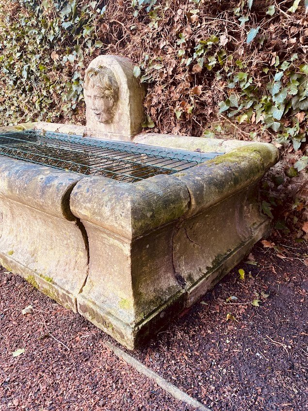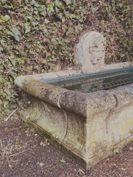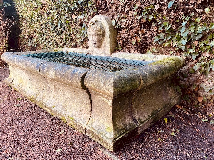 Outdoor stone fountain and basin Young boy's head with an open mouth allowing water to flow Large stone reservoir and its metal basin Good condition Dimensions H 102 x W 220 x D 113 cm Early 20th century For delivery, please request a quote Type: Garden, Outdoor decoration Period: 19th century and earlier Height: 102 Material: Stone Length: 220 Width: 113