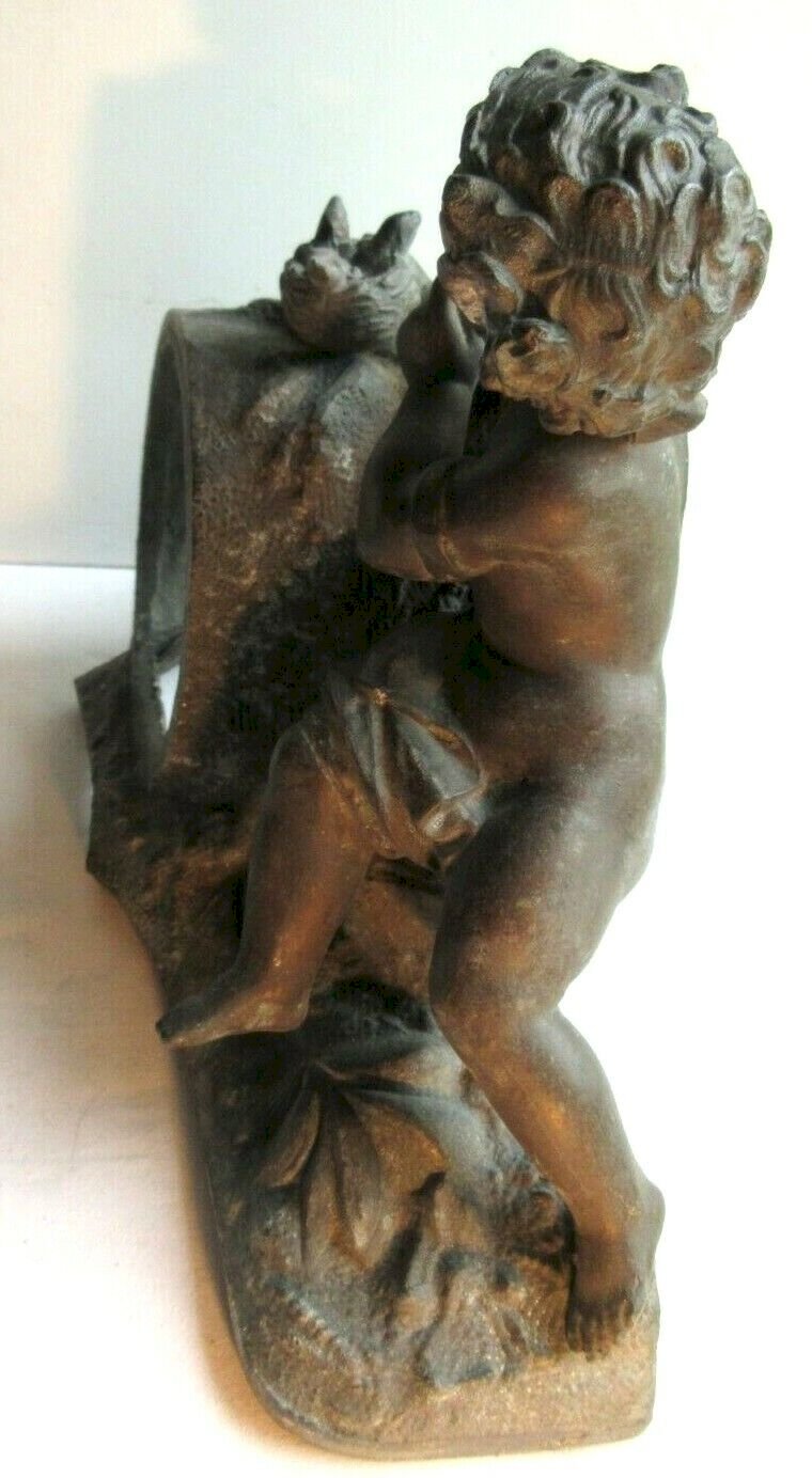 Worldwide sale. 19th century clock. The clock body in spelter represents a cherubic angel lying next to a bird's nest. Three chicks are in the nest. The mechanism space measures 9.5 cm in inner diameter and 11.5 cm in outer diameter. Depth: 8 cm. Dimensions: 26.5 cm by 9.5 cm. Height: 21 cm. Very good condition. Authenticity: Original. Type: Display object, Decorative. Origin: France. Subtype: Clock, Timepiece. Style: Napoleon III. Material: spelter.