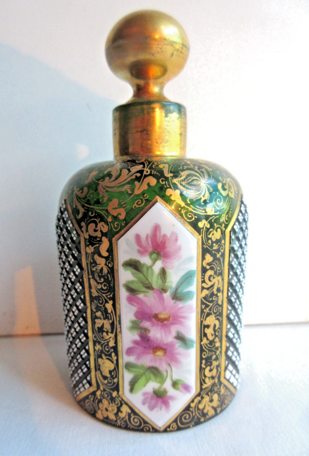Worldwide sale. 19th century perfume bottle. Beautiful antique green crystal perfume bottle adorned with 6 cabochons, 3 of which seem to be porcelain with a cascade of roses. The other 3 are engraved with fine latticework. The cap is gilded and spherical. No apparent signature but marked with 2X engraved on the bottom. The green color of this bottle appears translucent in the light. Good condition with wear on the gilding at the neck but nothing serious. Diameter: 6.5 cm. Height: 14 cm. Very beautiful antique bottle for collectors. Authenticity: Original Type: Showcase item, Decorative Origin: France Subtype: Bottle, Flask Style: Napoleon III Material: Crystal
