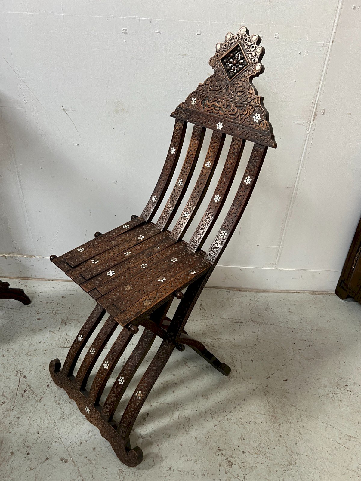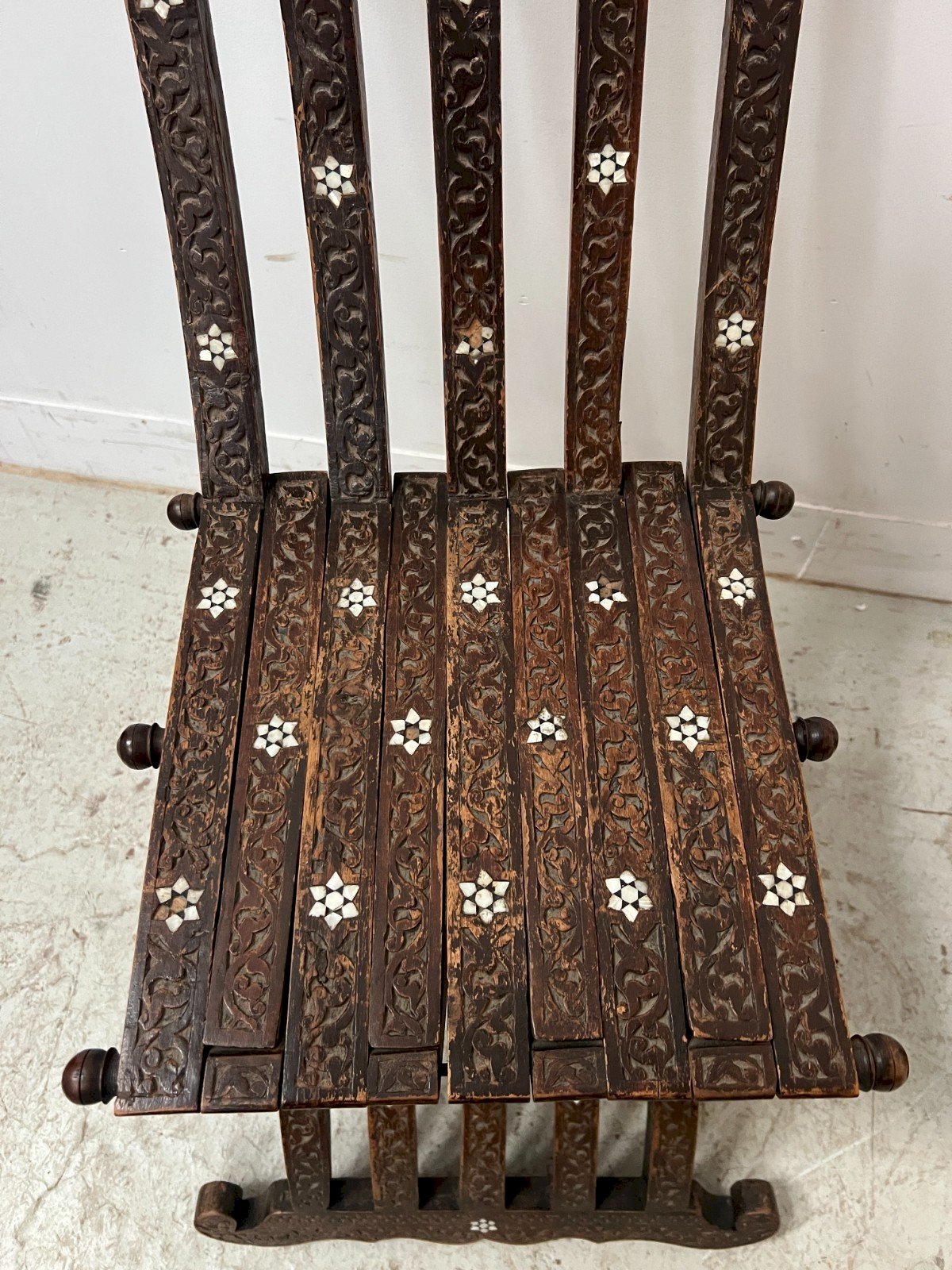Sitting room set in Syrian style, carved wooden furniture. The set includes two folding chairs with carvings and inlaid mother-of-pearl stars, a folding curule chair, and a carved wooden side table inlaid with mother-of-pearl. Some parts are missing and there have been old restorations; please see the photos. Dimensions: Chairs H 100 x L 35 x 33 cm; Side table H 92 x 40 cm on the side; Curule chair H 80 x L 65 x 53 cm. Period: Late 19th century. Type: Armchair. Period: 19th century and earlier. Country of origin: France. Height: 100. Style: Syrian. Material: Wood. Length: 33. Width: 35.