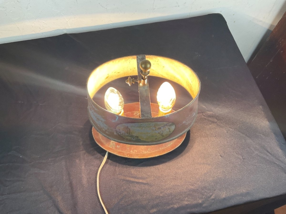 19th Century Two-Light Bouillotte Lamp in Polychrome Sheet Metal. Attention to condition. Height: 28 cm Width: 22.5 cm Type: Shade Period: 20th Century Design Subtype: Table Lamp Dominant Color: Bordeaux Material: Metal
