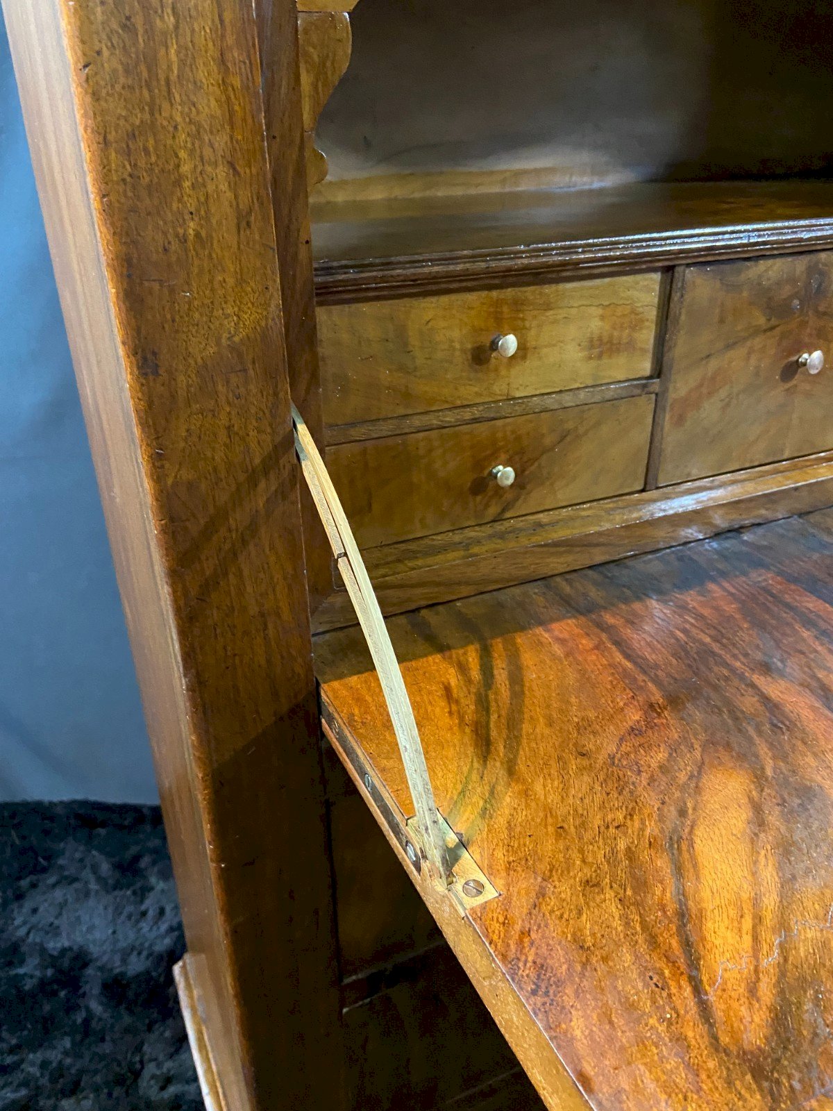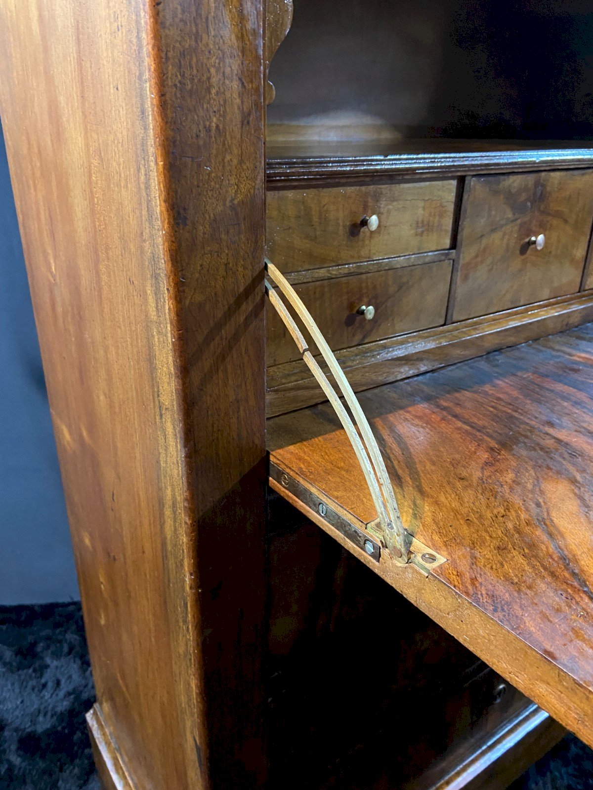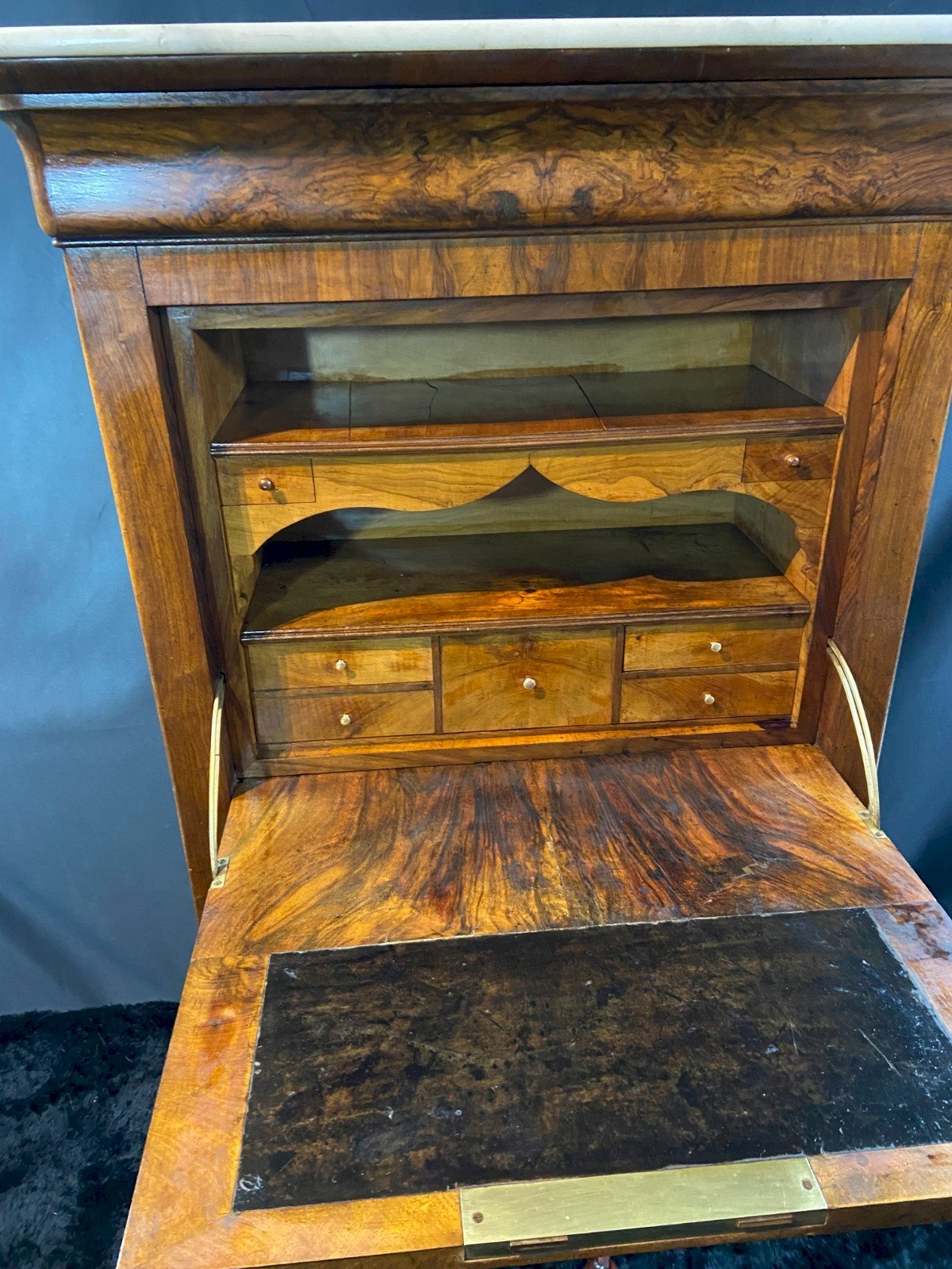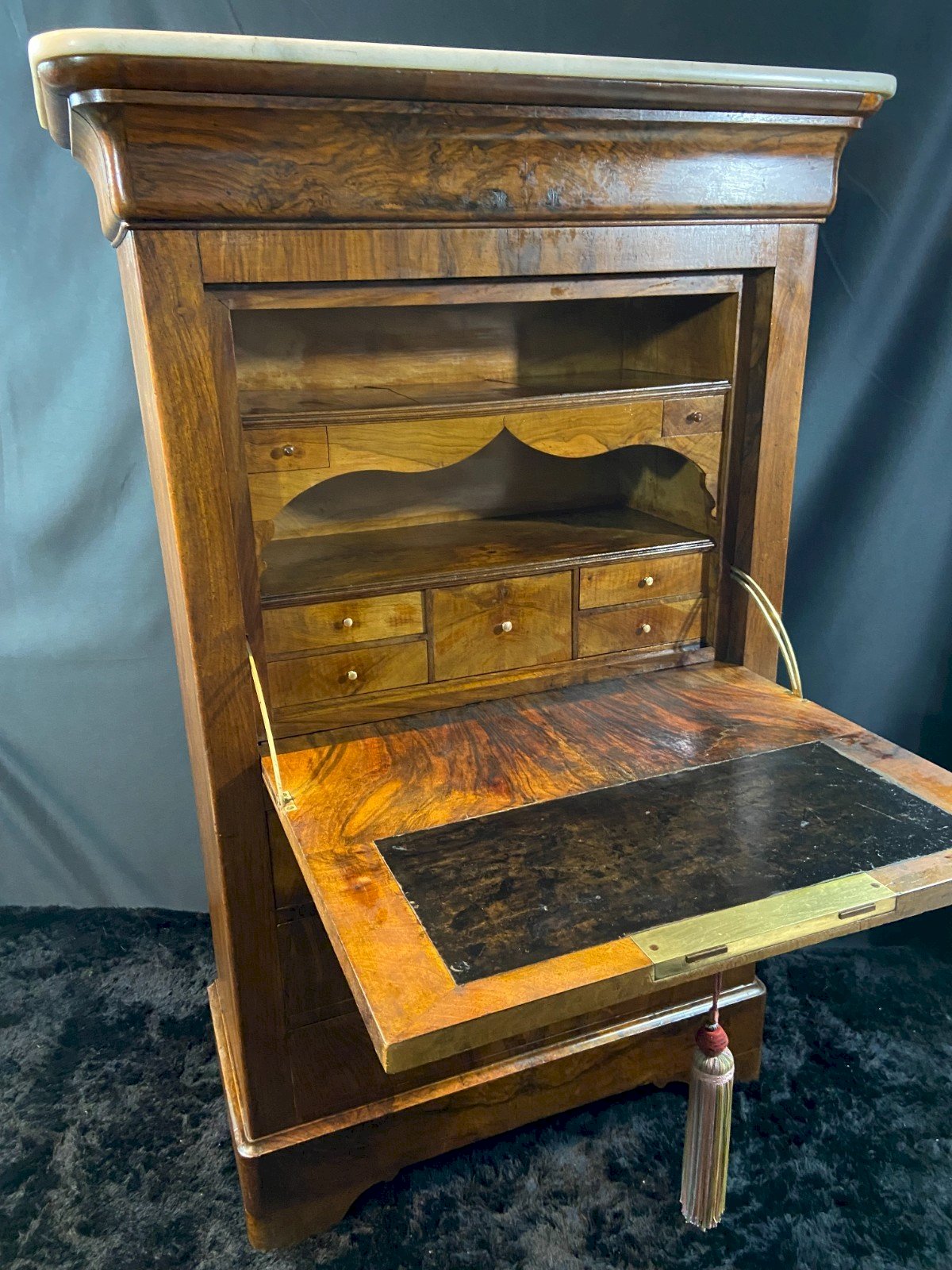 Secretary from the 19th century in walnut, Louis-Philippe period. Top section opening to a drawer. Central section with a flap held by two bronze hinges, revealing a niche with 7 drawers. Bottom section opening to three drawers. Original white marble top. Maximum dimensions: Height 150.5 x 96.2 x 44 cm. Comes with two working keys. I would like to point out the presence of old ink stains, discreet veneer cracks, and other usual marks. One of the hinges has a discreet small accident that does not affect its functional or aesthetic qualities. Key tassel not provided. Free pickup possible in the historic center of Bourges (Notre-Dame Church). - Orders are delivered to the foot of your home. - Dimensions are always specified: no disputes will be accepted if the furniture does not fit in your staircase or if your ceiling is too low, for example. - Specific delivery rates apply for islands: Corsica, Sardinia, Sicily, Balearics... - Delivery times are generally very short for all major urban areas. - These may be extended for extremely isolated destinations and particularly poorly served areas: do not hesitate to contact me beforehand. Type: Secretary Period: 19th century and earlier Country of origin: France Style: Louis Philippe Material: Walnut.
