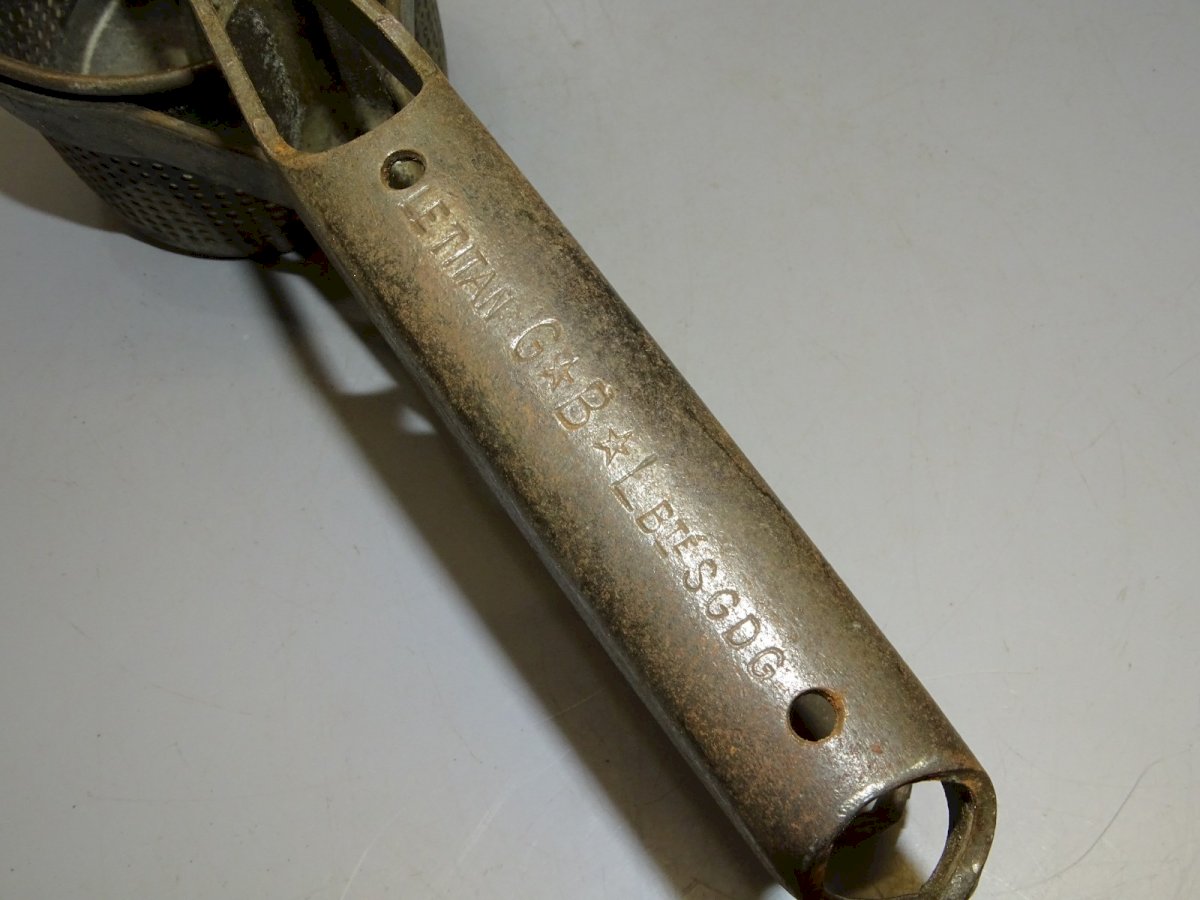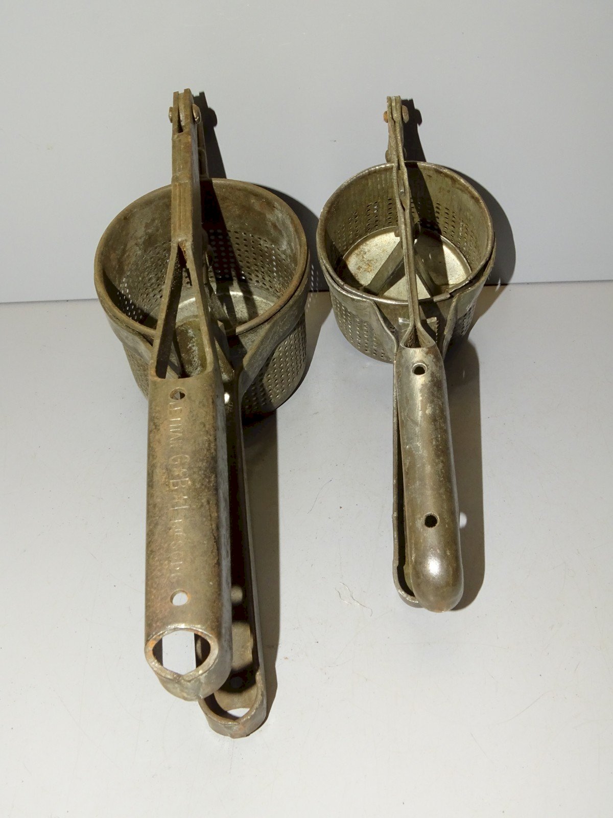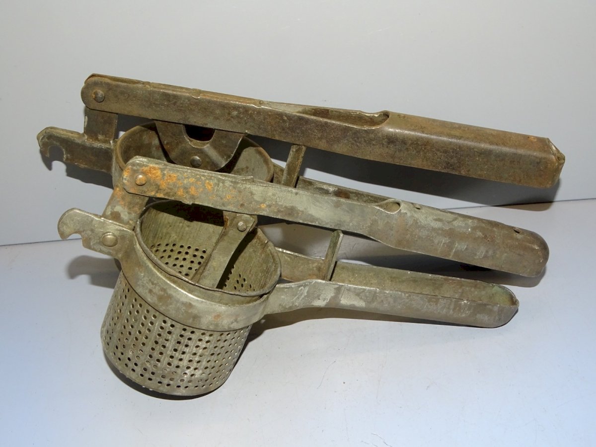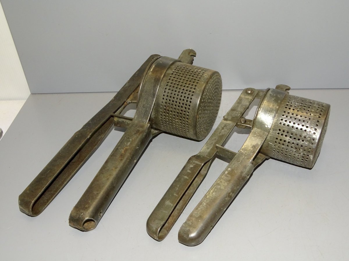 2 antique potato mashers - the largest is by the brand Le Titan G*B*L patented SGDG - it is in very good condition - the smallest has no brand and the pierced part is deformed and has distortions and small cuts on the edge (see photos) - finds, taken out of a barn, to be cleaned - Ref.43040425/195 - for an antique kitchen decor Length 33.5 cm - Diameter 10 cm - Height 8.2 cm - Total Height 15.5 cm - and Length 27.5 cm Diameter 8.5 cm - Height 7.5 cm - Total Height 12.4 cm - Weight 1.650 kg - SHIPPING via Mondial Relay OR Colissimo available upon request. PACKAGING GUARANTEED to be very protective. PLEASE take a GOOD LOOK at ALL the PHOTOS as THEY ARE AN INTEGRAL PART of the DESCRIPTION and ALLOW you to SEE the ITEM AT ITS BEST - Condition: Used: Item that has been used. Item showing some superficial signs of wear, ...Used: Item that has been used. Item showing some superficial signs of wear, fully operational and functioning correctly. It may be a demonstration model or an item returned to the store after a short period of use. any imperfections. Brand: LE TITAN.