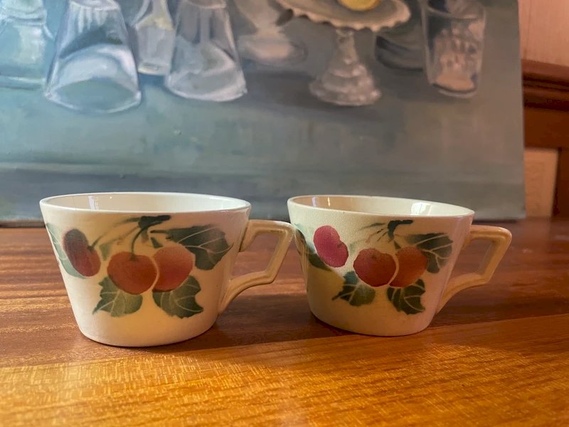 2 antique coffee cups (1920s) "The Cherries" ? Badonviller pottery One of the cups has a crack but is still waterproof Height 5cm, diameter 8cm