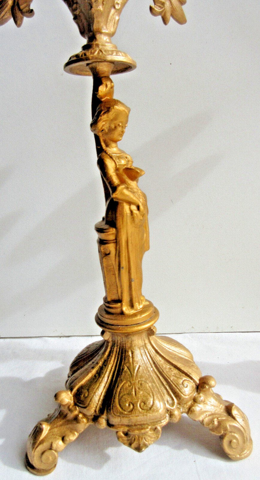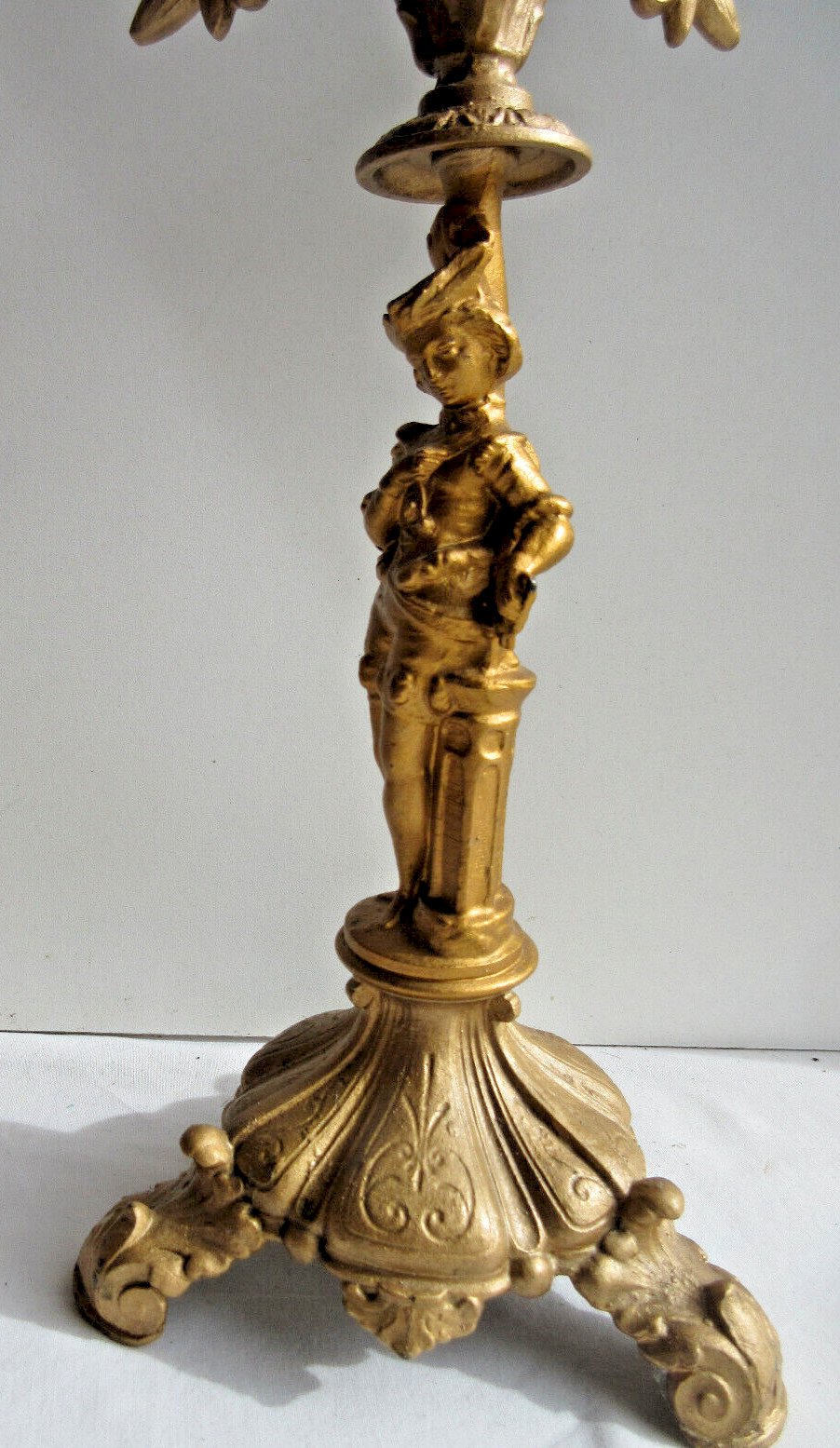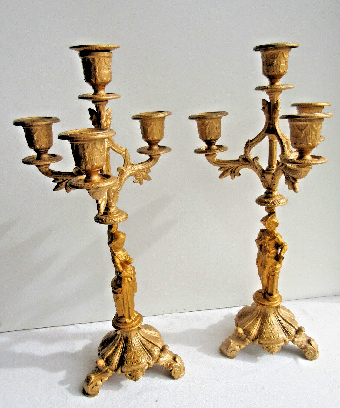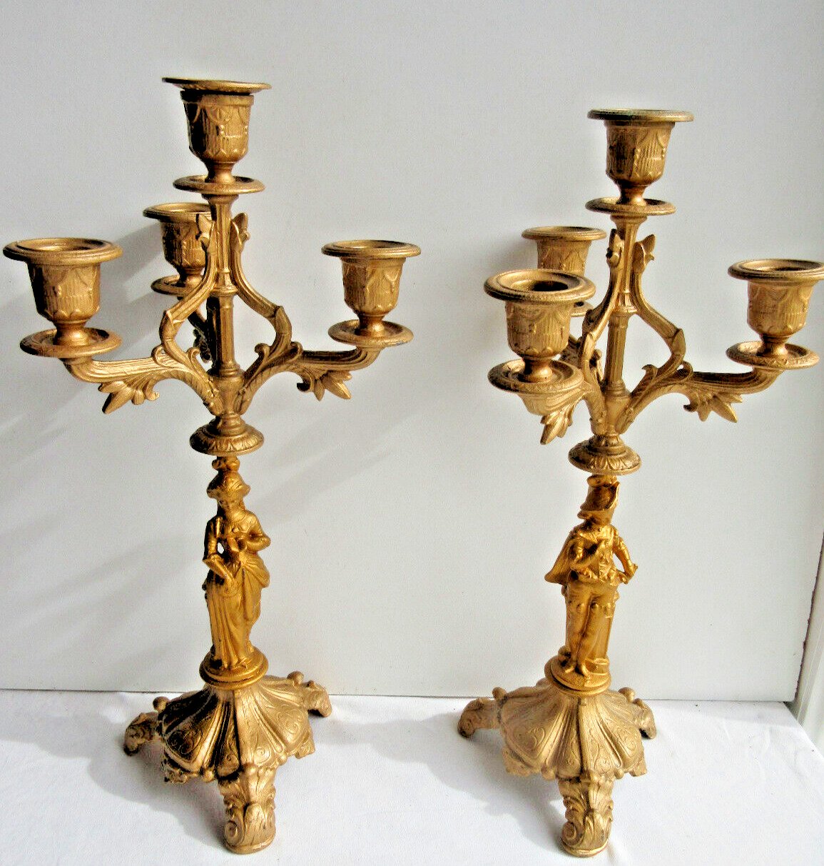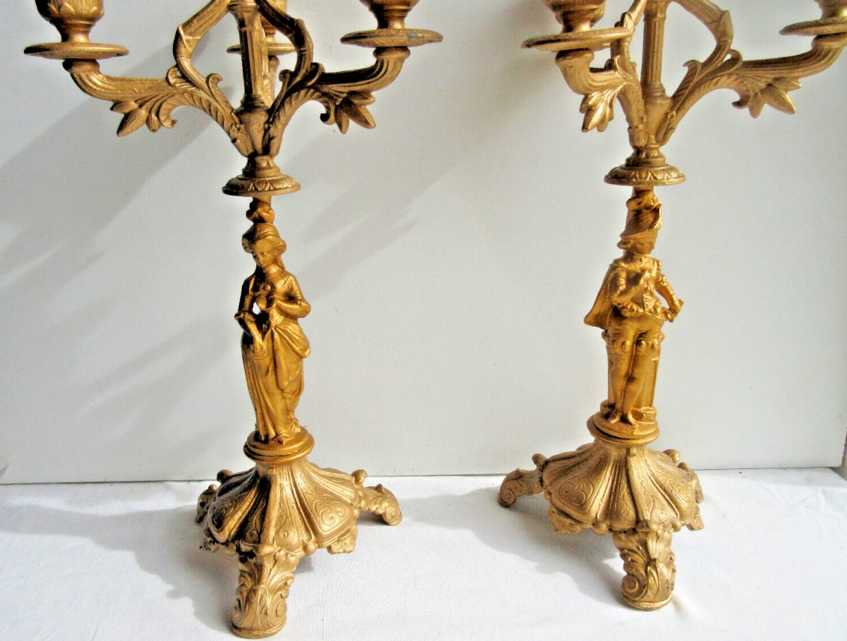 Worldwide sale. 2 Napoleon III Candelabras. Pair of gilded zinc candelabras representing 2 caryatids, Male - Female, each supporting a set of 4 candle holders. Each candle holder has its own drip pan. The base features a round pedestal on 3 sculpted feet with acanthus leaves. Diameter: 16 cm. Height: 39 cm. Good condition. Nice set for collecting or gifting. The photos complete the description. Authenticity: Original Type: Showcase item, Decorative Origin: France Sub-type: Candle holder, Candelabra Style: Napoleon III Material: gilded zinc