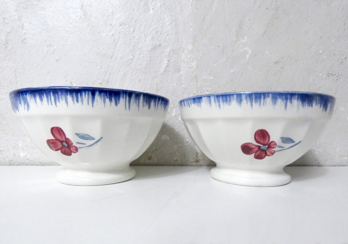 Digoin. Model "Mary Lou". 2 old small bowls, made of earthenware. Height: 6 cm. Diameter: 10.5 cm. Both are in excellent condition. Condition: Used item that has been utilized. Item shows some superficial signs of wear, fully operational and functioning properly. It may be a demonstration model or an item returned to the store after a short period of use. Any imperfections may be present. Color: Multicolor Type: Bowl Brand: Digoin Country of origin: France Material: Ceramic Pattern: Flower Theme: Antique