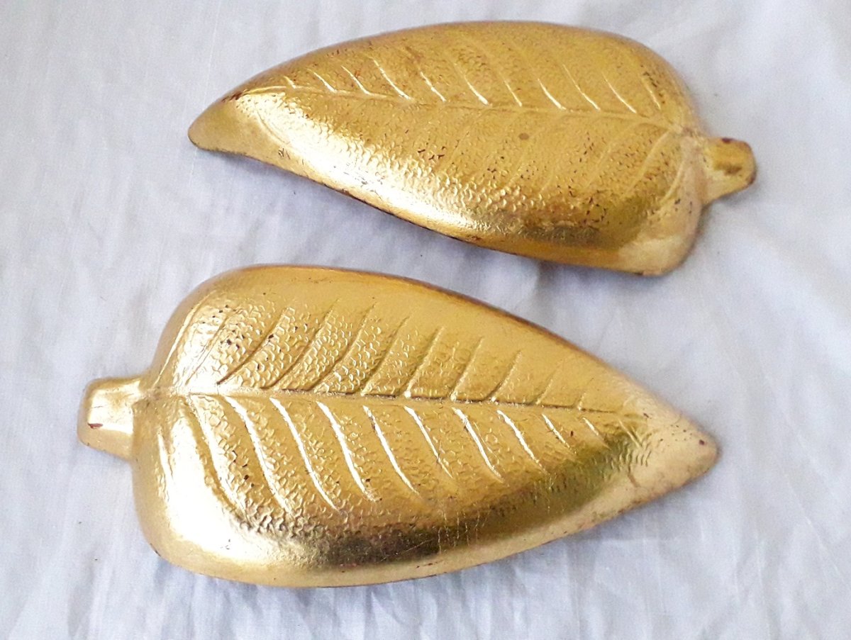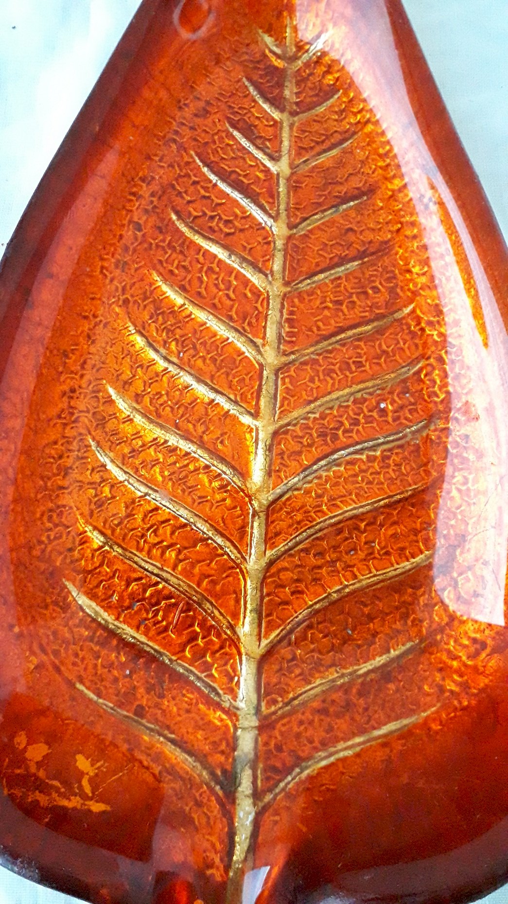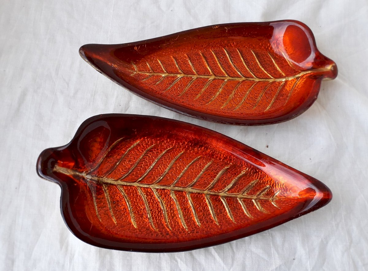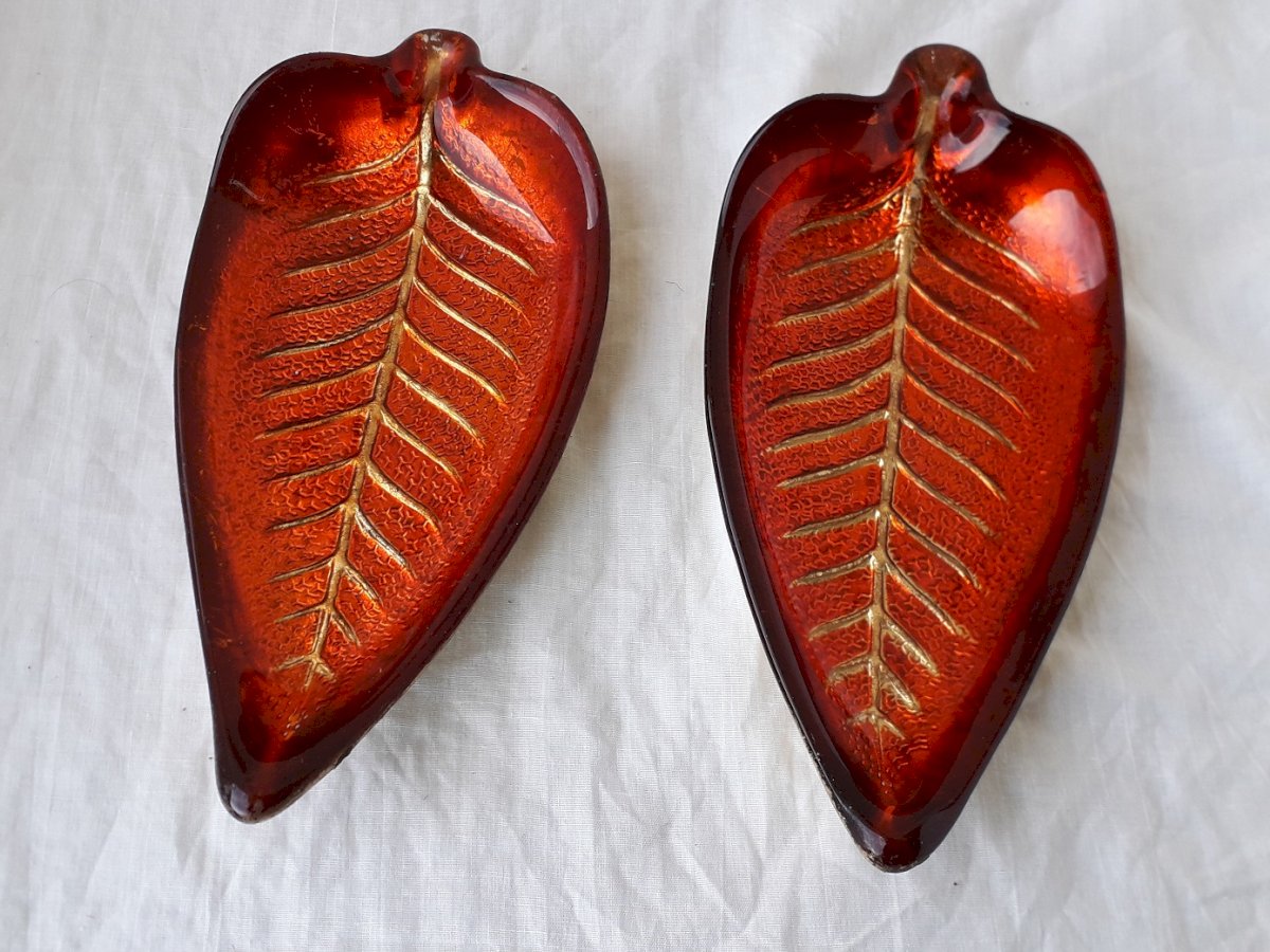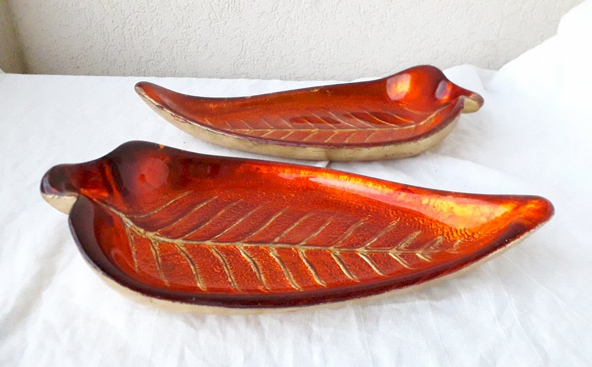 2 orange bowls, leaf-shaped, made of glass, without brand or signature, suitable for use as an appetizer set or a pocket tray.