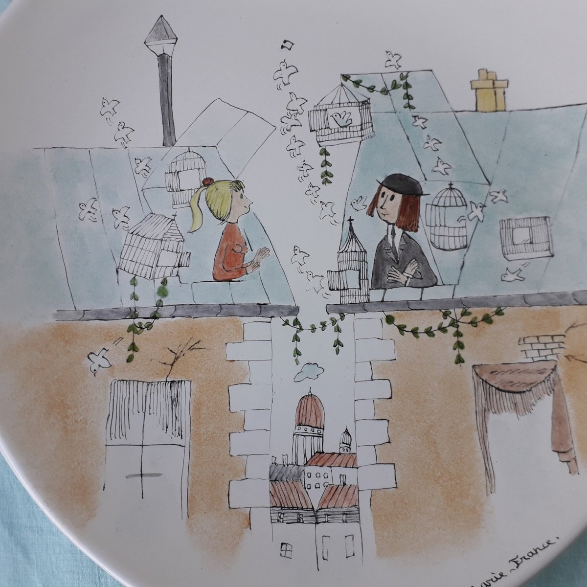 2 decorative plates, hand-painted, decorated with Peynet's lovers.