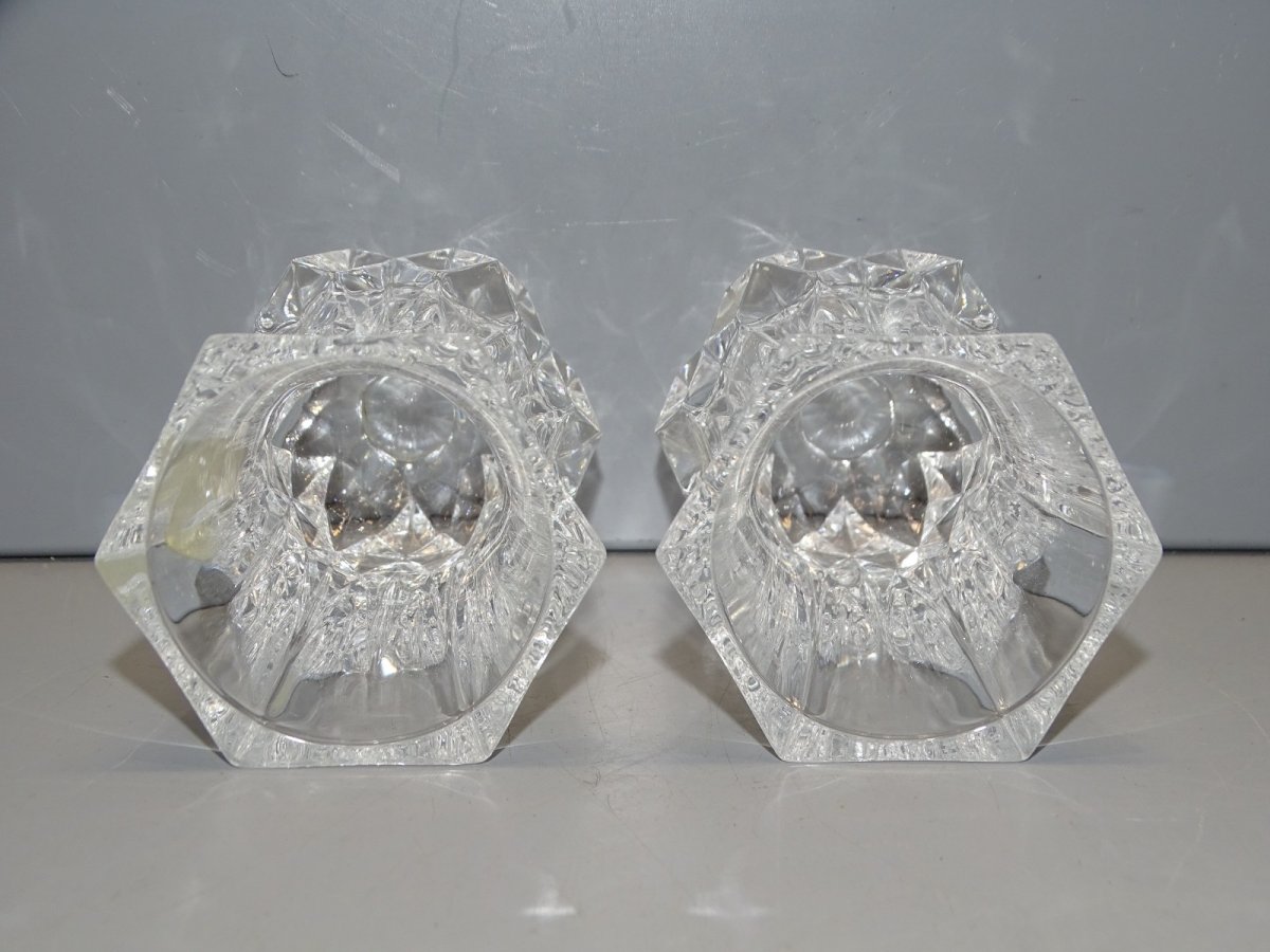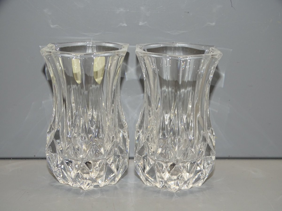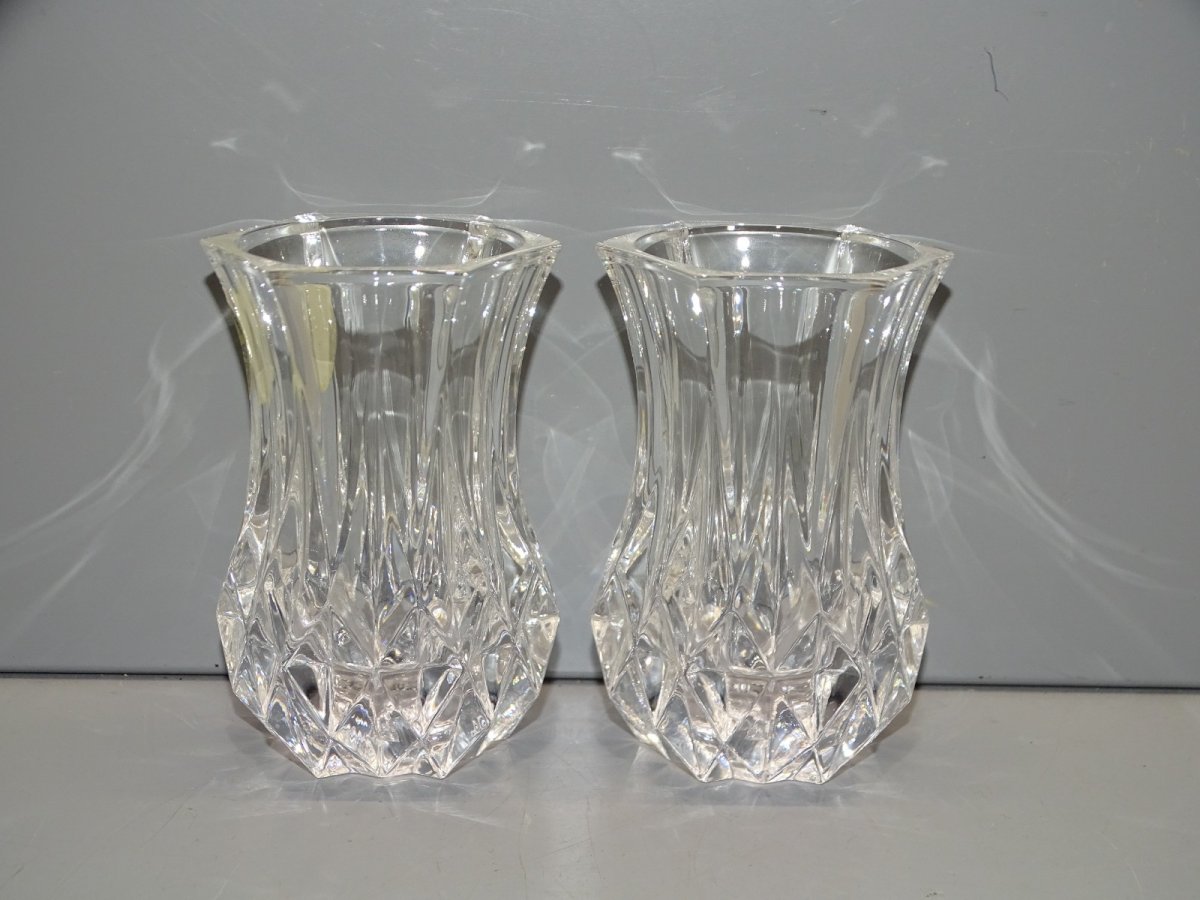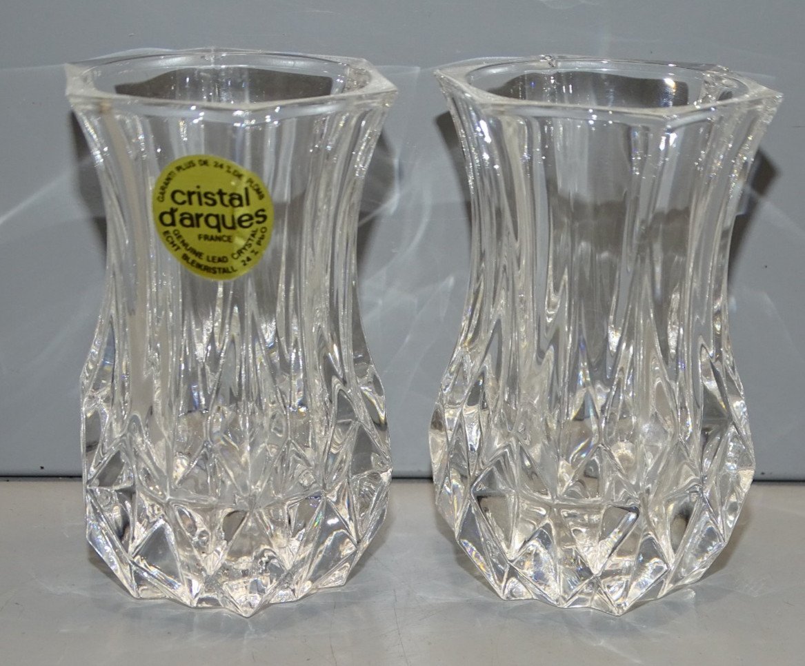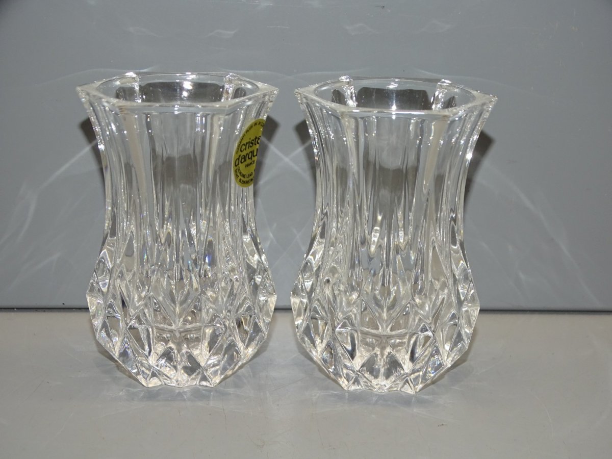 2 Pretty little crystal vases for violets from Cristal d'Arques - in good condition - finds juice (see photos) - Ref. 1V251219/116 - Height 8 cm - Top 4.7 x 4.6 cm - Diameter 5.2 cm - Weight 360 g - To contact me, my email address: SHIPPING POSSIBLE VIA MONDIAL RELAY or COLISSIMO upon request VERY GOOD PACKAGING GUARANTEED PLEASE TAKE A GOOD LOOK AT ALL THE PHOTOS as THEY ARE AN INTEGRAL PART OF THE DESCRIPTION and ALLOW YOU TO SEE THE ITEM BEST WITH ITS POSSIBLE SMALL DEFECTS -