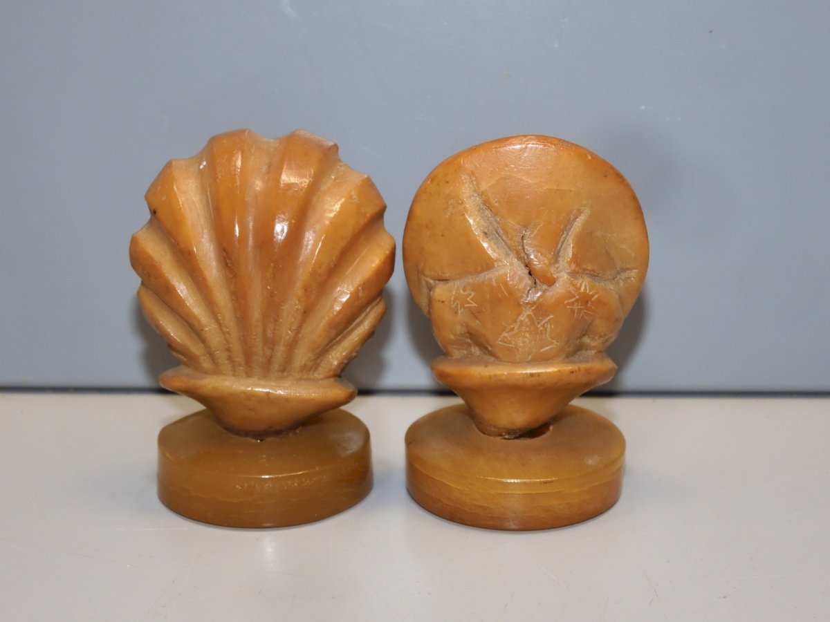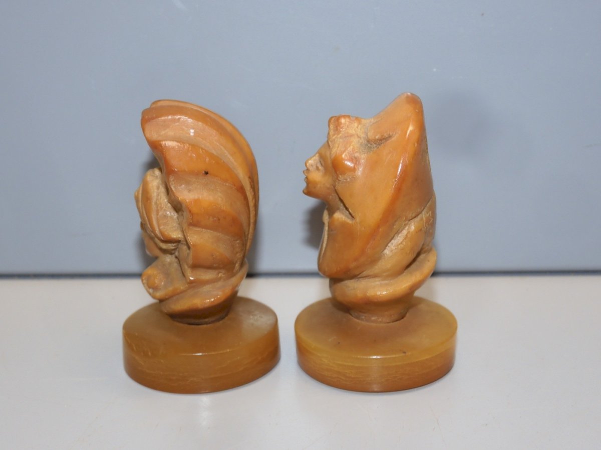 2 ancient statuettes subjects corozo Harlequin portraits or other - the face screw coming out of the star does not hold well (wears) - 1 small chip on the lower edge of each base + minor wear (photos) otherwise in nice used condition, found items, attic finds - Ref. 1V240216/195 Height 5.4 cm Length 4 cm Base diameter 3.2 cm and Height 5.5 cm Length 3.6 cm Base diameter 3.2 cm - Weight 62 g To contact me my email address: SHIPPING POSSIBLE VIA MONDIAL RELAY or COLISSIMO on request VERY GOOD PACKAGING GUARANTEED THANK YOU for TAKING A GOOD LOOK at ALL the PHOTOS as THEY ARE AN INTEGRAL PART of the DESCRIPTION and ALLOW to SEE the ITEM AT BEST with ITS POSSIBLE SMALL DEFECTS - Type: Showcase item, Decorative Origin: France Sub-type: STATUETTES Material: COROZO