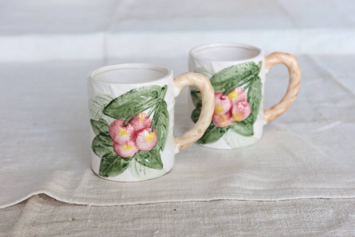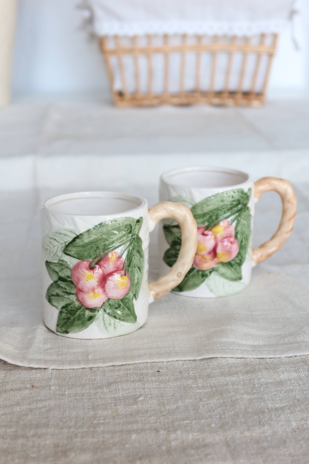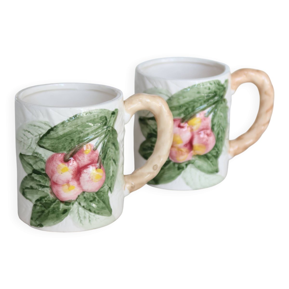 Charming pair of ceramic barbotine cups, decorated with hand-painted cherries and leaves in relief.