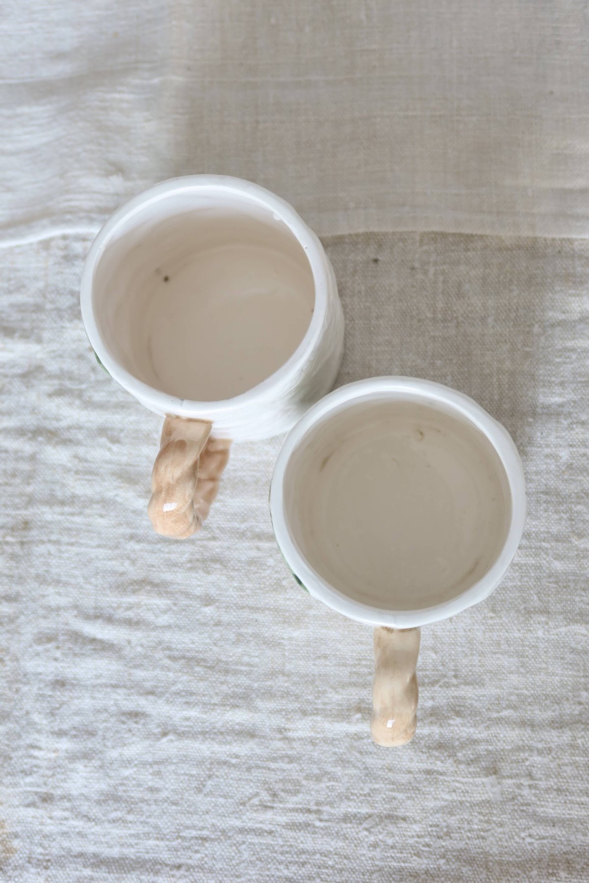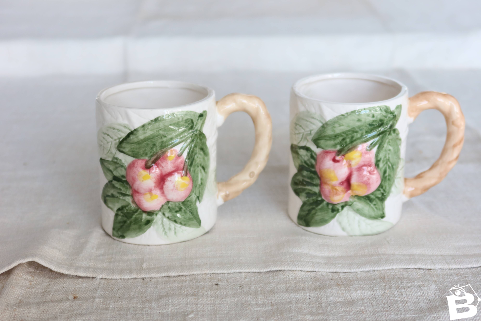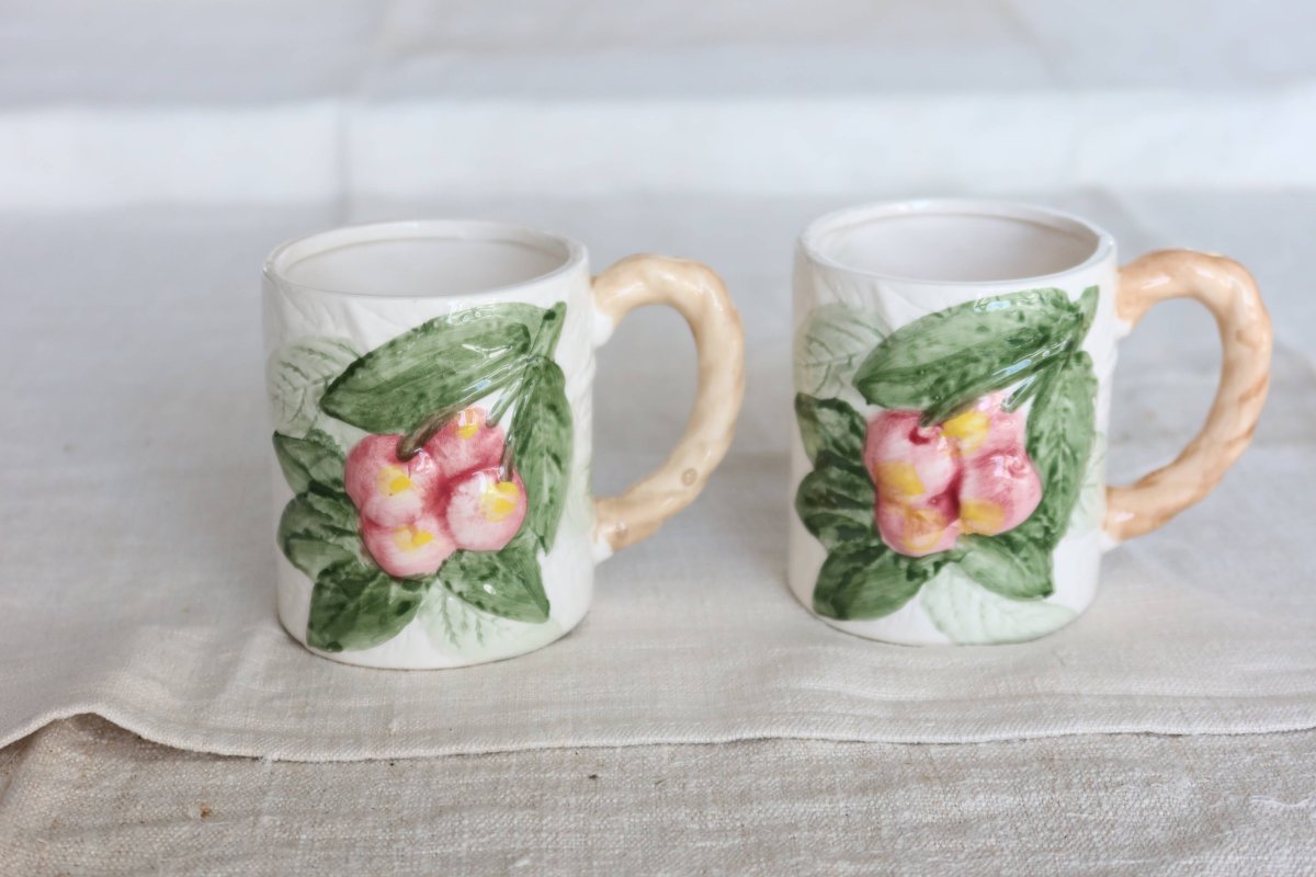 Charming pair of ceramic barbotine cups, decorated with hand-painted cherries and leaves in relief.