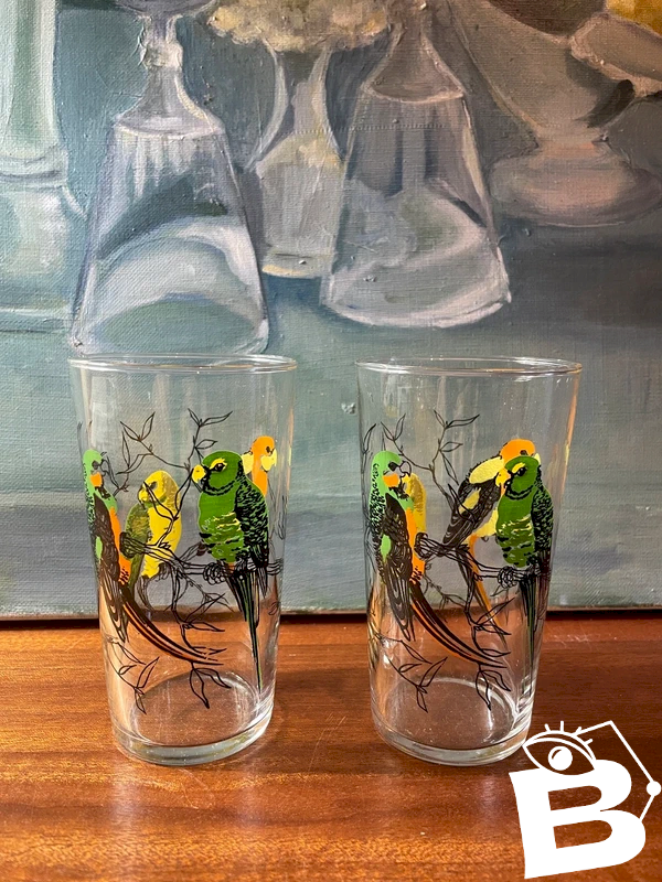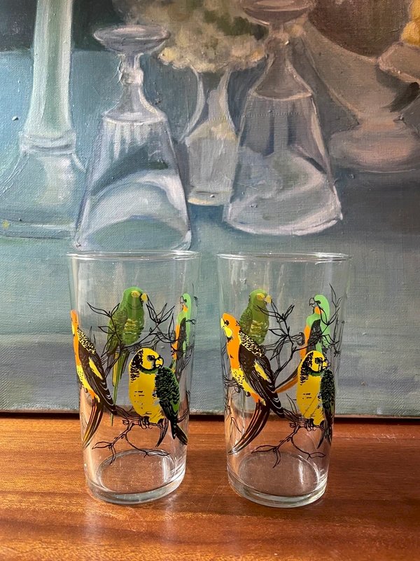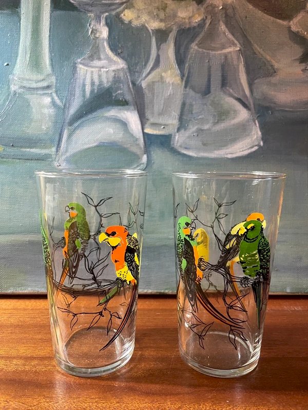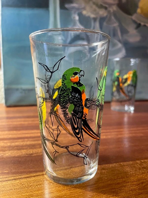 Set of 2 identical glasses with a spinning design of 4 different parrots.