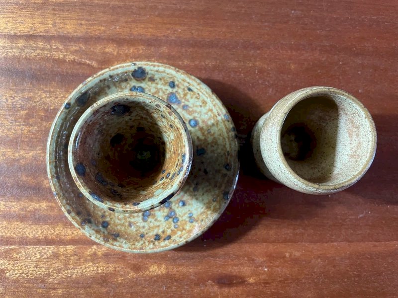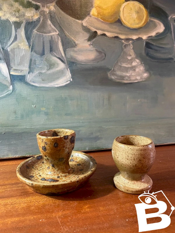 pyrite stoneware egg cup, signed Baudat? vintage ceramic craft pottery