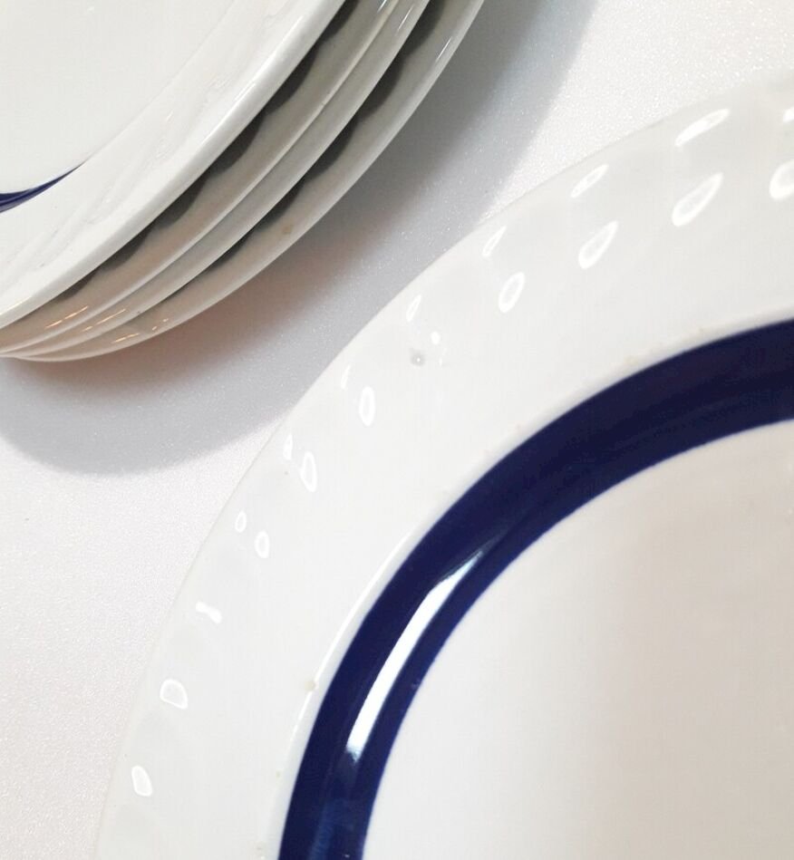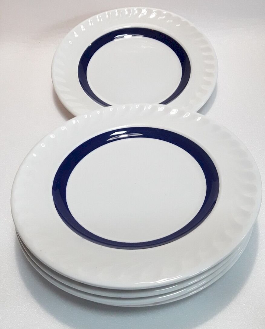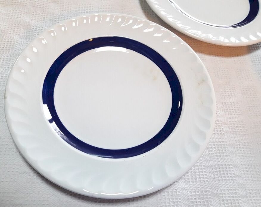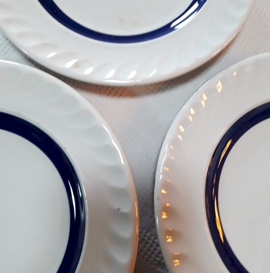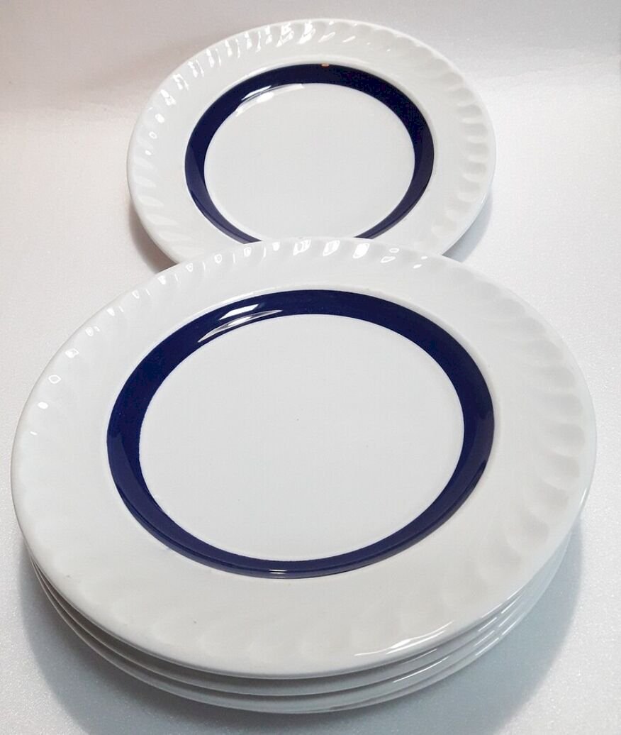 Suite de 5 assiettes à dessert, liseré bleu foncé, profond, bleu cobalt, en bel état,