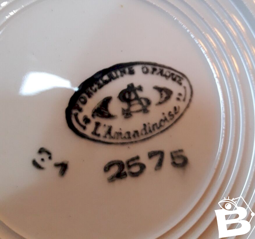 Inscription porcelaine opaque L'Amandinoise entrelacs A et S. En bel état, à noter tout de même un fêle et un éclat sur une (pris en photo), un trait dans le contour bordeaux (sous le vernis), et deux qui ont un trait, défaut de cuisson, sans conséquences.