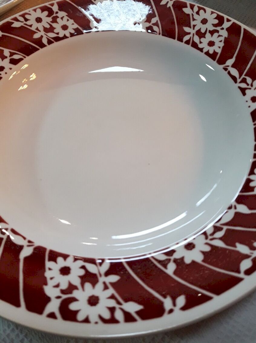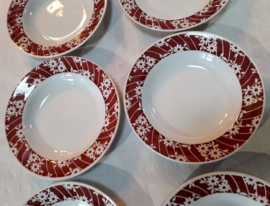 Lot de 6 assiettes creuses L'Amandinoise blanches et bordeaux à décor floral.
