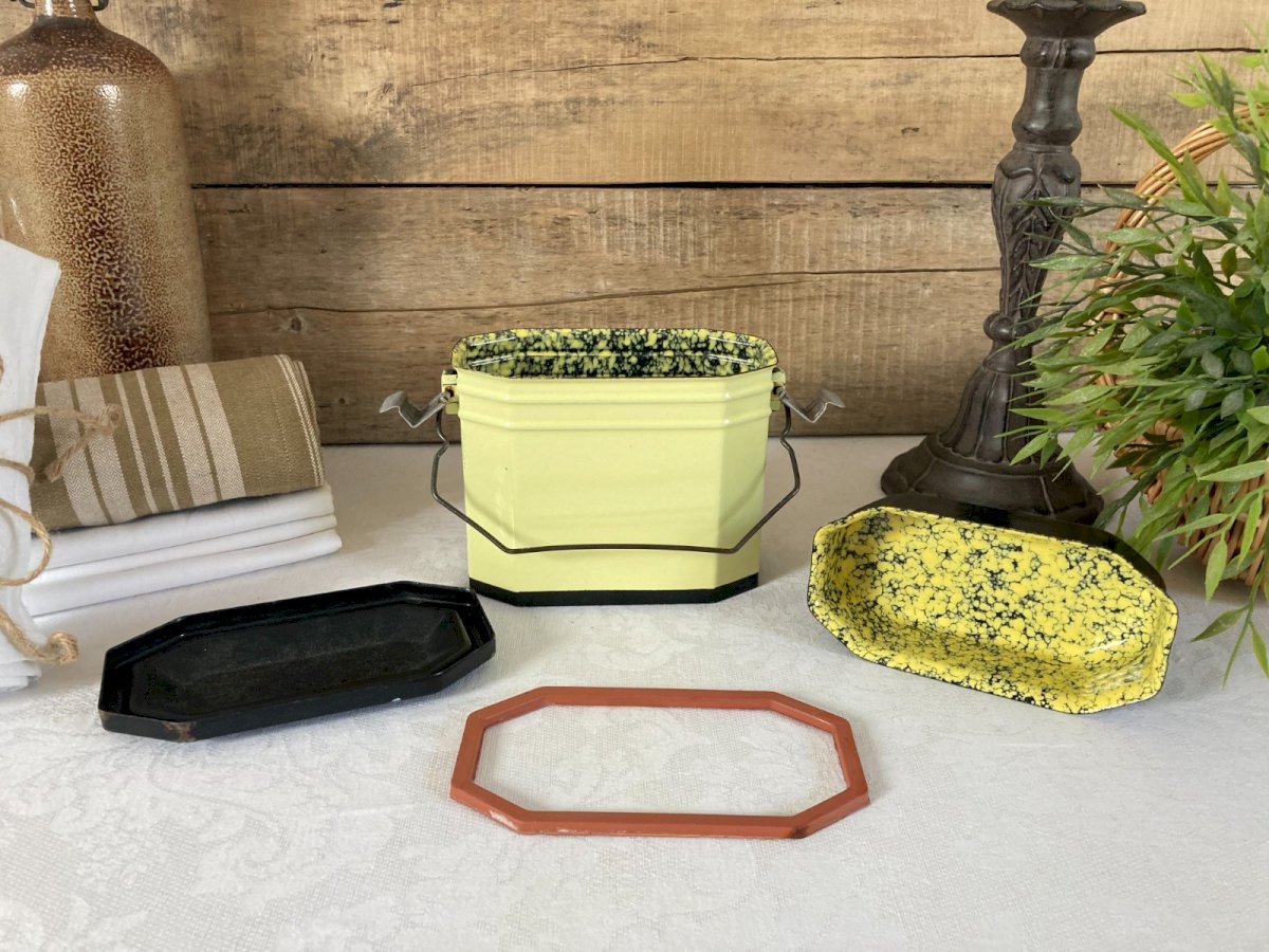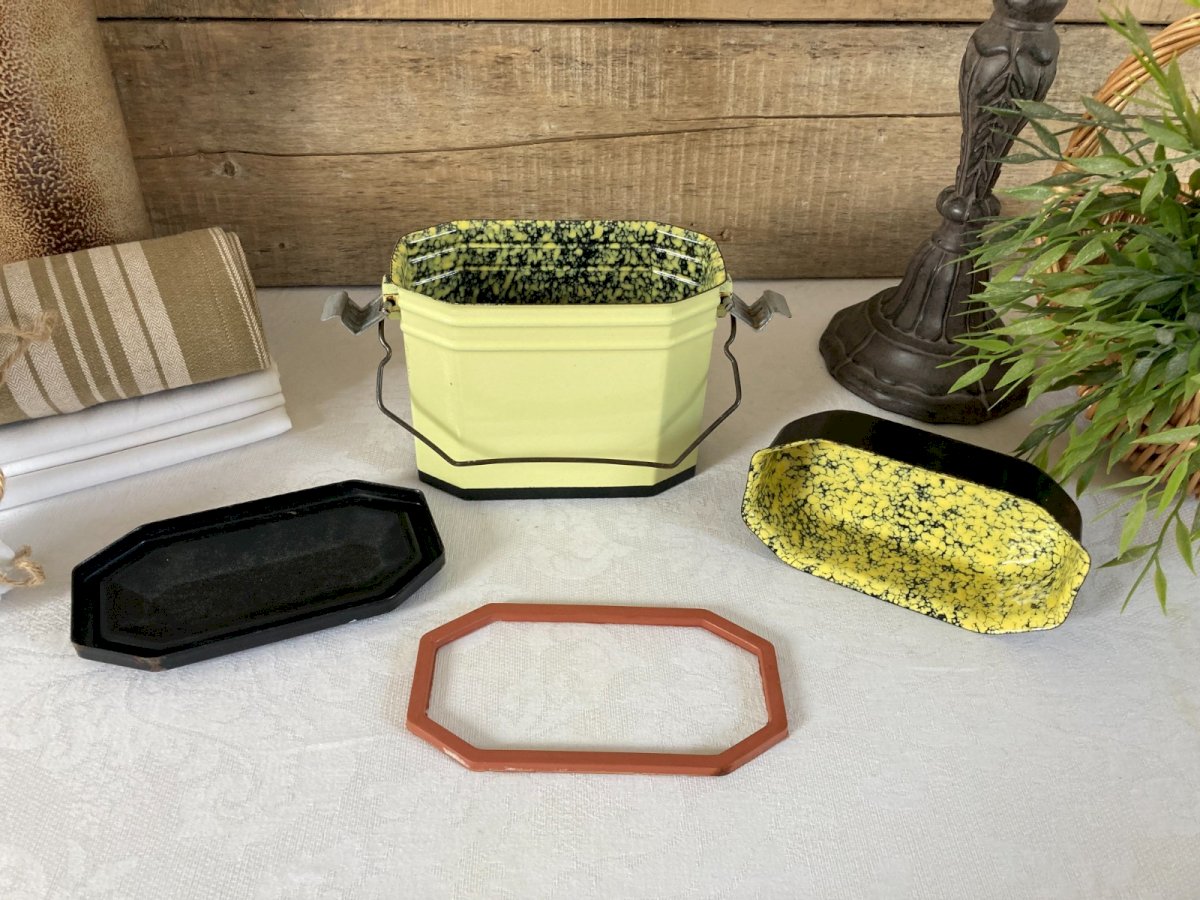⚜️ Vintage Enamel Worker's Construction Bowl ⚜️ Yellow and Black Color Height 12 cm, Length 15 cm Country of origin: Metropolitan France Material: Enamel