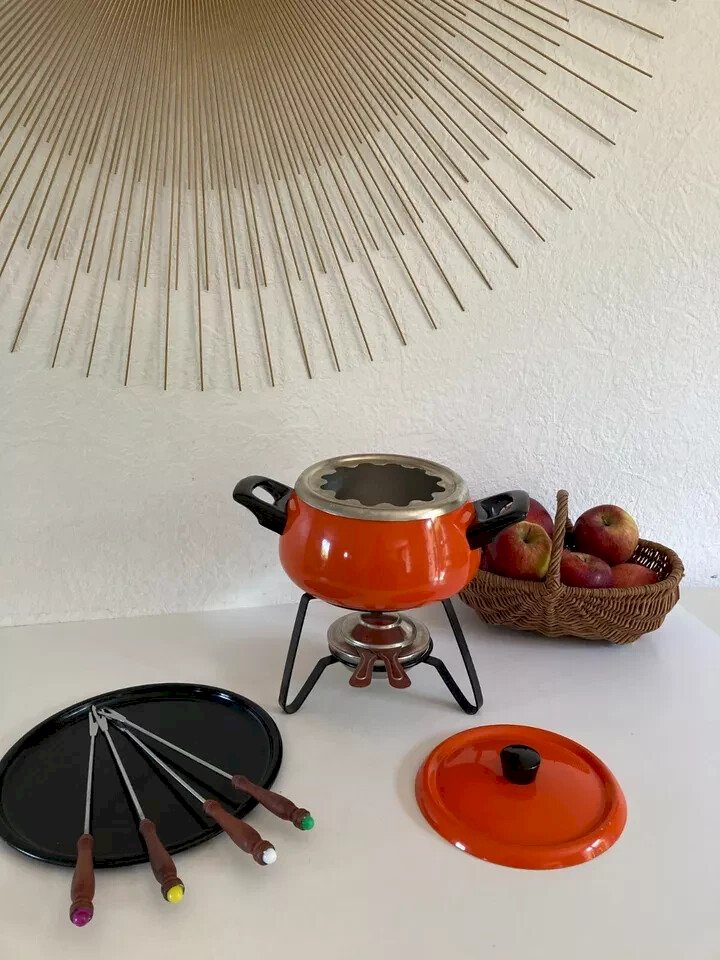 23 ⚜️ Vintage Orange Fondue Set Burgundy Condition: Used: Item has been used. Item shows some superficial signs of wear, ...Used: Item has been used. Item shows some superficial signs of wear, fully operational and functioning correctly. It may be a display model or an item returned to the store after a short period of use. any imperfections. Color: Orange Country of origin: France