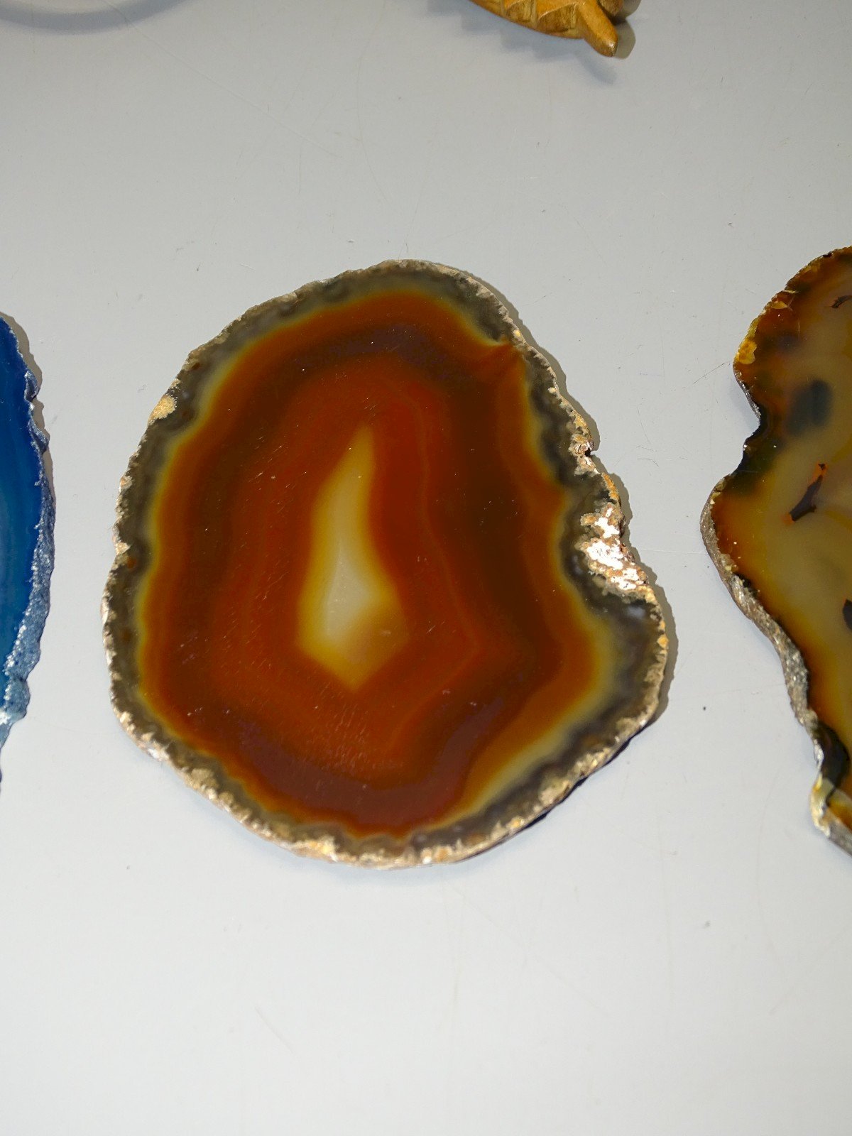 3 Beautiful slices of agate in 3 different colors: blue, rust, and brown - with some signs of wear - (see photos) - in good used condition, attic find - Ref.: 1V240718/403 - Blue: 12 x 5 cm - Rust: 9.3 x 6.4 cm and Brown: 10.4 x 9 cm - Weight 0.175 kg - SHIPPING POSSIBLE VIA MONDIAL RELAY or COLISSIMO upon request, VERY GOOD PACKAGING GUARANTEED - PLEASE TAKE A GOOD LOOK AT ALL THE PHOTOS as THEY ARE AN INTEGRAL PART OF THE DESCRIPTION and ALLOW YOU TO SEE the ITEM AS BEST AS POSSIBLE with ITS POSSIBLE SMALL DEFECTS - Condition: Used: Item has been used. Please refer to the seller's description for more details... Used: Item has been used. any possible imperfections. Type: Agate