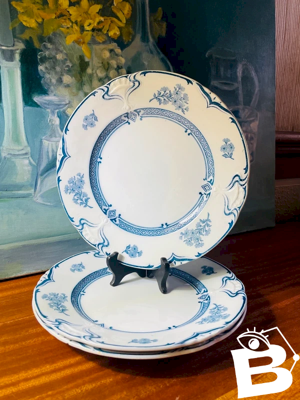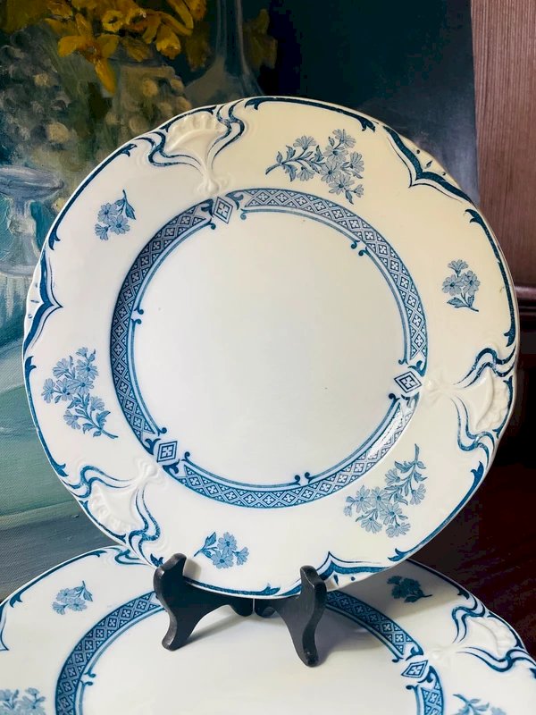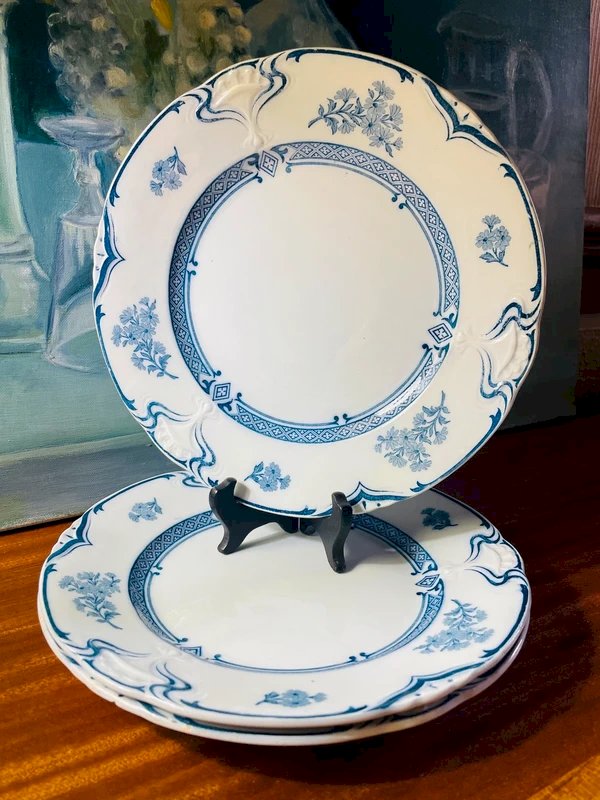 3 large flat plates Terre de Fer "Manon" Faïencerie St-Amand & Hamage Blue Cyan Diameter 26cm (Note a chip under one of the plates; not visible from the top)...