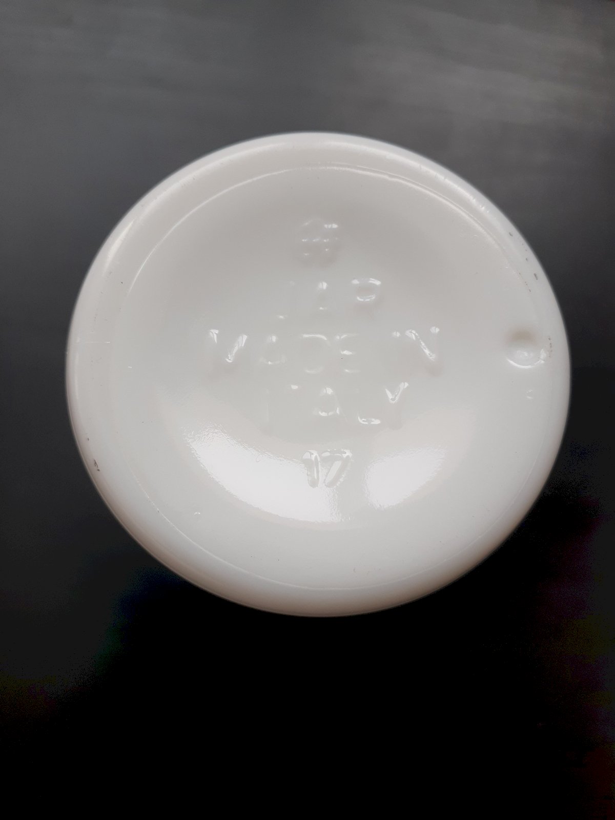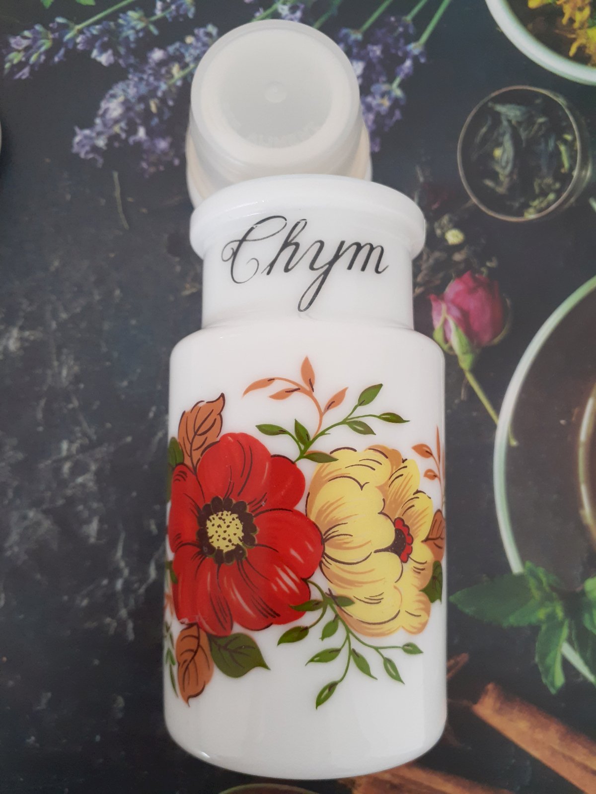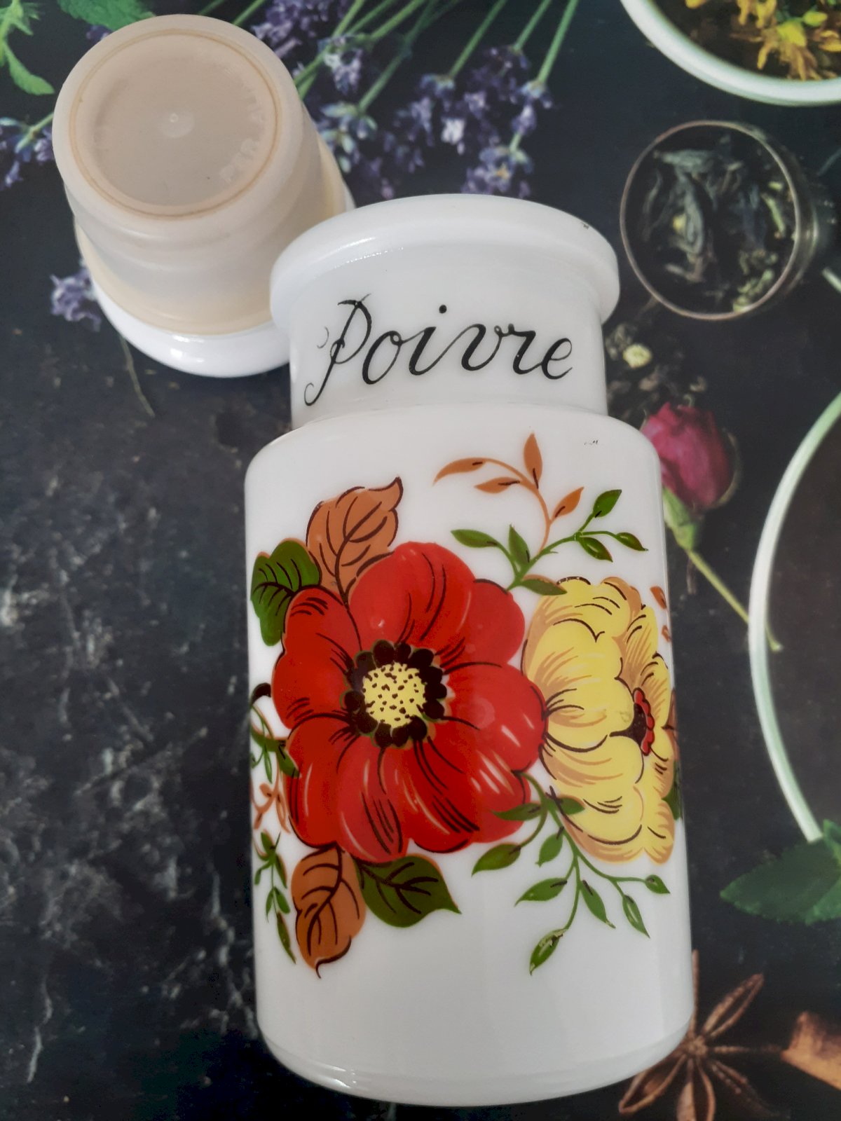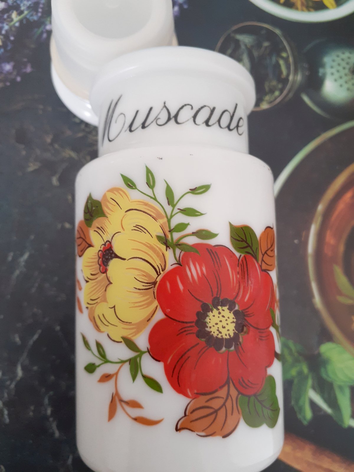 3 nice white opaline pots with the inscriptions Nutmeg, Pepper, and Thyme, featuring red and yellow flower patterns.