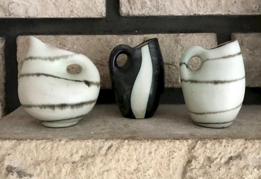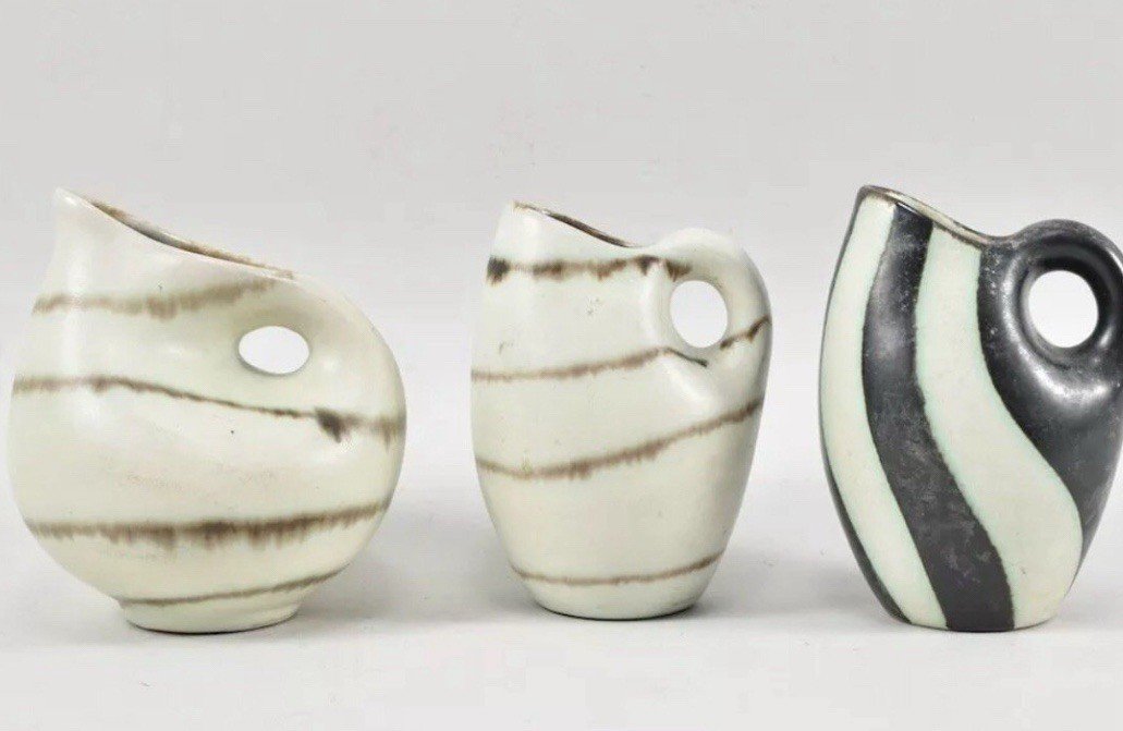 Three small decorative designer ceramics numbered with the unfortunately illegible artist's stamp. Total weight 510.10g. Height of all three 10cm. Circumference approximately 28, 21, and 21cm. Authenticity: Original. Brand: Vintage Design. Period: 20th-Century Design. Subtype: Vase. Country of origin: Unknown. Material: Ceramic. Style: 1970s.