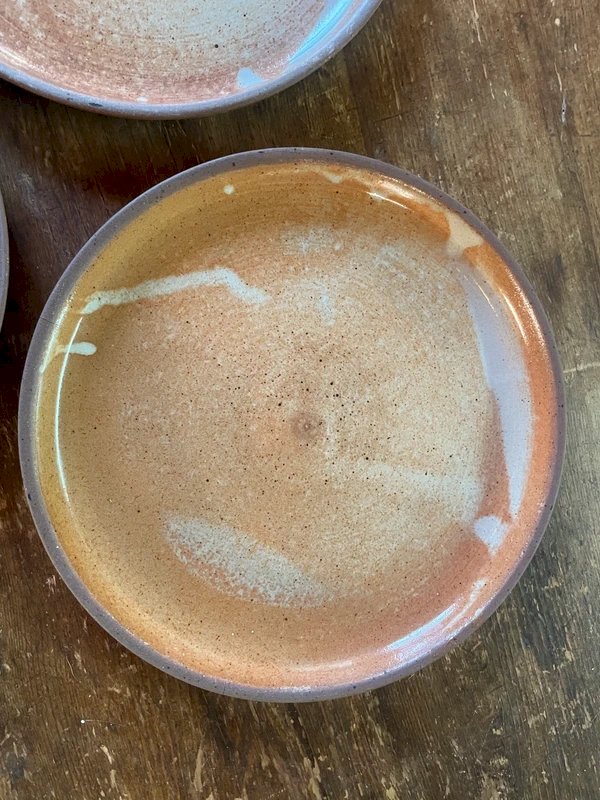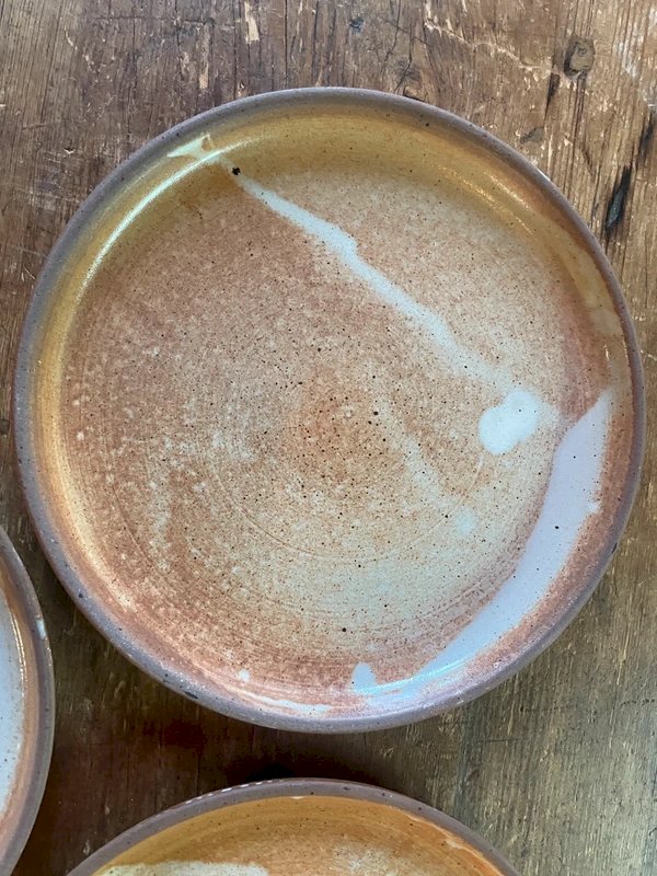 3 large vintage 70s glazed stoneware dinner plates Diameter 22.5cm Very good condition Includes a 4th plate with this lot (see the last two photos: small discreet chips but still usable)