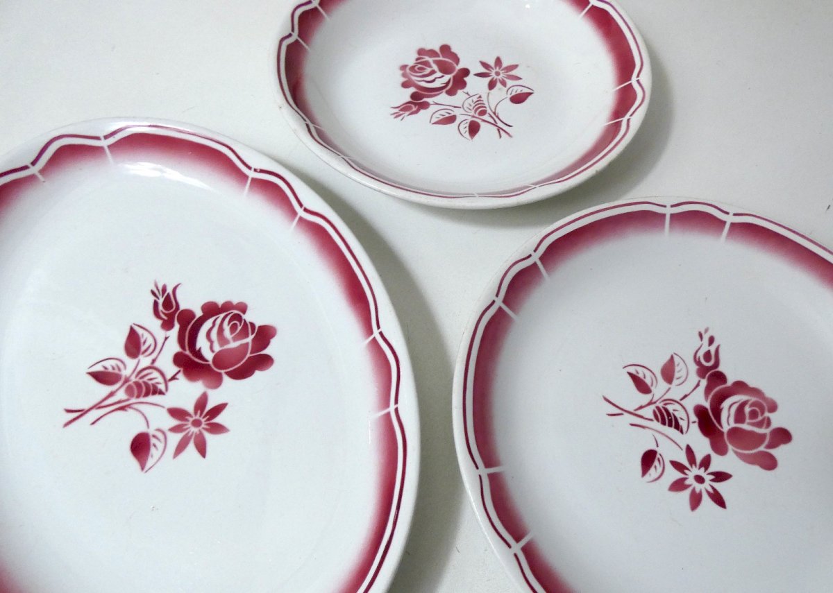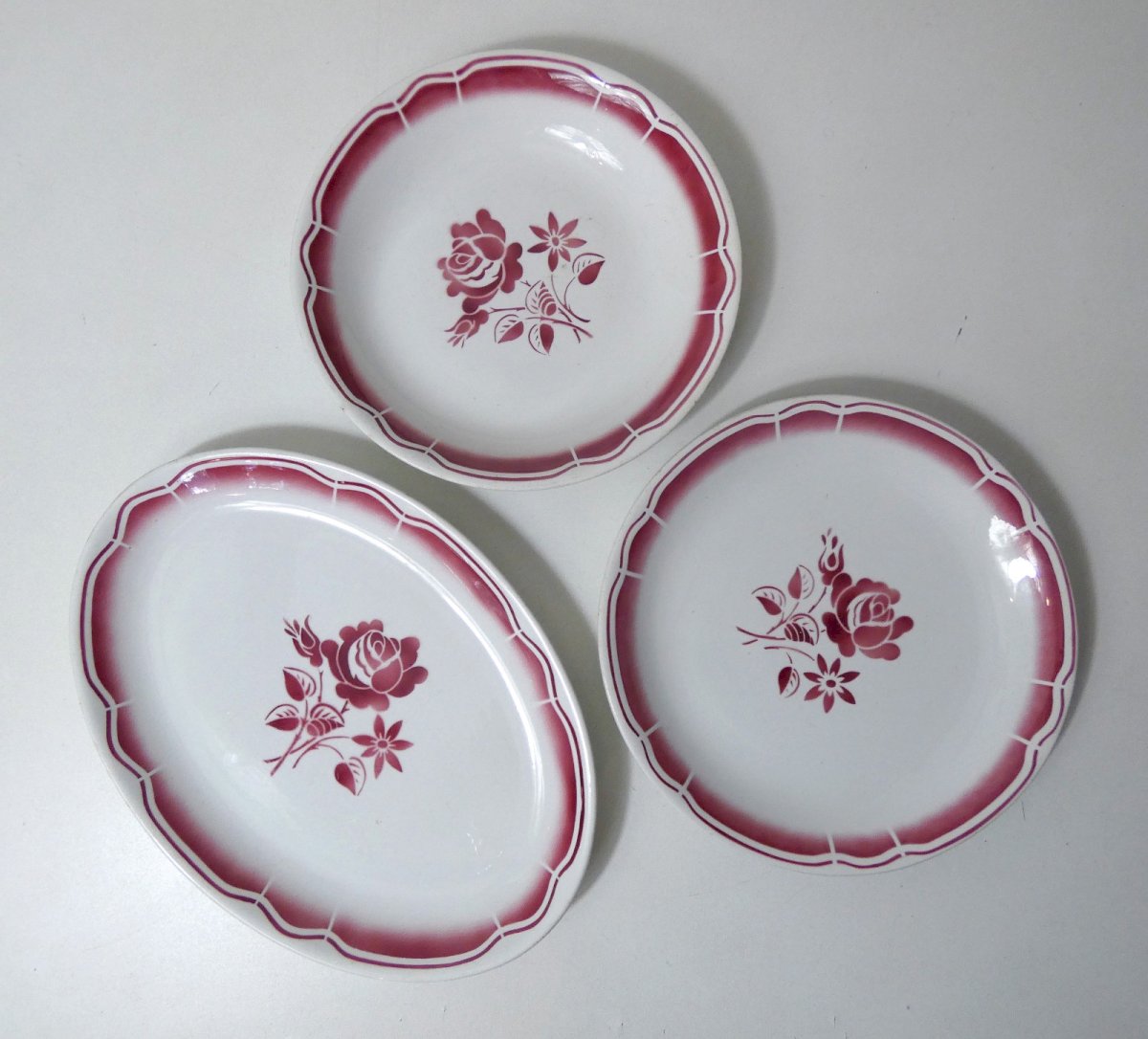 FB, Badonviller. 3 old earthenware dishes. Pink decor. - A shallow dish H. 4.5 cm D. 28 cm. - An oval dish H. 4 cm. 37 x 27 cm. - A pie/cake dish H. 3 cm. D. 29.5 cm. These dishes are in very good condition, with minor signs of use and superficial aging: some chipping around the edges, scratches or stains, underneath the pieces and not visible during use. Condition: Used item that has been used. Item showing some superficial signs of wear, fully functional and working correctly. It may be a display model or an item returned to the store after a short period of use. Any possible imperfections. Type: Serving plate Brand: Digoin Material: Ceramic