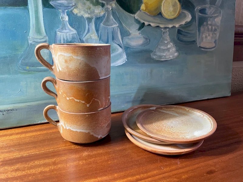3 large vintage stoneware tea or cocoa cups with their saucers in very good condition (Note a tiny chip of 0.5mm on one cup and a small imperfection under one saucer which is not visible from the top) Cups height approximately 7cm, diameter 10cm Saucer diameter 15.5cm