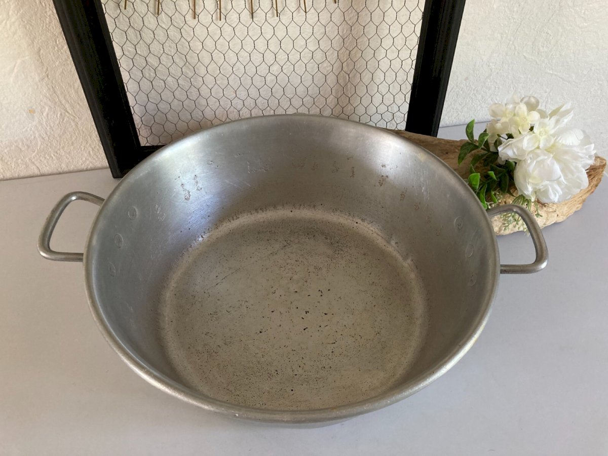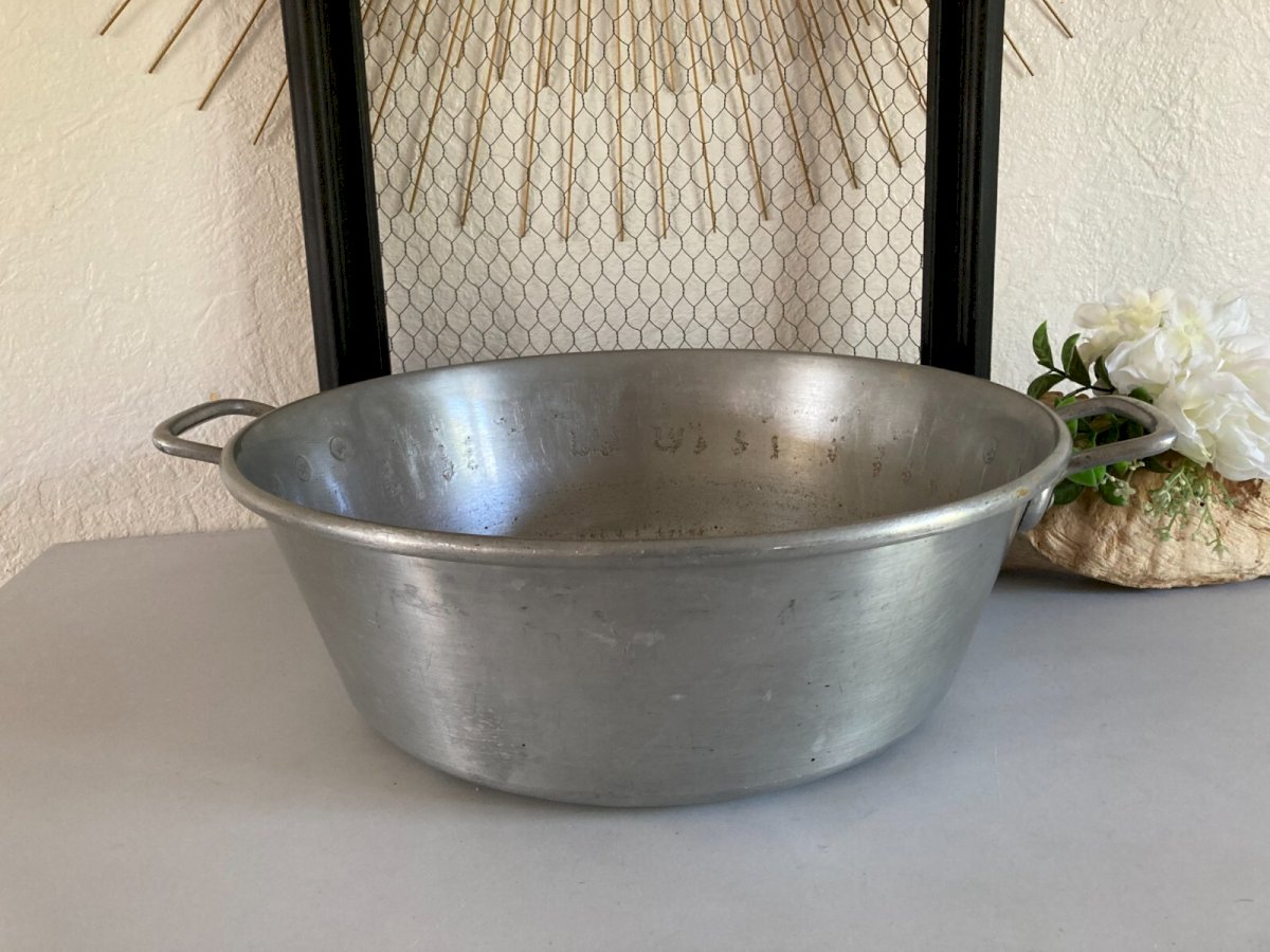 ⚜️ Vintage Large Aluminium Basin Tournus Unis France 36 ⚜️ Silver color Diameter 36 cm, Height 13 cm Condition: Used: Item has been used. Item shows some signs of superficial wear... Used: Item has been used. Item shows some signs of superficial wear, fully operational and functioning correctly. It may be a demonstration model or a product returned to the store after a short period of use. potential imperfections. Color: Silver Brand: Tournus Unis France Material: Aluminium Country of origin: France